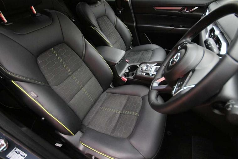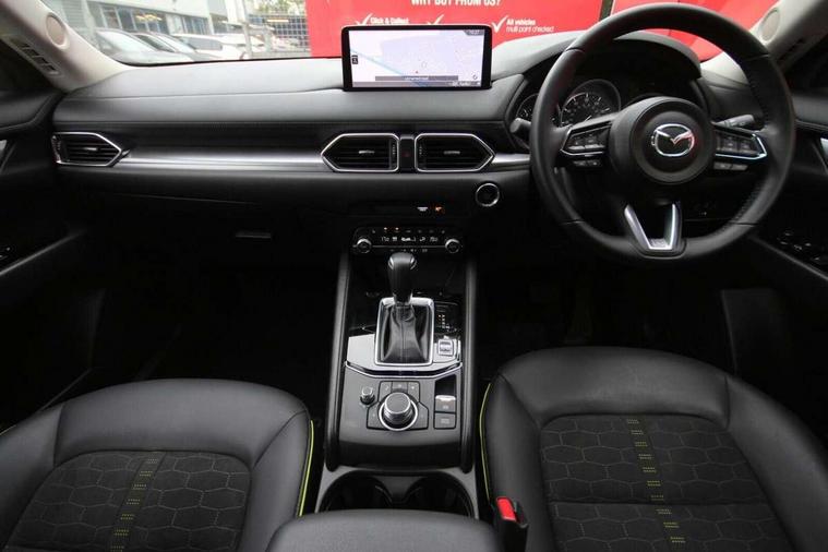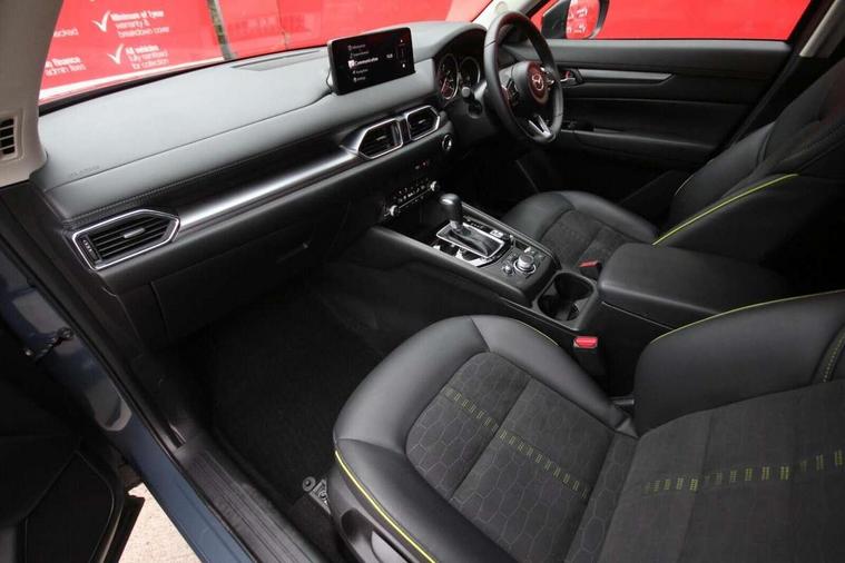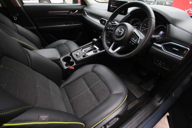 10.25" display with Mazda Connect infotainment, Advanced blind spot monitoring, Bluetooth connectivity with voice control, Collision prevention assist, Connected services, Cruising Traffic Support, Drive mode selector, Electric power steering, Emergency stop signalling system, Engine start/stop button, Forward collision warning, Front and rear parking sensors, High meter TFT display, Integrated navigation system, Intelligent speed assist, Lane departure warning system, Lane keep assist, Radar cruise control with Stop and Go, Rear cross traffic alert, Service indicator, Trip computer, Wireless apple car play/android Auto, Cylinder Deactivation, i-stop, 6 speakers, AM/FM radio, Bluetooth audio streaming, DAB Digital radio, Multimedia Commander including separate volume dial, Steering wheel mounted audio controls, Adaptive front lighting system, Auto dimming rear view mirror, Automatic headlights, Black mirror caps, Body colour roof spoiler, Body coloured front and rear black lower bumper mouldings, Coming/leaving home lighting function, Door mirror integrated indicators, Dual chrome tailpipes, Dusk sensitive headlamps, Electric front/rear windows with one touch auto up/down, Front and rear silver under garnish and side skirt, Front and rear silver under guard and side garnish, Front grille in material black finish, Front grille in satin finish with lime green accent + chrome signature wing, Gunmetal inlay dashboard panel, High beam assist, Intermittent rear wash/wipe, LED auto levelling, LED daytime running lights, LED front fog lights, LED Headlights, LED third brake light, Lime green front grille accent color, Louver bezel inner lime green accent, Power folding and heated door mirrors, Privacy glass (rear side windows only), Rain sensing front wipers, Rear side wing doors, Satin black B and C pillars, Satin black side mouldings, Scuff plates, Shark fin antenna, Signature LED rear combination lights, Variable intermittent front wash/wipe, Vinyl with lime green door trim panel, 12v electrical power outlet, 3 seat bench in 2nd row, 3 stage heated front seats, 40:20:40 Karakuri fold-flat seat system, 6 way power adjustable driver seat, Driver seat lumbar adjustment, Driver seat power slide, recline and height adjustment, Driver, Front passenger and two rear grab handles with coat hooks, Driver/passenger front seatback pockets, Driver/passenger sunvisors + illuminated vanity mirrors (drivers with ticket holder), Dual zone climate control, Folding centre armrest with 2 cup holders, Front and rear door pockets, Front centre storage with two cupholders, Front passenger seat manual slide, recline and height adjust, Height adjustable passenger seat, Humidity sensor, Illuminated glovebox, Interior dome light with integral spotlight, ISOFIX child seat anchorage points attached on outer rear seats, Karakuri tonneau cover, Leather wrapped steering wheel and gear knob, Leatherette door trim, Leatherette/suede upholstery, Light roof lining, Luggage compartment LED lighting, Luggage compartment power outlet, Rear air vents, Rear headrests, Rear seat recline, Reversible waterproof cargo board, Roof mounted sunglasses holder, Single front passenger seat, Standard air vents in silver, Three height adjustable head restraints, Tilt/height adjustable steering wheel, USB Connectivity (2x front Type-C, 2x rear Type-B), White interior LED illumination lighting, 3 point front seatbelts with pre-tensioners, 3 rear 3 point seatbelts, ABS, Advanced Smart City Brake Support - SCBS, Child locks on rear doors, Driver and front passenger side airbags, DSTC-Dynamic Stability and Traction Control, Dual front airbags, Electronic brake force distribution, Electronic parking brake with auto hold, ESP, Front and rear curtain airbags, Front passenger airbag deactivation, G-Vectoring control, Hill hold assist, Seatbelt reminder front and rear, Single stage passenger airbags, Smart brake support with forward obstruction warning, Tyre pressure monitoring system, Automatic door locking when moving off, Deadlock, Immobiliser, Power door locks, Remote central locking, Thatcham Cat.1 alarm, 19" diamond cut black alloy wheels, Tyre repair kit,