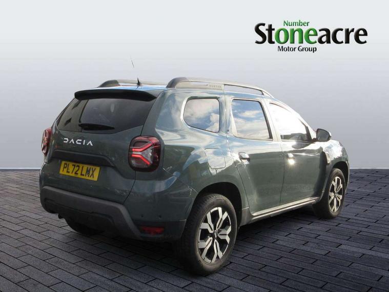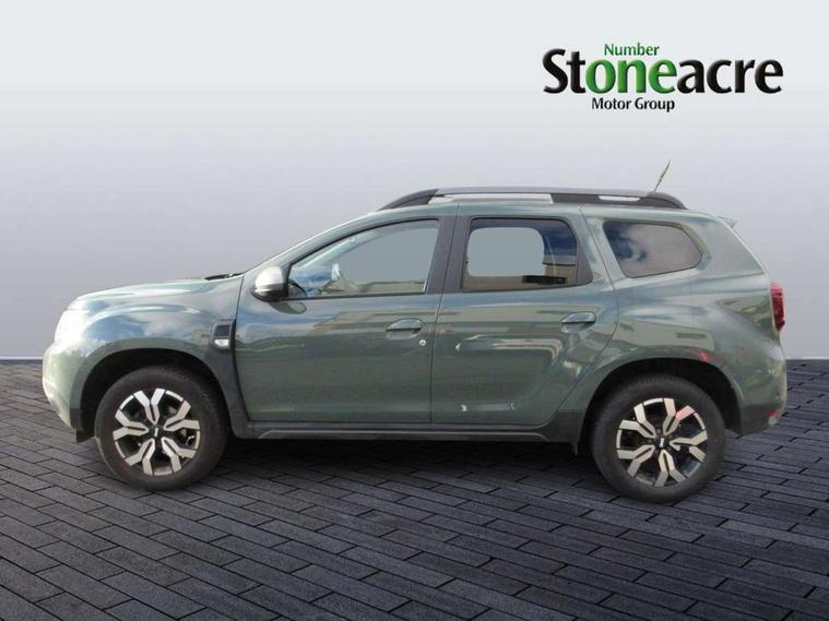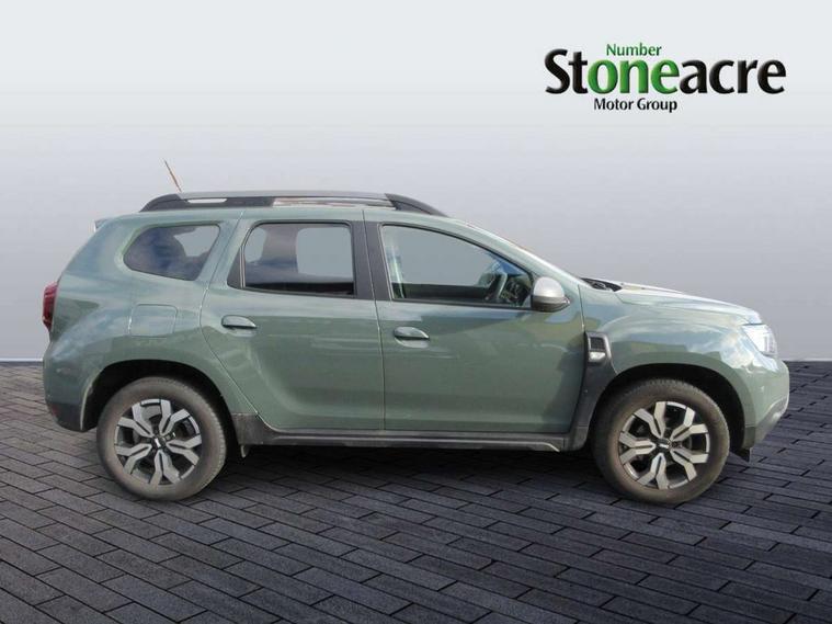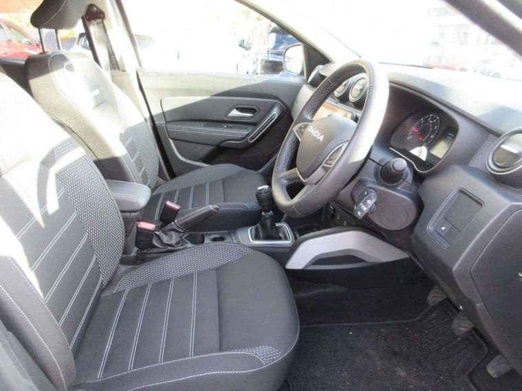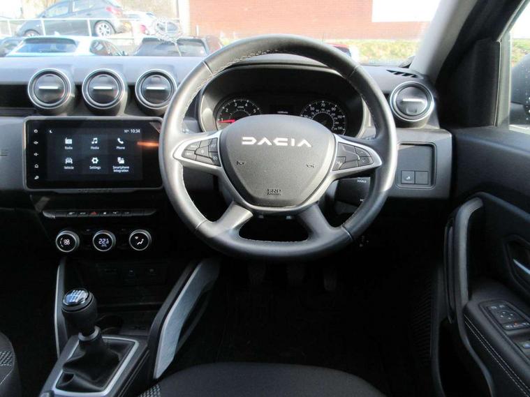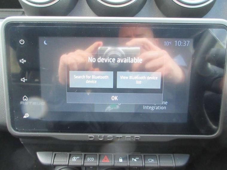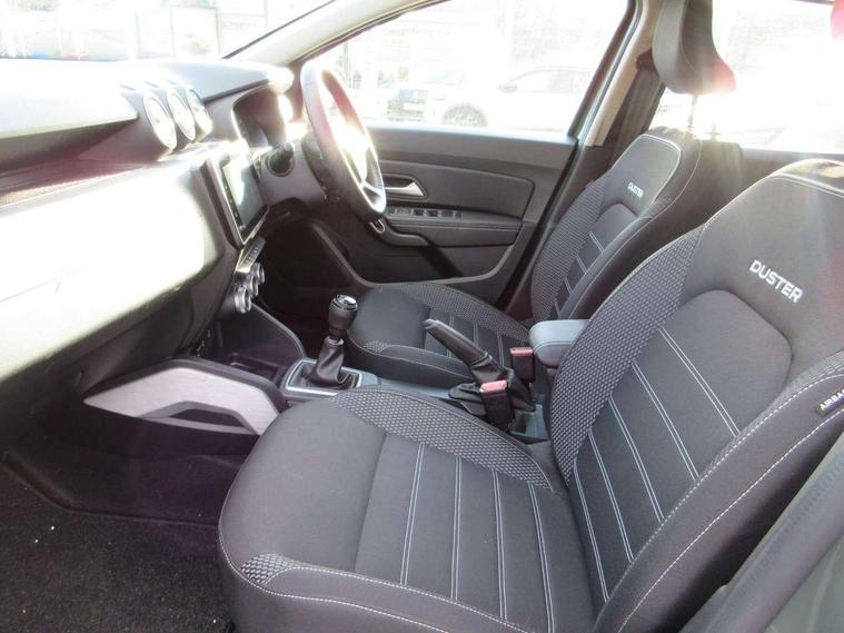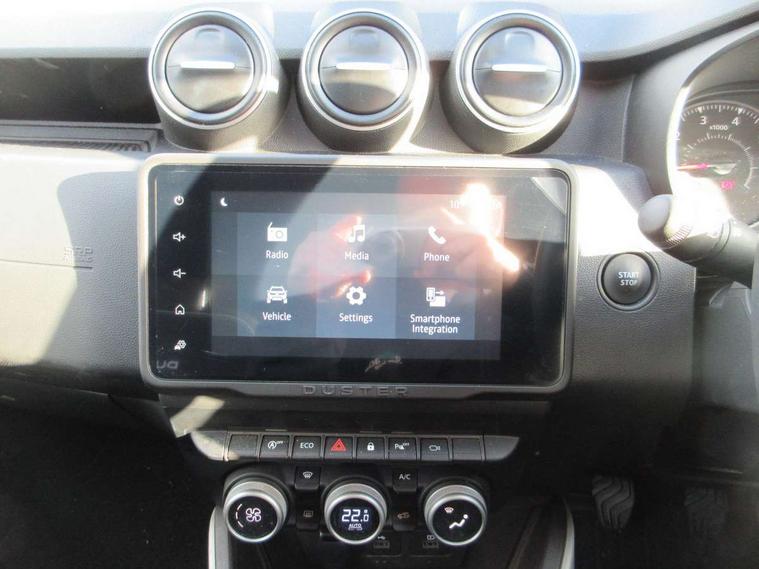 Blind spot warning, Cruise control and speed limiter, eCall emergency system, Eco mode, Electric power assisted steering, Multi view camera, On board computer, odometer, trip computer, average fuel consumption, average speed, service indicator, outside temperature gauge, Rear parking sensors and reverse camera, Rev counter, Stop/start system, 8" Media Navigation with wireless smartphone replication, Dacia plug and radio/MP3/USB/bluetooth/DAB/steering wheel control, 3 speed windscreen wipers, Acoustic windshield, Automatic front wipers, Black side sills, Black/satin chrome tailgate trim with Duster inscription in black background and lettering, Body coloured door handles, Chrome front grille with hot stamping, Chrome logo surround on steering wheel, Dark glass on lateral rear windows, Daytime running lights, Drivers window one touch up/down, Dusk sensor, Electric adjustable/heated door mirrors, Electric folding door mirrors, Electric front windows, Electric rear windows, Front and rear body coloured bumpers, Front door sill protection strip, Front fog lights, Grey quartz longitudinal roof bars with Duster inscription, Heated rear window, High level third rear brake light, Rain sensor, Rear side wing doors, Rear spoiler, Rear wash/wipe, Satin chrome door mirrors, Underbody protection skid plates, Y shaped LED headlights with rear LED lights, 3 rear height adjustable headrests, 3 seat bench in 2nd row, 60/40 split folding rear seat, Automatic air conditioning, Backlighted steering wheel buttons, Boot light, Driver seat lumbar adjustment, Fabric decorative insert on door panels, Fabric upholstery, Front head restraints, Front passenger reading light, Gear shift indicator, Glovebox light, Heated seats, Height adjustable driver seat, Height adjustable front and rear headrests, Height and depth adjustable steering wheel, High centre console with driver armrest, Isofix points for child seats in both outer rear seats, Map pocket on front seat backs, Passenger sunvisor with vanity mirror, Rear passenger reading light, Satin chrome gear lever cap insert, Satin chrome interior door handles, Satin chrome lower steering wheel insert, Single front passenger seat, Soft feel leather steering wheel, 3x3 point rear seatbelts, ABS and Emergency brake assist, ASR traction control with Electronic stability control, Child locks on rear doors, Door open visual and audible warning, Driver airbag, Driver and passenger seatbelt not fastened - visual and audible warning, EBD - Electronic brakeforce distribution, Front passenger airbag, Front passenger airbag deactivation, Front seatbelt pretensioners, Front side airbags, Height adjustable front seatbelts, Hill start assist, Tyre pressure monitor, Keyless entry, Remote central locking, Thatcham approved engine immobiliser, Charcoal grey central console surround, Matt black central console fascia, Piano black decorative insert on front door panels, Piano black decorative insert on rear door panels, Satin chrome air vent surround, 17" Alloy wheels,