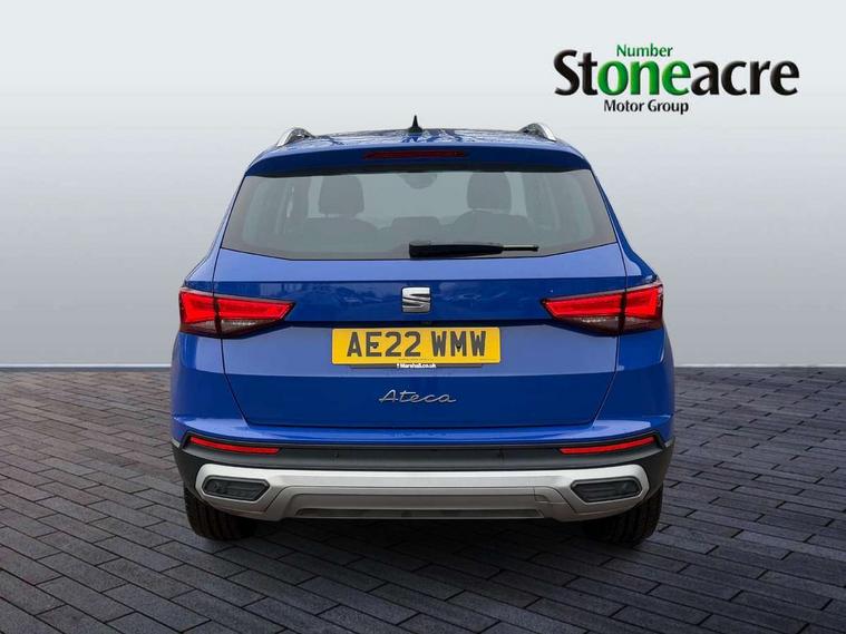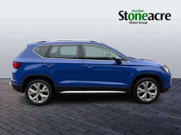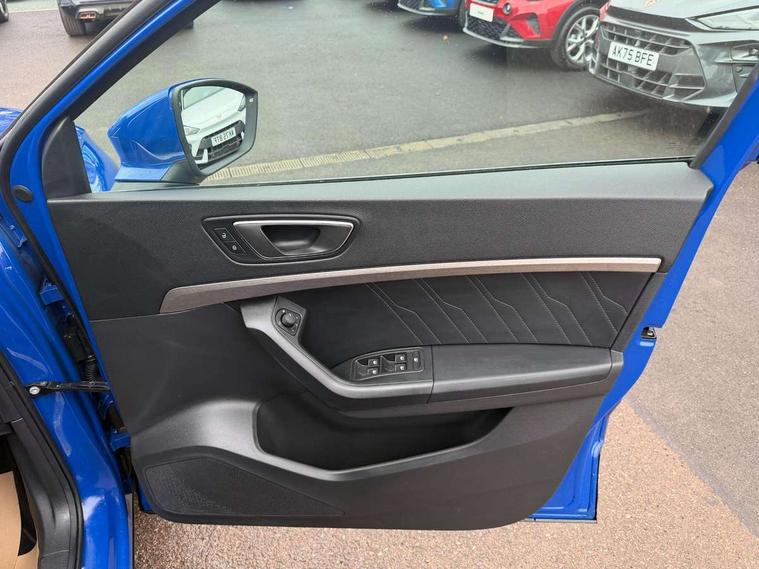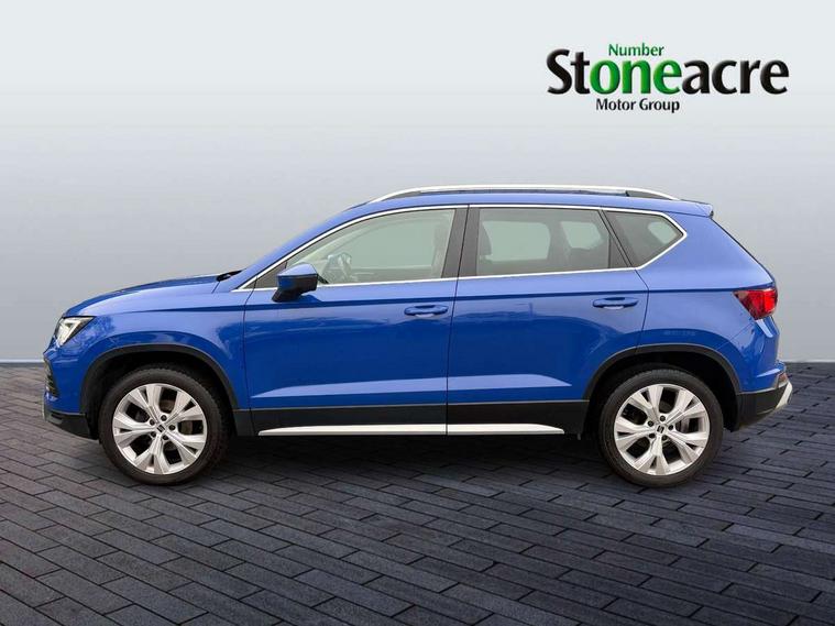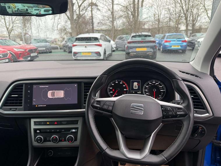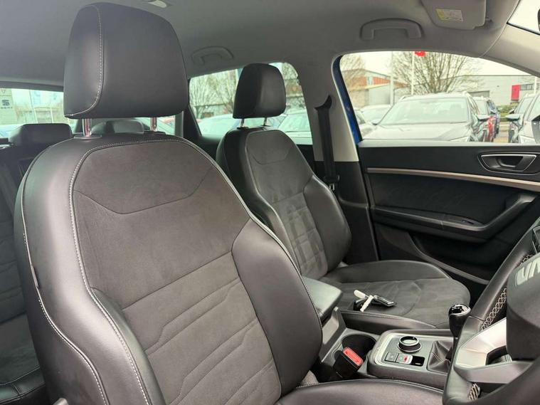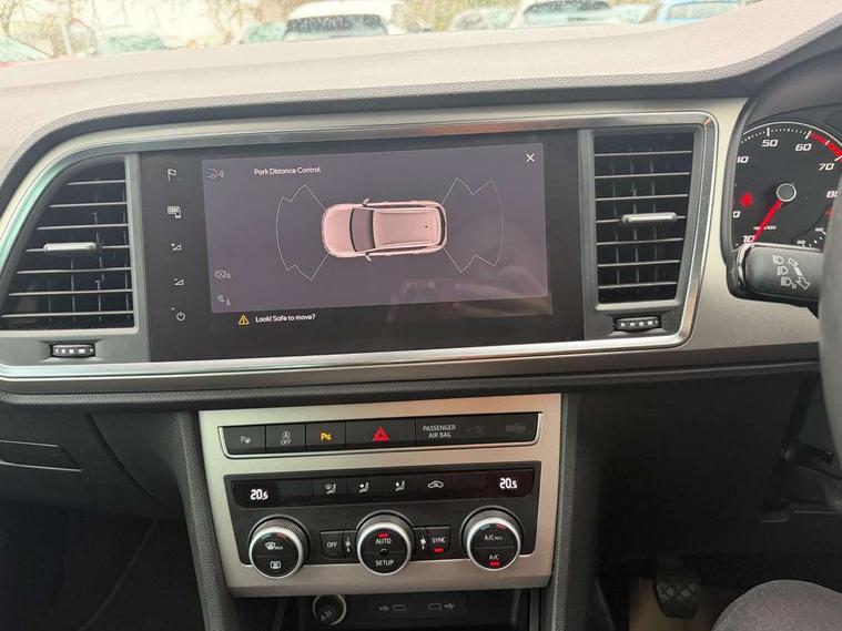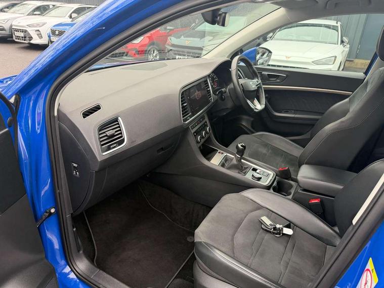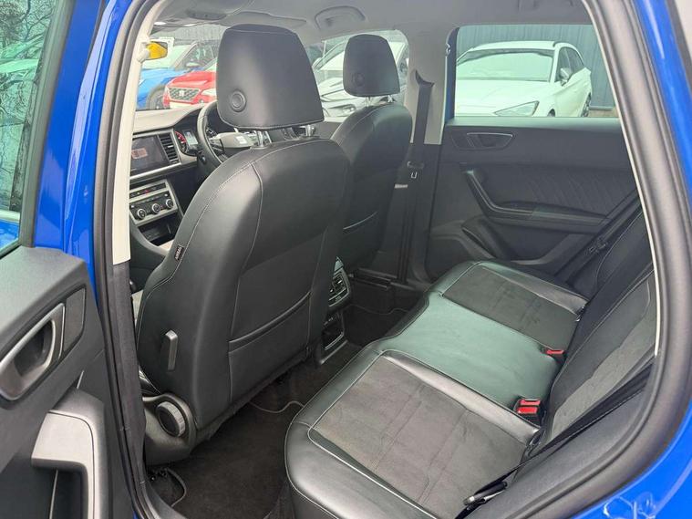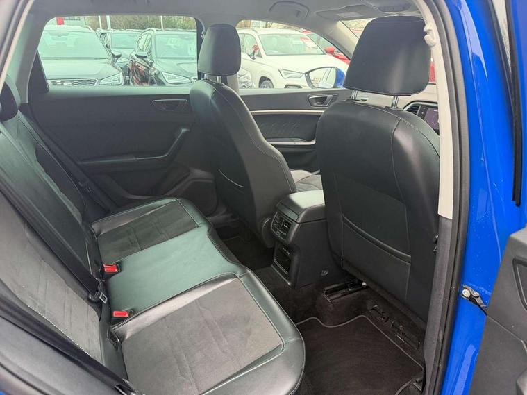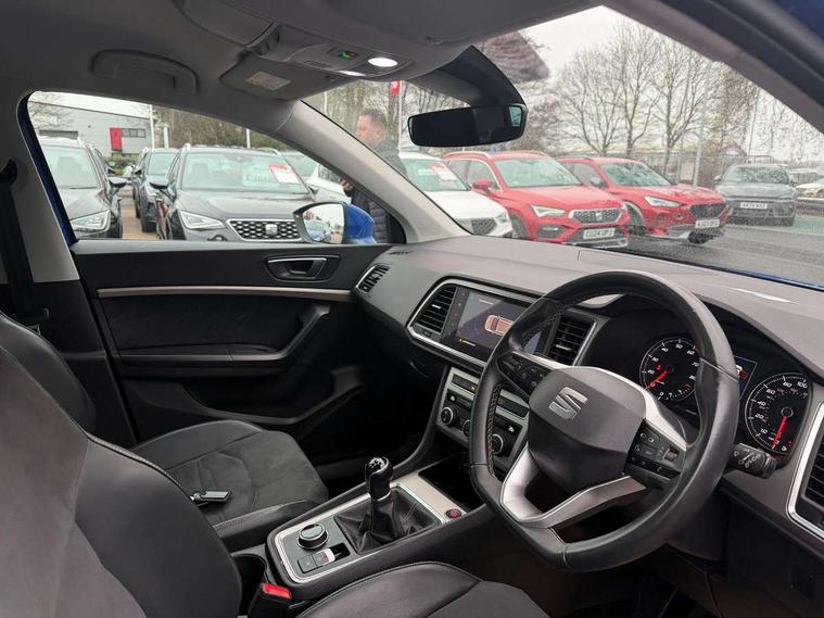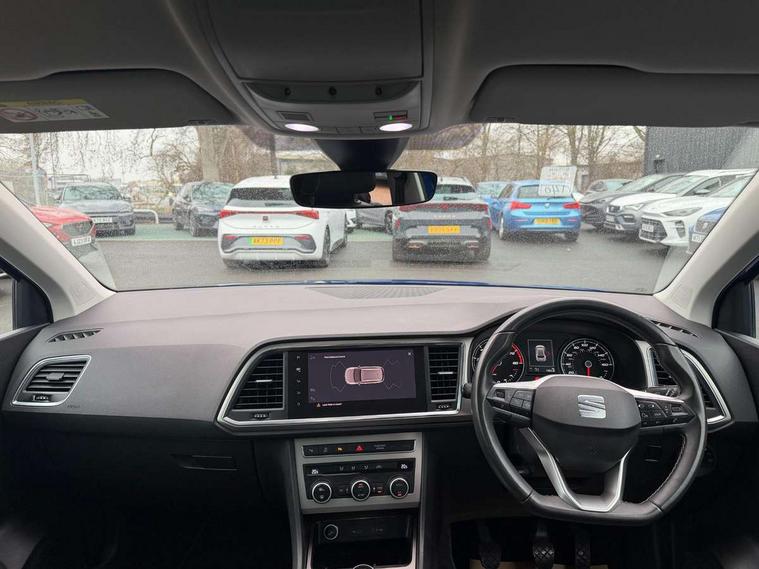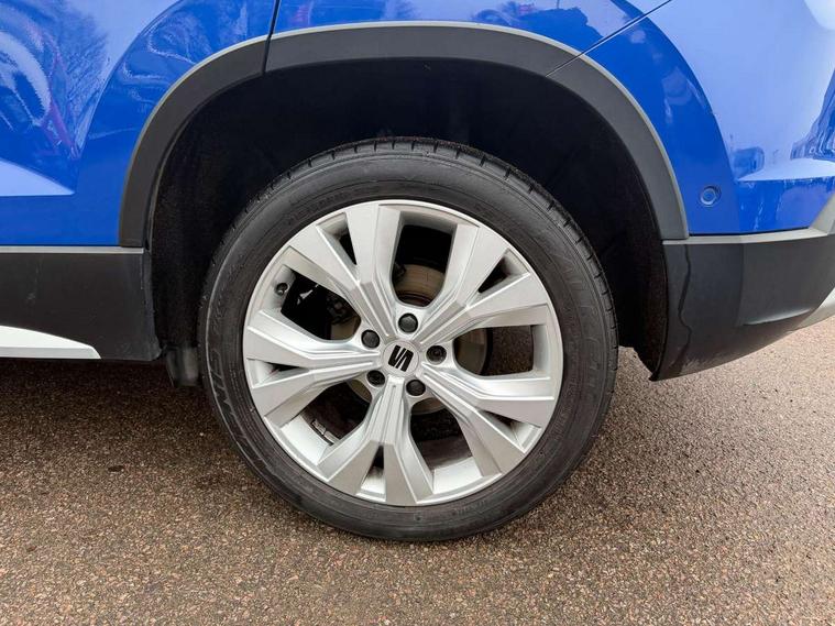 E-call, Outside temperature gauge, Progressive power assisted steering, Rear view camera, SEAT drive profile with driving experience button - Normal, Sport, Eco and Individual mode, steering and throttle response, Self parking functionality (includes front and rear parking sensors), Trip computer, Wireless full link smartphone integration, Wireless phone charger, Steering wheel mounted audio/phone controls, Black simulated exhaust pipes, Body colour bumpers, Body coloured wheel arch surrounds, Chrome front grille frame, Chrome roof rails, Chrome side window trim, Dark tinted rear windows, Daytime running lights, Door mirrors with welcome light silhouette, Dynamic headlight range control with self adjusting whilst driving, Electric adjustable/heated/folding door mirrors, Front and rear electric windows, Front grille hot stamping, Full LED headlamps with lens and LED front fog lamps with cornering function, Illuminated aluminium front door sill, LED rear tail lights with dynamic indicators, Rear fog lights, Rear side wing doors, Rear wash/wipe, Reflex silver side mouldings, 12V socket in front, 3 seat bench in 2nd row, 60/40 split folding rear seat, Dual zone climate control, Front and rear head restraints, Front centre armrest, Front seat back storage pockets, Height adjustable driver and passenger seat with lumbar adjustment, ISOFIX points in outer rear seats with top tether anchorage points, Leather steering wheel and gear knob, Microsuede upholstery with front comfort seats, Rear armrest and easy back seat release mechanism from boot, Single front passenger seat, Storage compartment under driver's seat, Convenience pack - Ateca, Interior lighting pack - Ateca, Navigation system pack with DAB - Ateca, Safe and driving pack - Ateca, 3x3 point rear seatbelts, ABS, Traction control system (TCS), Electronic stability control (ESC) and Electronic differential lock system (XDS), Airbags - Driver and front passenger airbag with deactivation, front side, two curtain and driver's knee airbags, Electric parking brake with auto hold function, Front and rear seatbelt reminder, Hill hold control, Manual rear child locks, Tiredness recognition system, Traction control, Tyre pressure monitoring system, Alarm, Keyless entry, Locking wheel bolts, Chrome interior detailing, 18" Brillaint silver alloy wheels,
