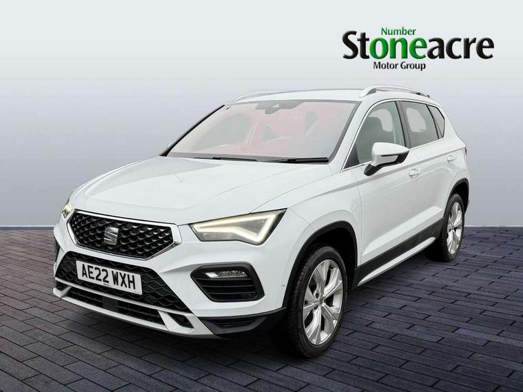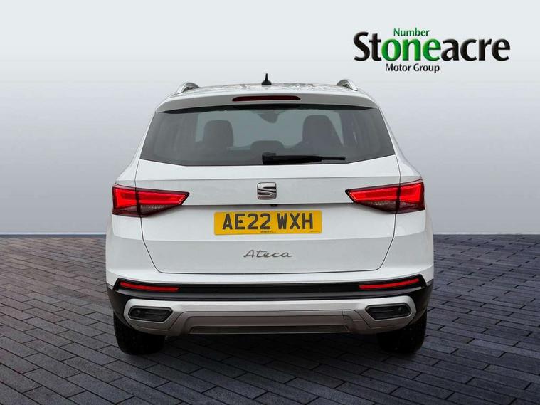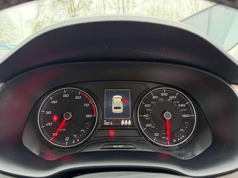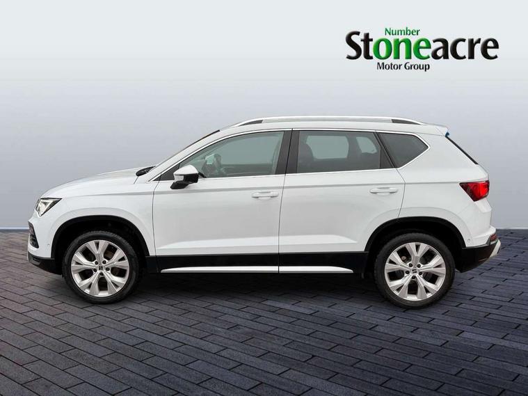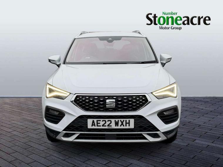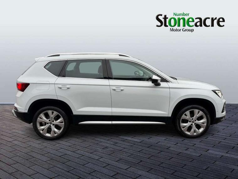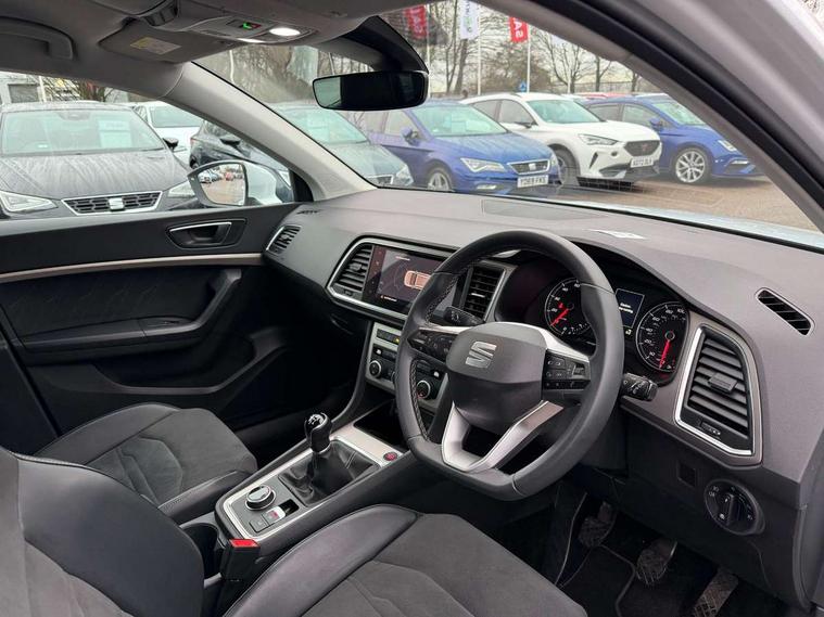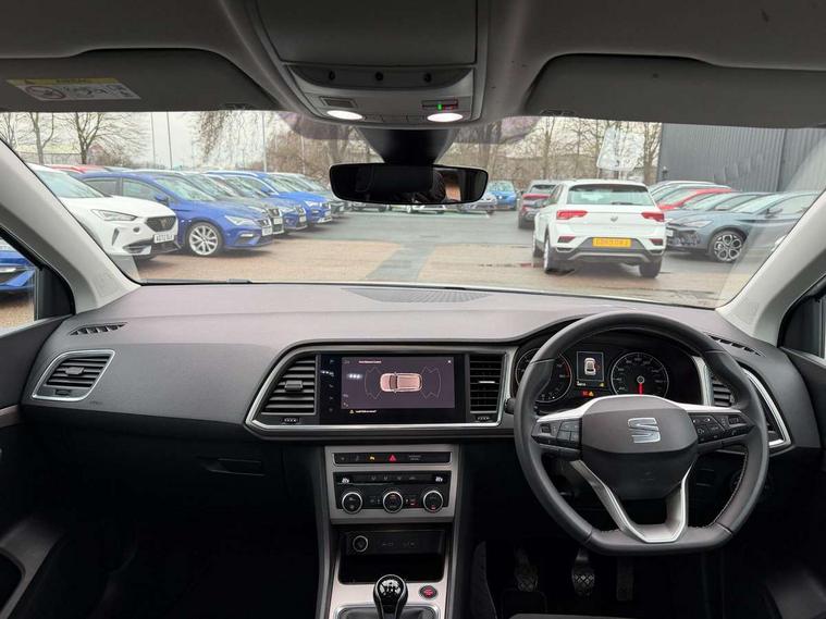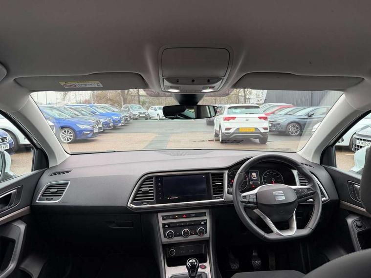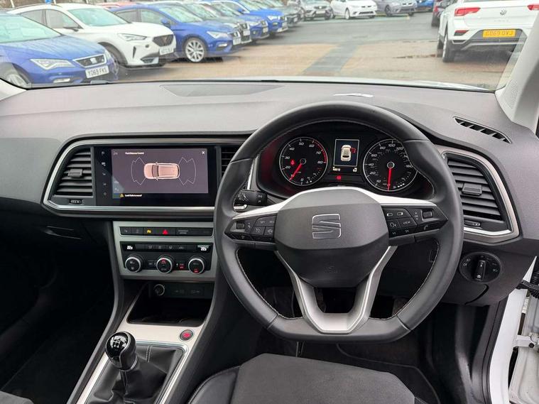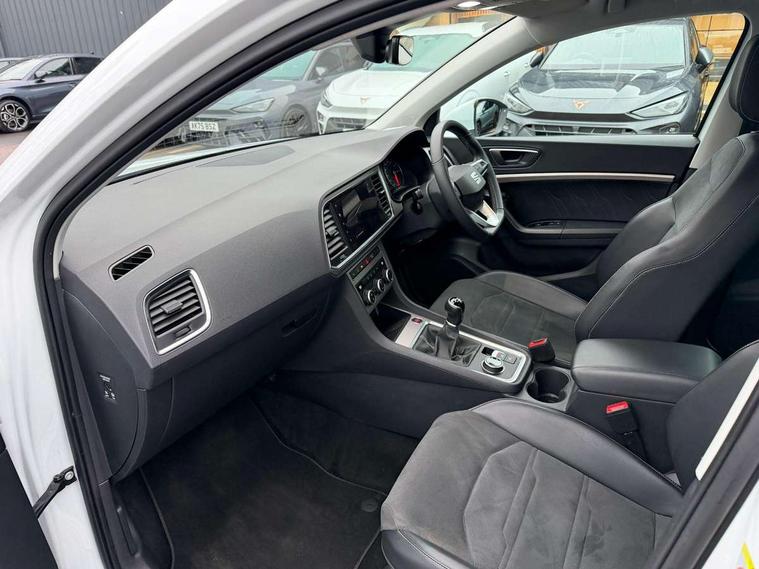 E-call, Outside temperature gauge, Progressive power assisted steering, Rear view camera, SEAT drive profile with driving experience button - Normal, Sport, Eco and Individual mode, steering and throttle response, Self parking functionality (includes front and rear parking sensors), Trip computer, Wireless full link smartphone integration, Wireless phone charger, Steering wheel mounted audio/phone controls, Black simulated exhaust pipes, Body colour bumpers, Body coloured wheel arch surrounds, Chrome front grille frame, Chrome roof rails, Chrome side window trim, Dark tinted rear windows, Daytime running lights, Door mirrors with welcome light silhouette, Dynamic headlight range control with self adjusting whilst driving, Electric adjustable/heated/folding door mirrors, Front and rear electric windows, Front grille hot stamping, Full LED headlamps with lens and LED front fog lamps with cornering function, Illuminated aluminium front door sill, LED rear tail lights with dynamic indicators, Rear fog lights, Rear side wing doors, Rear wash/wipe, Reflex silver side mouldings, 12V socket in front, 3 seat bench in 2nd row, 60/40 split folding rear seat, Dual zone climate control, Front and rear head restraints, Front centre armrest, Front seat back storage pockets, Height adjustable driver and passenger seat with lumbar adjustment, ISOFIX points in outer rear seats with top tether anchorage points, Leather steering wheel and gear knob, Microsuede upholstery with front comfort seats, Rear armrest and easy back seat release mechanism from boot, Single front passenger seat, Storage compartment under driver's seat, Convenience pack - Ateca, Interior lighting pack - Ateca, Navigation system pack with DAB - Ateca, Safe and driving pack - Ateca, 3x3 point rear seatbelts, ABS, Traction control system (TCS), Electronic stability control (ESC) and Electronic differential lock system (XDS), Airbags - Driver and front passenger airbag with deactivation, front side, two curtain and driver's knee airbags, Electric parking brake with auto hold function, Front and rear seatbelt reminder, Hill hold control, Manual rear child locks, Tiredness recognition system, Traction control, Tyre pressure monitoring system, Alarm, Keyless entry, Locking wheel bolts, Chrome interior detailing, 18" Brillaint silver alloy wheels,