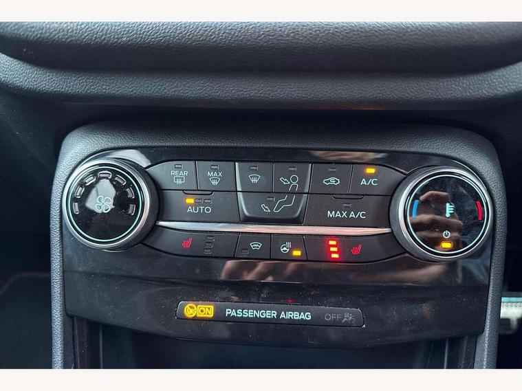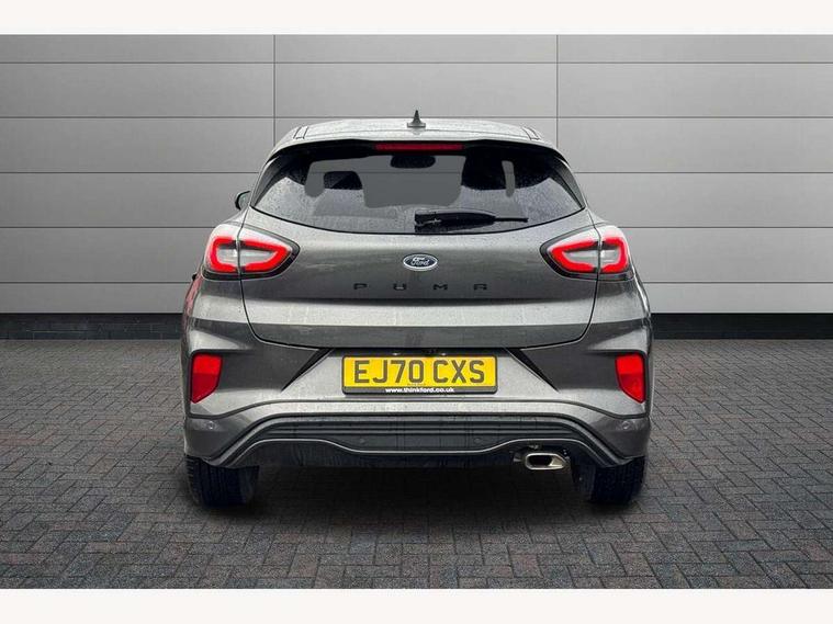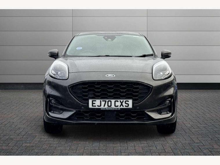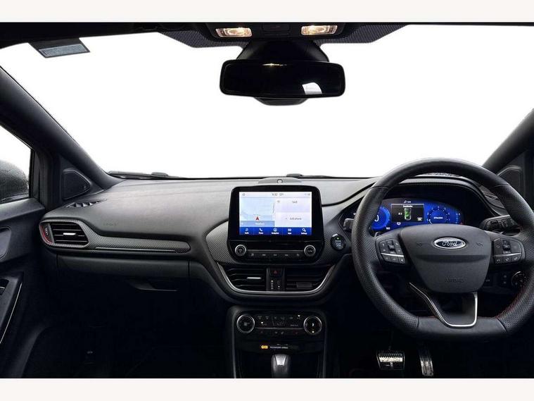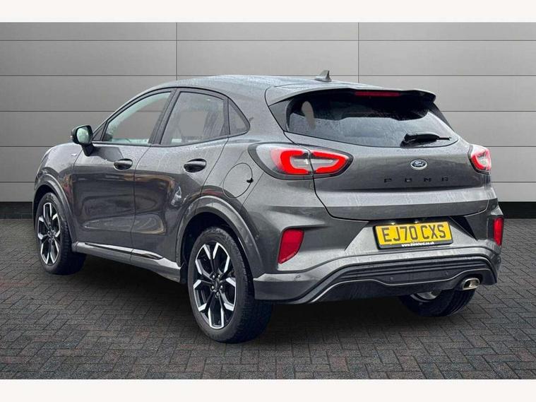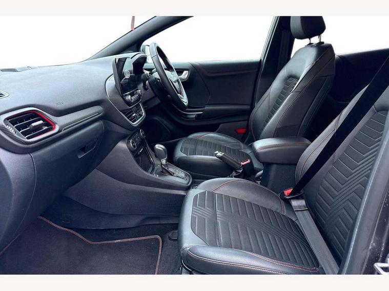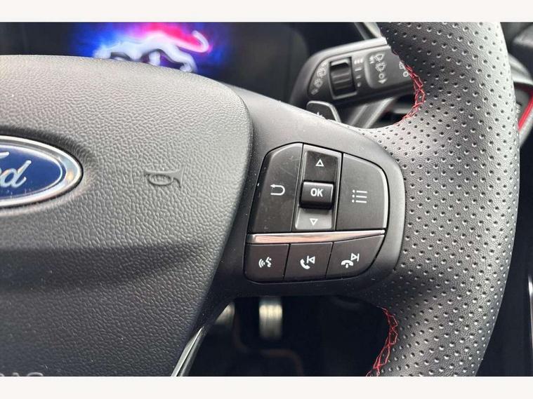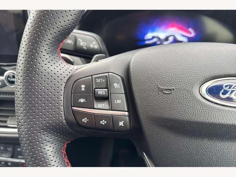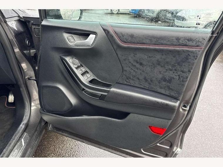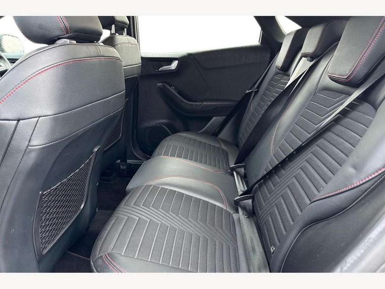 Ford easy fuel, Full digital 12.3" instrument cluster, Lane keeping aid with lane departure warning, Power assist steering, Rear parking sensor, Selectable drive modes(Normal, Eco, Sport, Slippery and Trail), Wireless charging pad, Automatic headlights with rain sensing wipers and auto high beam, Body coloured door mirrors, Front fog lights with cornering lights and LED rear lamps, Power foldable heated door mirrors with puddle lamps, Privacy glass to side rear windows and tailgate glass, Quickclear heated windscreen, Rear wiper, ST-Line body kit with large rear spoiler wth sports suspension, Centre console with armrest and stowage, Driver and passenger seat lumbar and height adjust, Ford megabox extended bootspace, Front and rear floor mats, Front and rear head restraints, Manual air conditioning, Sensico partial premium upholstery, ST-Line flat bottomed sensico leather steering wheel with leather handbrake, B&O Premium Audio system + Ford SYNC 3 navigation pack - Puma, 3 rear seatbelts, Electronic stability control (ESC) and hill start assist, Pre-collision assist with autonomous emergency braking, pedestrian/cyclist detection & post-collision braking, Tyre pressure monitoring system (TPMS), Thatcham alarm, Carbon look interior deco spears,