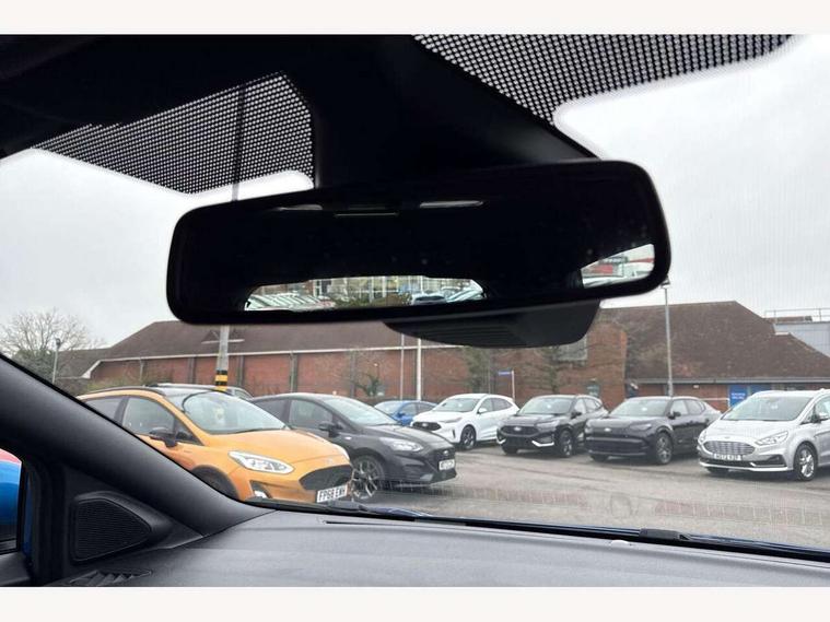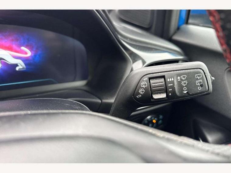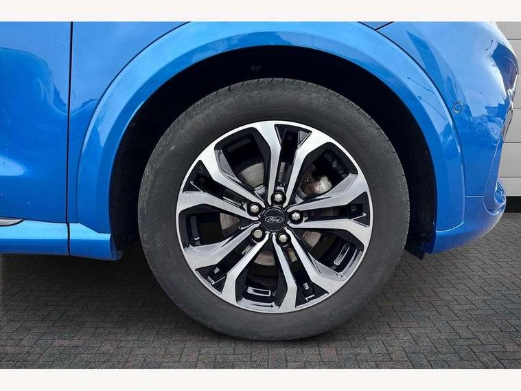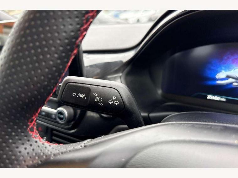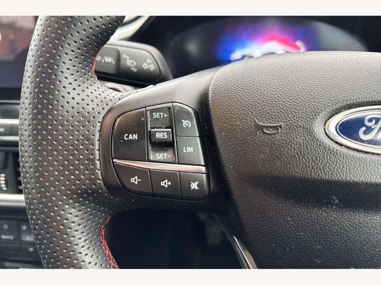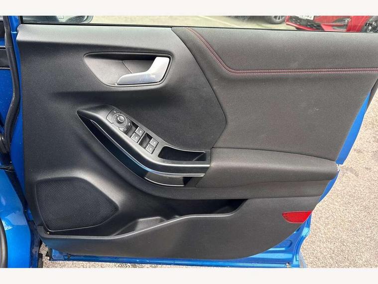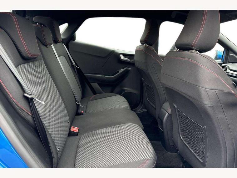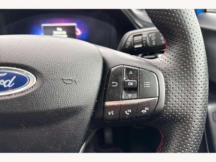 Driver impairment monitor, Emergency call service, Ford easy fuel, Full digital 12.3" instrument cluster, Lane keeping aid with lane departure warning, Power assist steering, Power start button, Rear parking sensor, Selectable drive modes(Normal, Eco, Sport, Slippery and Trail), Speed sign recognition, Sport suspension, Automatic headlights with auto high beam, Automatic rain sensing wipers, LED rear lamps, Power foldable heated door mirrors with puddle lamps, Projector headlamps with LED day time running lights and front fog lamps, Quickclear heated windscreen, Rear side wing doors, Rear wiper, ST-Line body styling kit with unique grille and large body colour rear spoiler, Third brake light, 3 seat bench in 2nd row, Centre console with armrest and stowage, Ford megabox extended bootspace, Front and rear head restraints, Front floor mats, Manual 2 way passenger seat adjustment, Manual 4 way driver seat adjust with lumbar adjustment, Single front passenger seat, ST- Line cloth trim with red stitching, ST-Line flat bottomed sensico leather steering wheel with leather handbrake and aluminium gear knob, Ford SYNC 3 navigation pack - Puma, 3 rear seatbelts, Child safety lock, Electronic stability control (ESC) and hill start assist, Pedestrian/cyclist detection & post-collision braking, Pre collision assist system, Tyre pressure monitoring system (TPMS), Thatcham alarm,