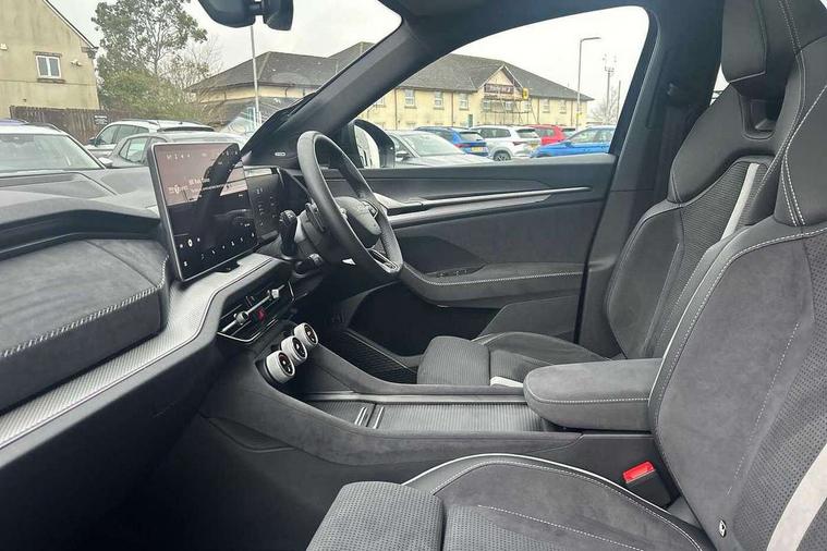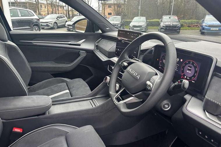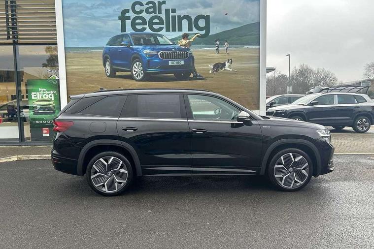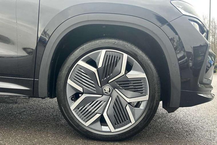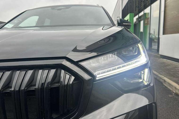 13" satellite navigation touchscreen display, Blind spot detection with door exit warning, Bluetooth system, ChatGPT functionality, Driver alert - Fatigue and drowsiness monitor, Dry display cleaner, Emergency call, Front and rear parking sensors, Front cross traffic assist, Lane assist, Off road modes, PAS, Rear traffic assist, Tailgate unlocking from outside, Traffic sign recognition, USB C Port x 2 in front centre console, Virtual Cockpit - 10.25" digital display, Voice control system, Wireless charging for two smartphones (15W) with cooling function, Wireless SmartLink for Apple CarPlay and Android Auto, Stop/start function, 2x USB-C in the rear, DAB Digital radio, Aero front windscreen wipers with intermittent function, Auto dimming rear view mirror, AWL (all weather lighting) and all weather light with cornering function, Black diffuser and decorative tailpipe with a unique dark chrome finish, Black roof rails, Black sports styling including front grille and window surrounds, Black wheel arch surrounds, Body colour door handles, Cornering light and poor weather light, Electric folding /adjustable/separted heated/folding door mirrors, auto dimming with boarding sports and memory function, Electric front and rear windows, Exterior black decorative trims, Front and rear sports bumpers including lower rear chrome strip, Gloss black door mirrors, Gloss black window frame and D pillar, Heat insulating glass in windshield, Heated rear window, Ice scraper in fuel tank cap, LED daytime running lights, LED third brake light in rear spoiler, Light assistant with automatic headlight control and coming home feature, Logo projection in door mirrors, Privacy glass, Rear roof spoiler, Rear side wing doors, Rear window wiper, Red decorative strip between rear LED lights, Safety reflectors on front and rear doors, Sportline badge on front fenders, Tailgate lettering in Black, Unique dark chrome design logo on alloy wheels, Window control switches with black trim, Windscreen wipers with rain sensor, Without engine designation, 1.5l bottle holder points in all door, 1x centre rear reading light, 2 seat bench in 3rd row, 3 configurable smart dials with 32mm coloured display, 3 seat bench in 2nd row, 4 foldable roof handles with rear coat hooks, Aluminium pedals, Ambient interior lighting - Dashboard, front-door stowage compartments, front and rear door panels and footwell lighting, Automatic gear selector on steering column, Chrome interior door handles, Driver/front passenger reading lights, Fabric headlining, Fixed bench 40:60:40 split folding backrests, Front and rear floor mats, Front centre armrest with jumbo box storage compartment, cup holder and 12V socket, Front sport seats, Height adjustable front headrests, Interior black decorative trims, Isofix child seat fittings in outer middle row rear seats and front passenger with top tether, Manually adjustable steering column, Pollen filter, Rear centre armrest with cupholders, Rear seat boot backrest release, Single front passenger seat, Skoda lettering on steering wheel, Storage pocket including mobile phone pockets on the backs of the front seats, Sunvisors with illuminated vanity mirrors, Three rear height adjustable headrests, Ticket holder on A Pillar, Tri zone climate control, Umbrella in door panel x1 made from sustainable materials, Upper and lower glovebox with card holder and coin compartment, USB C port by rear view mirror for charging only (15W), Acoustic package - Kodiaq, Performance package - Kodiaq, Sportline design selection pack - Kodiaq, Auto door release and activation of warning lights in the event of an accident, Driver and front passenger airbag with knee airbag and front passenger airbag deactivation, Electric child locks, Electronic parking brake, ESC (incl. ABS+EMD+MSR+ASR+EDL+HBA+DSR+RBS+ESBS+MCB+TSA+XDS), Front assist with braking reaction to vehicles, pedestrians and cyclists, Front disc brakes, Fuel cut off safety device, Height adjustable front 3 point seatbelts + pretensioners, Hill hold assist, Junction assist with automatic emergency braking, Rear disc brakes, Safety vest holder in door, Seat belt reminder for all seats, Three point rear seat belts, Two tone horn, Tyre pressure monitor, Alarm with interior monitoring and tilt sensor with safe function, Anti-theft wheel bolts, Immobiliser, Remote central locking with 2 keys, 20" Rila anthacite polished alloy wheel with black matte aero covers,