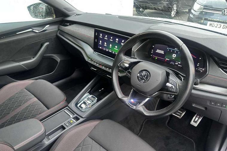 1x USB Type C port in rear view mirror (charging only), 2x USB Type C ports in rear of front centre armrest (charging only), Bluetooth system, Columbus satellite navigation with 10" touchscreen display, Driver fatigue sensor, eCall emergency system, Front and rear parking sensors with manoeuvre assist, Front assist system, Progressive dynamic steering, Speed limiter, Turn Assist, Virtual Cockpit - 10.25" digital display, Virtual pedal with electrically operated boot door (Rear LED lights (high functionality), dynamic indicators, Voice control system, Wireless SmartLink for Apple Car Play, Front and rear stabilizers, 2x USB Type C ports (for charging and data transfer), 8 Speakers, DAB Digital radio, Aero front windscreen wipers with intermittent function, Auto dimming rear view mirror, Body colour door handles, Chrome exhaust tailpipes, Door sills with vRS logo, Electric front and rear windows, Exterior gloss black sports styling including front grille, side strip, window surrounds, door mirror and badging, Full LED Matrix headlights with AFS, rear LED lights (high functionality) and dynamic indicators and cornering front fog lights, Headlight washers, Heated rear windscreen, High level third brake light, Ice scraper in fuel cap, LED daytime running lights, Rain and light sensors, Rear fog light on one side, Rear privacy glass, Rear side wing doors, vRS bumpers and lip spoiler, 3 rear headrests, 3 seat bench in 2nd row, 4 foldable roof handles, Aluminium pedals, Black headlining, Black microsuede padded dash panel with red contrast stitching, Chrome inner door handles, Front centre armrest, Front head restraints, Heated front seats, Illuminated glovebox, Leather trimmed gearshift lever, Luggage compartment lighting x1 light, Mechanical rear seat release, Parcel shelf - folding, Single front passenger seat, Sunglasses storage, Textile floor mat set, Three spoke leather sports multifunction steering wheel with paddles, Ticket holder, Umbrella in door panel, Unsplit rear bench seat and split folding backrest, LED interior light pack - Octavia, 3 point front/outer rear seatbelts+pre-tensioners, Alarm with interior monitoring, tilt sensor and back up horn, Automatic door unlocking in case of crash, Automatic fuel cut off in case of crash, Automatic warning lights in case of emergency braking, Curtain airbags and front side airbags, Driver and front passenger airbags, Drivers knee airbag, Electronic parking brake, ESC including ABS, EBV, MSR, ASR, EDS, HBA, DSR, Front and rear disc brakes, Front central airbag, Hill hold control, Hill start assist, ISOFIX on front passenger seat and outer rear seats, Manual rear child locks, Passenger airbag deactivate switch, Pro active services, Red brake calipers, Two tone horn, Tyre pressure monitor, Visual and acoustic seat belt reminder, Warning reflectors in front door, Door locks with immobiliser, Keyless entry and start/stop including rear doors, Remote central locking, Carbon optic decorative inserts, Gloss black air vent surrounds, 19" Altair anthracite alloy wheels,