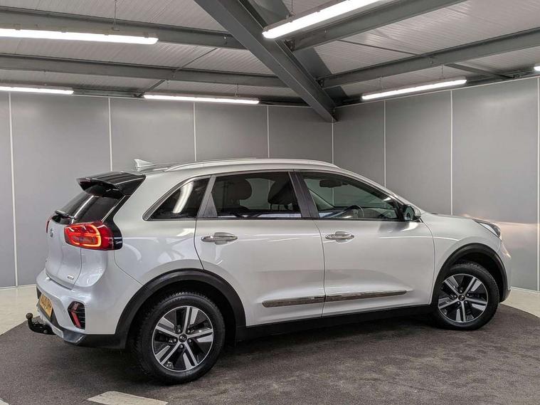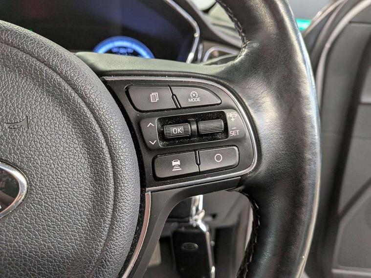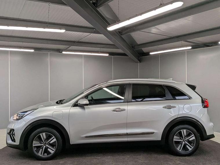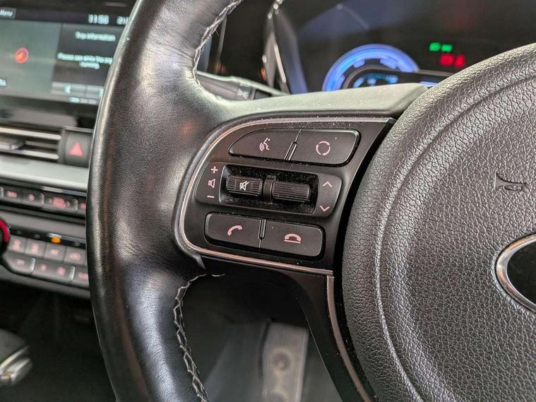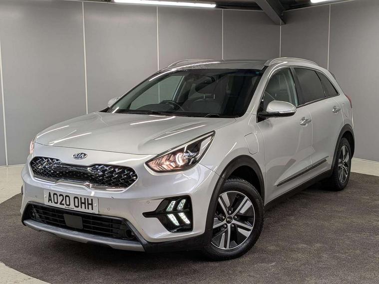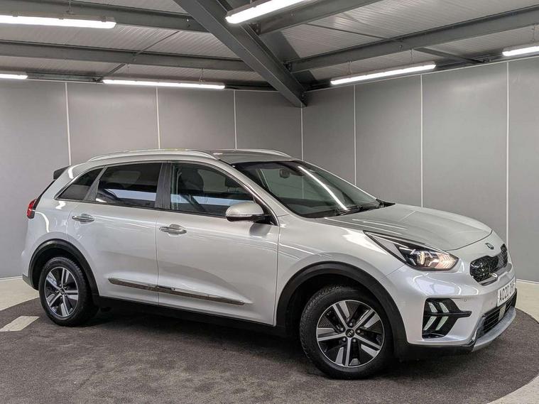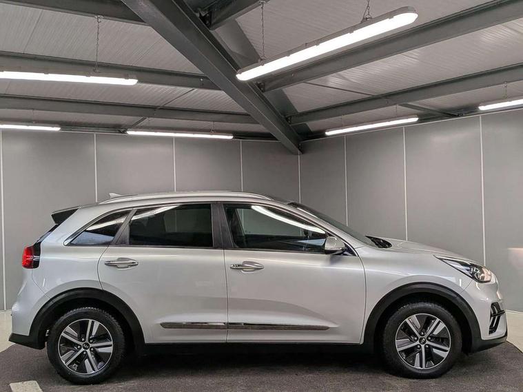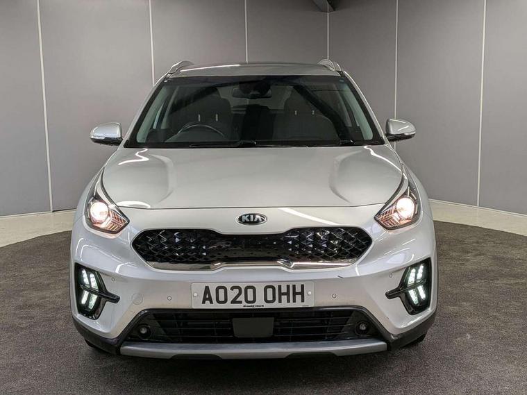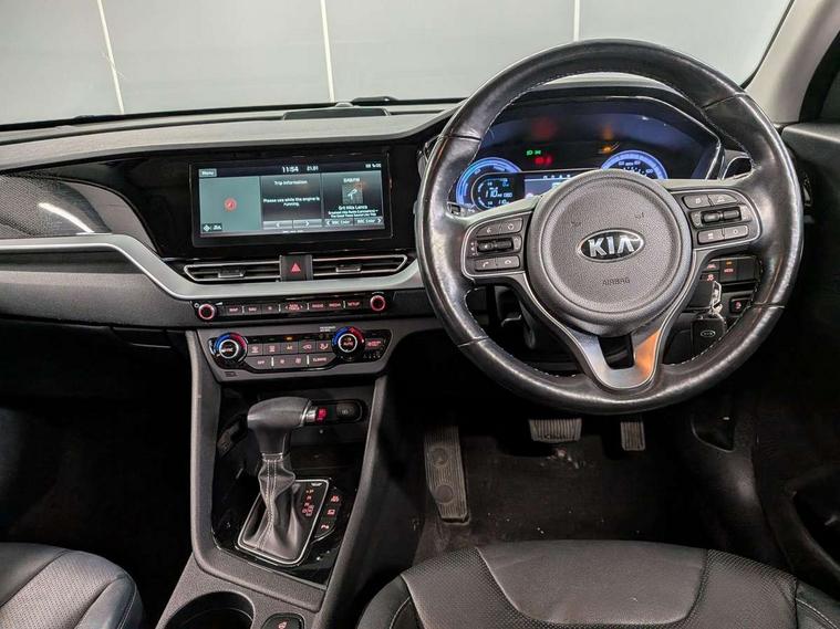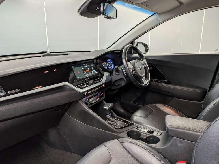 10.25" Touch screen satellite navigation with european mapping and traffic messaging channel, Adaptive smart cruise control function (SCC) with stop and go, Apple car play/Android Auto with voice control, Digital clock, Drive mode selector, Driver attention warning, Emergency stop signalling system, Forward collision avoidance assist, Front parking sensors, Kia connected services featuring TomTom live, Lane Following Assist (LFA), Lane keep assist, Motor driven power steering, Rear parking sensors, Reversing camera, Speed limiter, Telematics system with UVO connect services, Trip computer with distance/fuel consumption/average speed, Wireless Smartphone charger, 'Shark fin' mobile antenna, 4.2" supervision cluster with TFT colour display, 6 speakers, Bluetooth with music streaming, DAB Radio with MP3, Steering wheel mounted controls, USB connection located in centre console, USB port, All round electric windows with drivers and front passenger auto up/down function, Auto dimming rear view mirror, Automatic defog system, Automatic headlight control system, Black side sills, Body colour bumpers, Body coloured/high gloss door mirrors, Chrome beltline mouldings, Chrome door handles, Driver's side wide angle mirror, Electrically folding/adjustable/heated door mirrors with LED indicators, LED daytime running lights, LED fog lights, LED rear combination lights, Manual headlight levelling, Matt black radiator grille, Privacy glass - Rear windows and tailgate, Projector headlamps, Rain sensing front wipers, Rear spoiler, Rear wiper, Roof rails, Solar glass, Welcome and follow-me home light functionality, Wheel arch mouldings, 3 x passenger assist grips, 60/40 split/folding 2nd row of seats, 8 way electric adjustable drivers seat, All-round height adjustable headrests, Aluminium door scuff plates, Centre console storage box, Centre rool lamp, Door armrest in leather, Driver's electric lumbar adjustment, Driver/passenger sunvisors with illuminated vanity mirrors, Dual zone automatic air conditioning, Front and rear door storage, Front seatback pockets, Front/rear centre armrests, Headlining in Light grey, Heated front seats, Heated steering wheel, High gloss black lower console trim, High gloss black steering wheel trim, Illuminated ignition key hole, Interior door lock/unlock function, ISOFIX Child seat top tethers and anchor fixings, Leather trimmed gearshift, Leather trimmed steering wheel, Leather upholstery, Luggage area lamp, Luggage compartment cover, Luggage net with hooks, Overhead console lamp with sunglasses case, Passenger seat height adjuster, Rear armrests with cupholder, Satin finish inner door handles, Steering wheel mounted paddle shift, Tilt/telescopic adjustable steering wheel, Under floor storage box, Ventiliation ducts to rear compartment, Towing pack - Niro, 3 point seatbelts on all seats, ABS, Automatic unlocking of doors in case of impact, Drivers knee airbag, Electric parking brake with auto hold function, Electronic stability control, Front passenger airbag cut-off switch, Height adjustable front seatbelts, Hill start assist control (HAC), Traction control, Twin curtain airbags with roll over sensor, Twin front and side airbags, Tyre pressure monitoring system, Alarm system and engine immobiliser, Deadlocks, Locking wheel nuts, Remote central door locking with fold away key, Speed sensitive auto door locking, Visible vehicle identification number, High gloss black centre fascia, High gloss black door inserts, 16" alloy wheels, Tyre mobility kit,