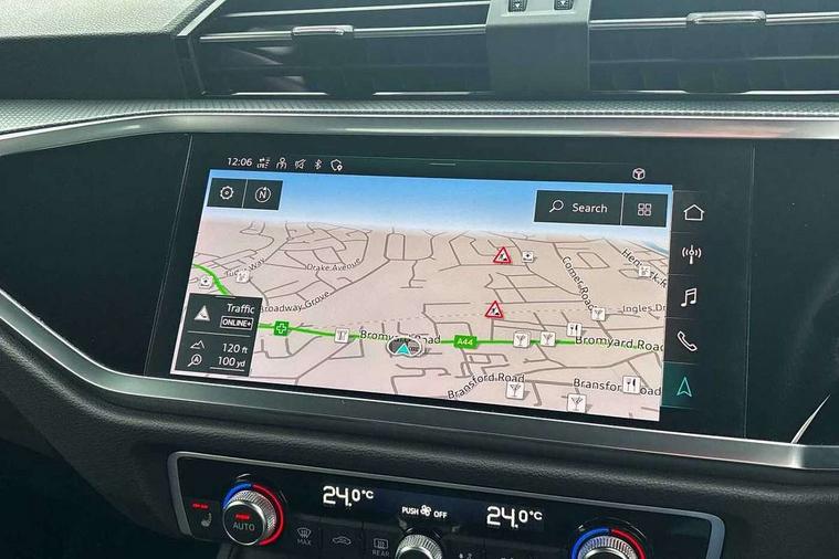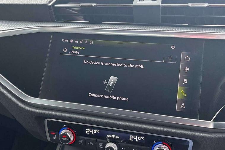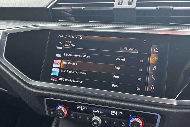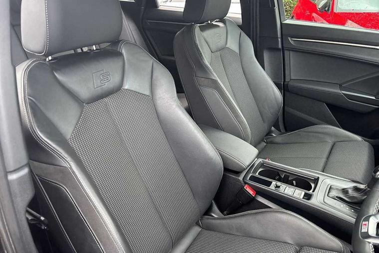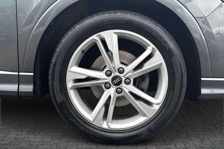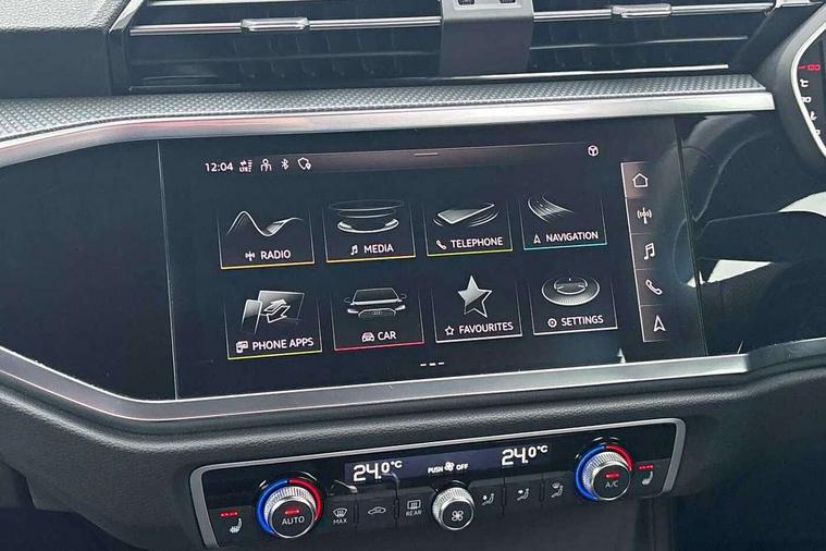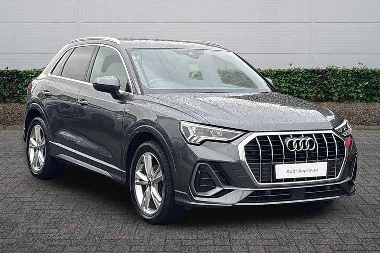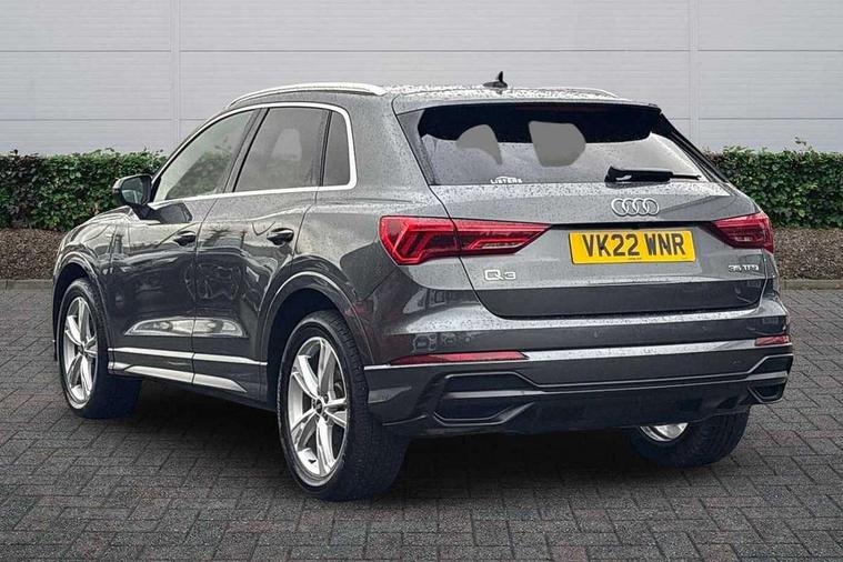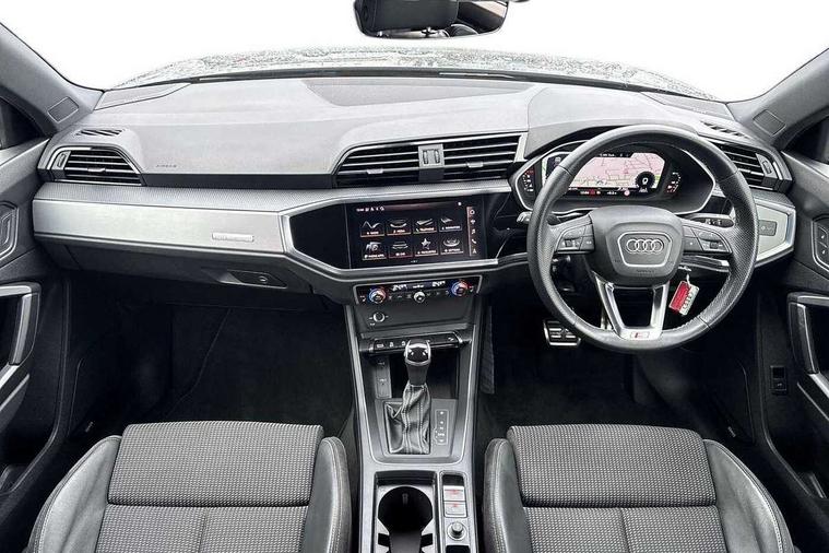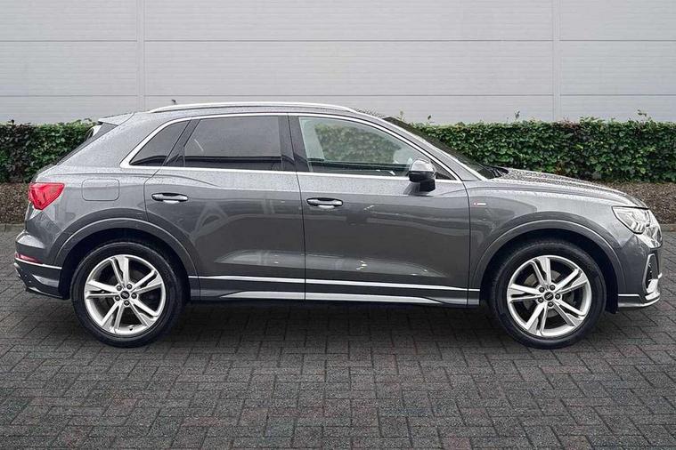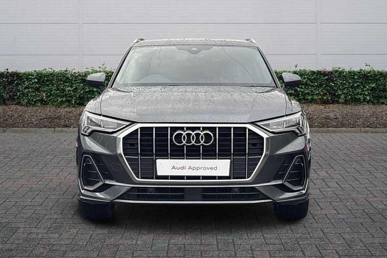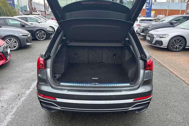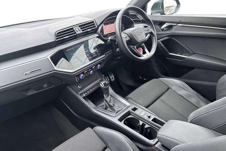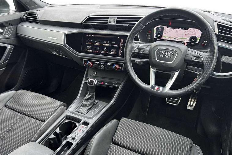 Amazon alexa Integration, Audi connect safety and service (e-call), Audi drive select, Audi lane departure warning, Audi Virtual Cockpit - 10.25" display, Bluetooth interface, Camera based traffic sign recognition, MMI Navigation Plus with high resolution 10.1 inch touchscreen colour display, Power operated tailgate, Progressive steering, Service interval indicator, Smartphone interface includes wireless Apple carplay/Android Auto, Start stop system with recuperation, Voice control system with natural language interaction, 48V Mild hybrid technology, Sports suspension, 2 USB-C ports with charge and data functions, 6 passive loudspeakers, DAB digital radio module, Acoustic windscreen, Aluminium roof rails, Aluminium window trim, Auto dimming frameless rear view mirror, Body coloured bumpers, Electrically folding, adjustable and heated door mirrors with integrated LED side indicators and kerb view function for passenger side, Front and rear electric windows, Front fog lights, Front side air inlets in matt platinum grey, Front spoiler blade in matt platinum grey, Grille vertical bars in aluminium silver/Matt, High gloss black finish B and C pillars, LED headlights with LED daytime running lights, LED rear lights, LED third brake light, Privacy glass dark tinted rear and rear-side windows (from B-pillar backwards), Rain and light sensors, Rear diffuser strip in matt titanium black, Rear side wing doors, Rear wiper, S line badges on front wings, S Line front and rear bumpers, Side skirt insert in matt Platinium grey, Silver chrome grille surround, Titanium black radiator grille, Variable front intermittent wipers, 12V socket in rear centre console, 3 seat bench in 2nd row, 40:20:40 folding with manual adjustment for 60:40 forwards/backwards position and backrest angle, Adjustable rear seat bench/backrest with centre armrest and cupholder, Black cloth headlining, Dual zone electronic climate control, Front and rear black floor mats with contrast stitching in rock grey, Front and rear headrests, Front and rear roof module including reading lights, Front centre armrest, Glove compartment lighting, Height and reach adjustable steering wheel, Illuminated door sill trims with S logo, ISOFIX child seat mounting for front passenger with airbag deactivation and outer rear seat including top tether attachment point for outer rear seats, Luggage compartment light, Manual front seats with height adjustment, Perforated leather gearknob, Single front passenger seat, Stainless steel luggage compartment sill finisher, Stainless steel pedals, Non smoking pack - Q3, 3x3 point rear seatbelts, 6 airbags - Driver, front passenger, curtain and side windows, Audi pre-sense front with pedestrain and cyclist recognition, Electromechanical parking brake, Electronic stabilisation control including ABS, ASR and EDL, Front seatbelt reminder, Hill descent control, Hill hold assist, Manual child lock in rear doors, Pre sense basic, Seatbelt monitoring, Tyre pressure warning, Warning triangle and first aid kit, Anti theft alarm, Anti theft wheel bolts, Immobiliser, Remote central locking, Dark matt brushed aluminium inlay, Detail dashboard around MMI touch colour display in glass look, black with surround in aluminium look, Leatherette door armrest, Tool kit, Tyre repair kit,