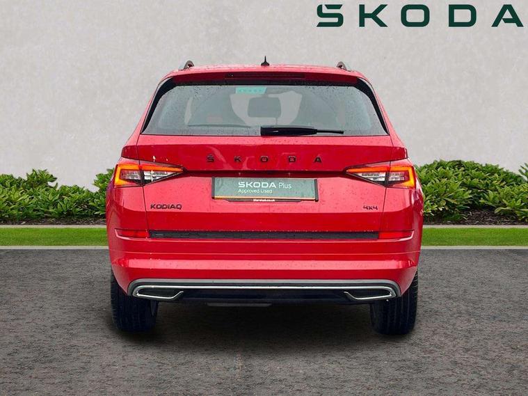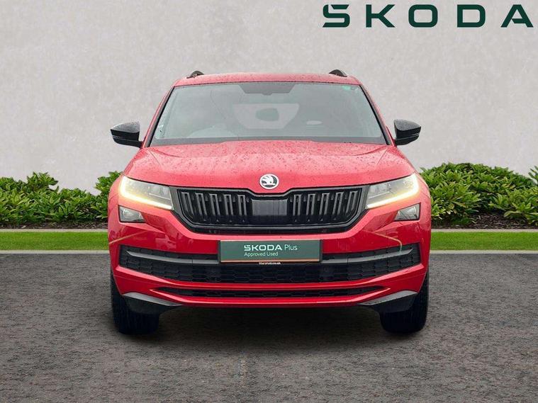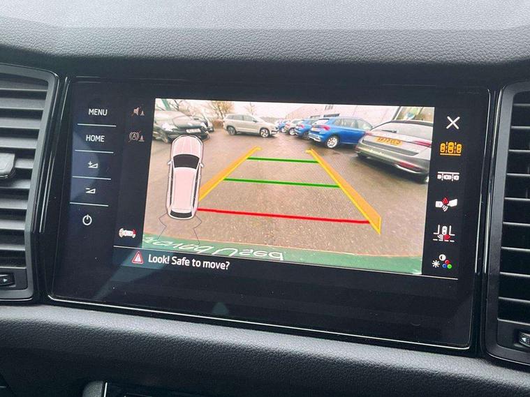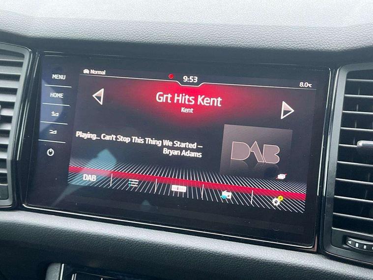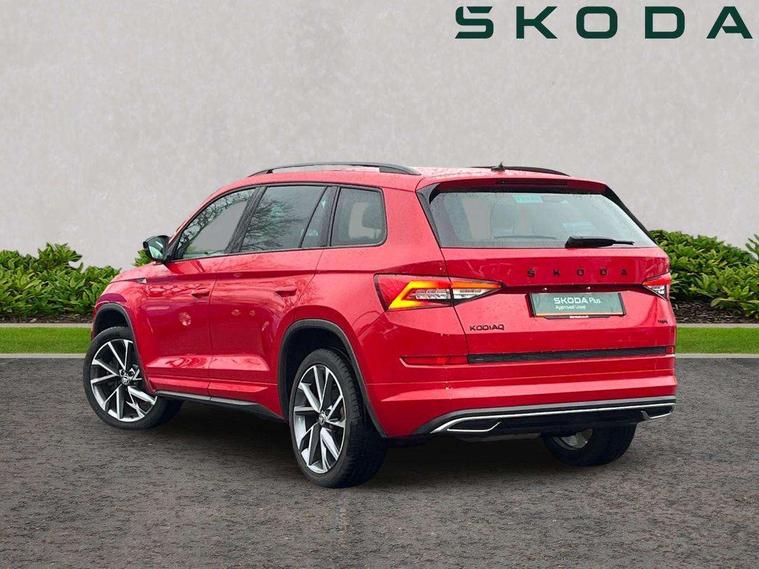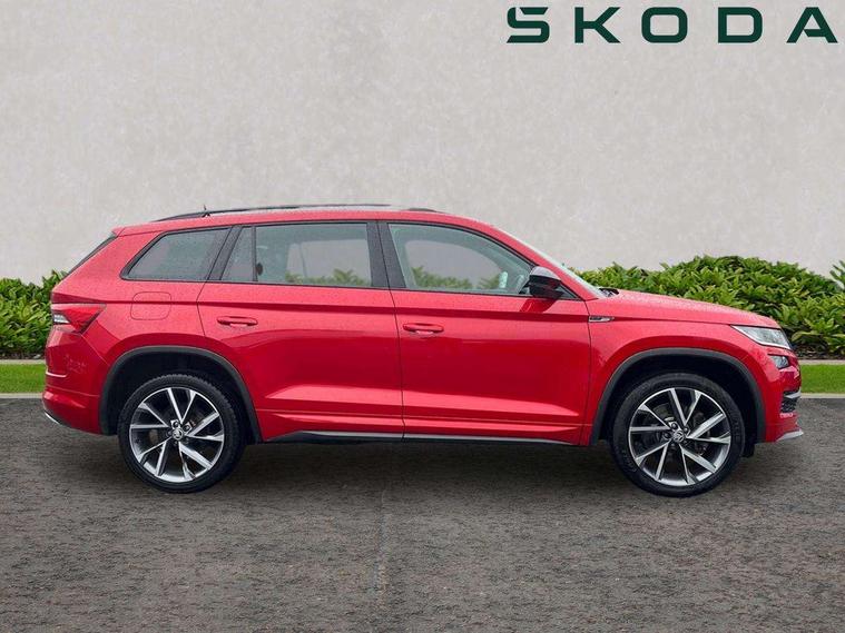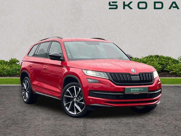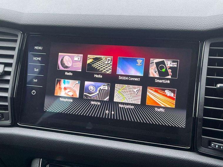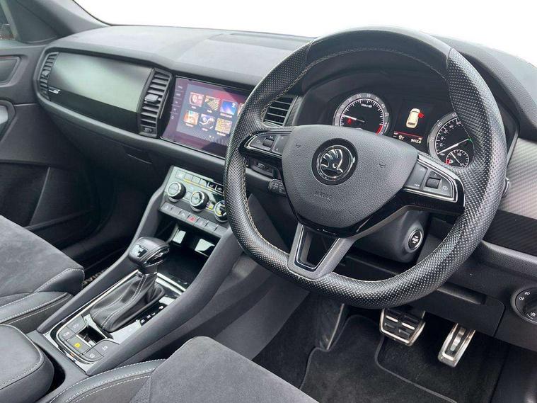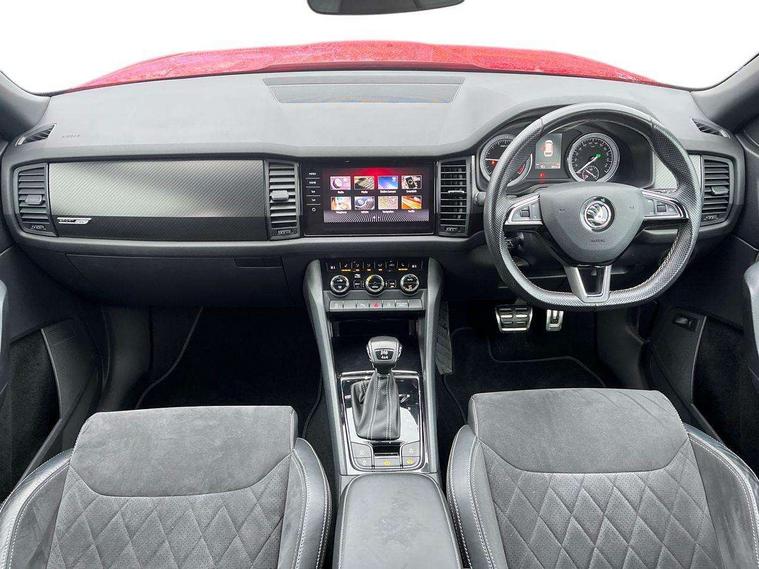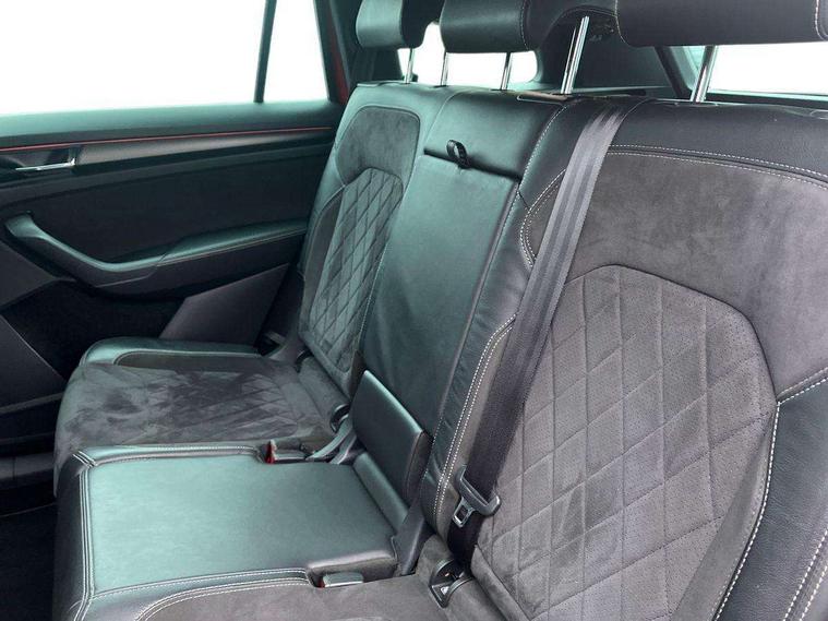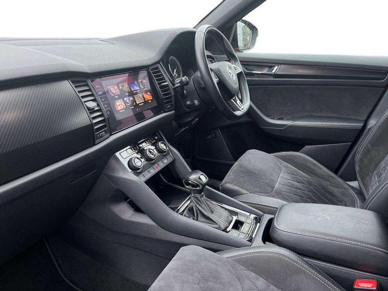 Bluetooth system, Columbus satellite navigation with 9.2" touch screen and integrated Wi-Fi + WLAN and web radio, Digital voice enhancement, ECO Stop/start function, Exterior temperature indicator, Map care, Progressive power assisted steering, SmartLink plus, Speed limiter, Sports dials, USB C Port x 2 in front centre console, Bolero Radio, DAB Digital radio, DVD System, Aero front windscreen wipers with intermittent function, Aero rear window wiper, Auto dimming rear view mirror, Automatic activation of hazard warning lights, Black electric window control buttons, Black roof rails and door mirrors with radiator grille and window surrounds, Black wheel arch surrounds, Body colour bumpers, Body colour door handles, Chrome exhaust tailpipe, Electric front and rear windows, Electrically adjustable/heated/foldable and auto dimming door mirrors with memory function, Front door steps with SportLine logo, Full LED Headlights with adaptive front light system and LED daytime running lights, Headlight washers, Heated rear window, LED front fog lights with static cornering light function, LED rear fog light, LED third brake light in rear spoiler, Light assistant (coming home/tunnel light), Rain and light sensors, Rear diffuser, Rear spoiler, Safety reflectors on front and rear doors, Sportline badge on front fender, Sports front and rear bumpers, Sunset privacy glass, Tailgate lettering in Black, Without engine designation, 12V socket in boot, 2 rails with 2 hooks including 4 hooks for net programme, 3 spoke leather sports heated multi-function steering wheel with hands off detection, 4 foldable roof handles with rear coat hooks, 4 lashing points on luggage floor, 60:40 foldable rear seat with sliding adjustment and backrest angle adjustment, Alcantara door panels, Alcantara/Leather upholstery with Sport seats with silver stitching, Aluminium pedals, Black roof headlining, Bottle holders in door panel in the 1.5 litre front and 1 litre rear, Cargo storage compartments, Centre console with open storage box, cup holder and 12V socket, Chrome headlight control button, Chrome interior door handles, Coat hooks on B pillar, Covered storage compartment on driver side, Front and rear door armrest with black adductor trim, Front and rear height adjustable headrests, Front centre armrest with storage compartment, cup holder and 12V socket, Front courtesy lights, Gear shift lever with chrome frame and black gloss insert, Illuminated and cooled glovebox, Illuminated luggage compartment, Isofix child seat fittings in outer rear seats with top tether, Manually adjustable steering column, Net programme in boot (1x horizontal Net, 2x vertical Nets), Overhead glasses storage compartment, Paddles on steering wheel for DSG gearbox, Pollen filter, Rear centre armrest with cupholders, Roll up luggage compartment cover with intermediate position, Small Bags on the inner sides of the front backrests, Storage compartment in lower middle instrument panel with closing, Three rear height adjustable headrests, Ticket holder on A Pillar, Umbrella in door panel, LED Interior Light pack - Kodiaq Scout/Sport Line/VRS/Laurin + Klement, Auto door release and activation of warning lights, Driver and passenger airbags, Electronic parking brake with hill hold control, Emergency rear braking signal, ESC (incl. ABS+MSR+ASR+EDS+HBA+DSR+RBS+MKB), Front and rear three point safety belt on all seats, Front assist includes AEB city/urban, Front passenger airbag deactivation switch, Front side airbags, Fuel cut off safety device, Head and knee airbags, Rear disc brakes, Safety vest holder in door, Seat belt reminder for all seats, Tailgate unlocking from outside, Two tone horn, Tyre pressure monitor, Warning lights in front doors, Alarm with interior monitoring and tilt sensor with safe function, Immobiliser, Keyless entry and start system (KESSY), Remote central locking, Carbon finish dashboard and door inserts, Chrome air vent surrounds, 20" Vega Anthracite alloy wheels with anti-theft wheel bolts,