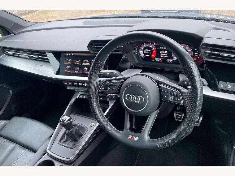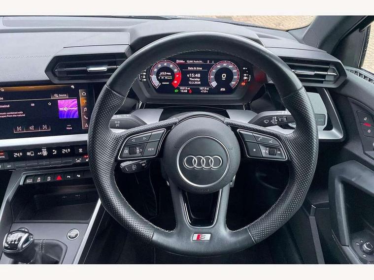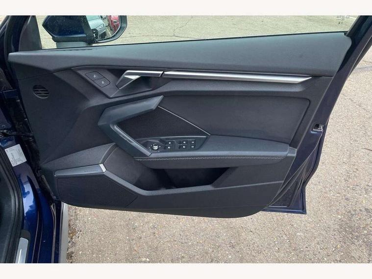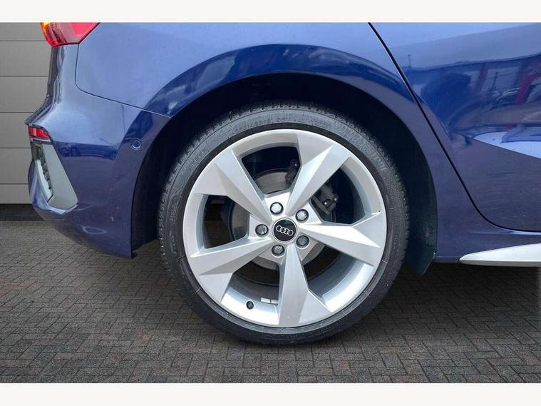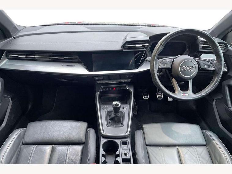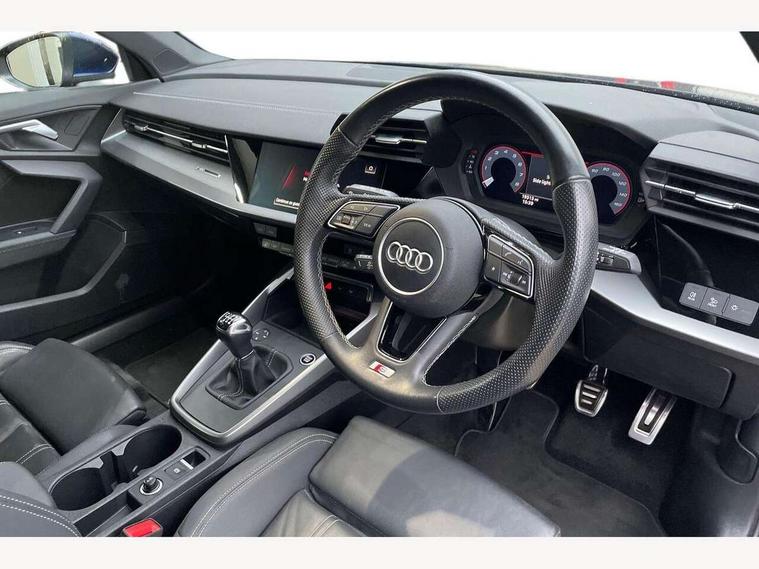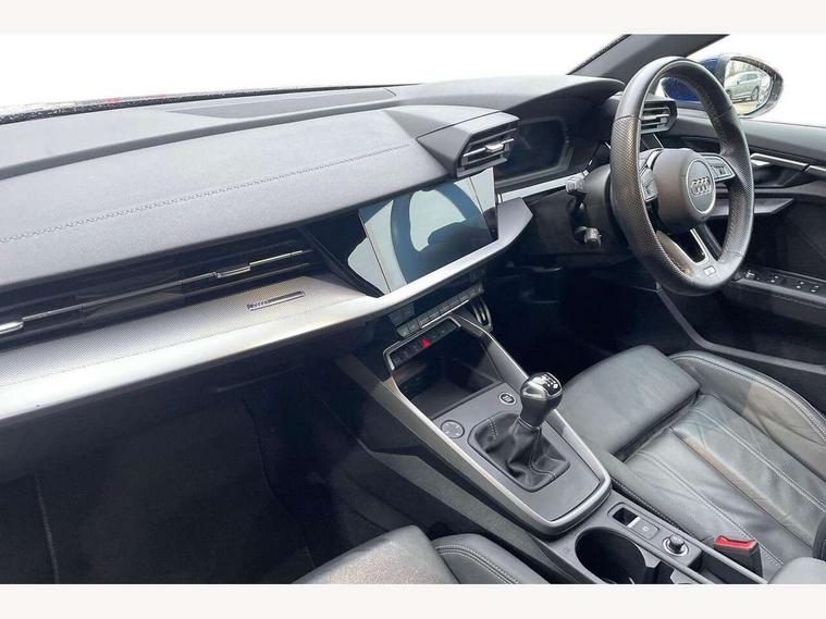 Audi drive select (Auto, Comfort, Dynamic and Individual), Audi smartphone interface, Audi Virtual Cockpit - 10.25" digital and colour instrument cluster, Automatic start/stop system with recuperation, Bluetooth interface, Camera based traffic sign recognition, Collision avoidance assistant, Cruise control, e-Call (emergency call), Electromechanical power speed sensitive steering, Lane departure warning system, MMI Navigation Plus with high resolution 10.1" colour touch screen display, Rear parking sensors, Service indicator, Trip computer, Voice control system with natural language interaction, Sports suspension, 2xUSB-C connection with data and charging functions, 6 passive loudspeakers, DAB Digital radio, 3rd brake light, Acoustic glass windscreen, Aluminium window trim, Auto dimming frameless rear view mirror, Body colour exterior mirrors, Electrically adjustable/heated/folding/auto dimming door mirrors with integrated LED indications + kerb view function for passenger side, Front electric windows, Illuminated aluminium inserts front door sills with S logo, LED daytime running lights, LED headlights with LED rear lights and dynamic rear indicators, Light and rain sensors, Privacy glass - dark tinted rear window, rear door and side windows, Rear electric windows, Rear side air outlets in grained matt black, Rear side wing doors, Rear wiper, S line bumpers, S roof spoiler, 12V socket and storage compartment in front centre console, 3 seat bench in 2nd row, 3 spoke leather multifunction steering wheel, 4 way electrically adjustable lumbar support for driver and front passenger, 60/40 split folding rear seat bench, Black cloth headlining, Dual zone electronic climate control, Front and rear centre armrest in leather, Front and rear headrests, Front/rear floor mats, Height and reach adjustable steering wheel, Interior lighting - glove compartment light and right hand side, Luggage compartment floor covering, Manual boot compartment lid, Manually adjustable front seats, Seat side bolsters, Single front passenger seat, Stainless steel pedals and front footrest in black, Twin leather upholstery with front sports seats S embossed logo, Aluminium interior elements pack - A3 Sportback, LED interior lighting pack - A3 Sportback, S line styling pack - A3 Sportback, 3x3 point rear seat belts, Driver and front passenger airbag with passenger airbag deactivation, Electronic Stabilisation Control (ESC) including ABS, ASR and EDL, First aid kit with warning triangle and 2 safety vests, Front side airbags with head airbags and interaction airbag, Pre-sense front with pedestrian and cyclist detection, Seatbelt monitoring, Tyre pressure loss indicator, Anti theft alarm, Anti-theft wheel bolts, Electronically operated child lock, Immobiliser, Remote control central locking, Dark spectrum aluminium inlays, accent surfaces in the dashboard and centre console in platinum grey silk effect paint finish,