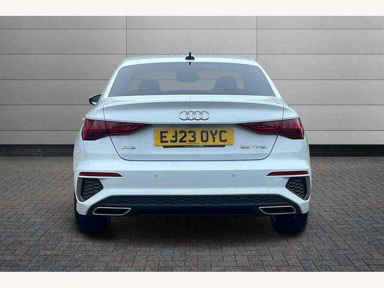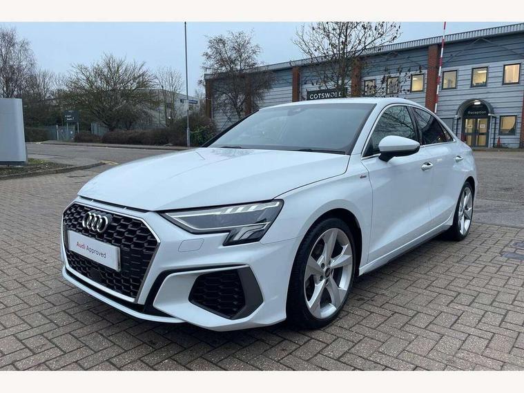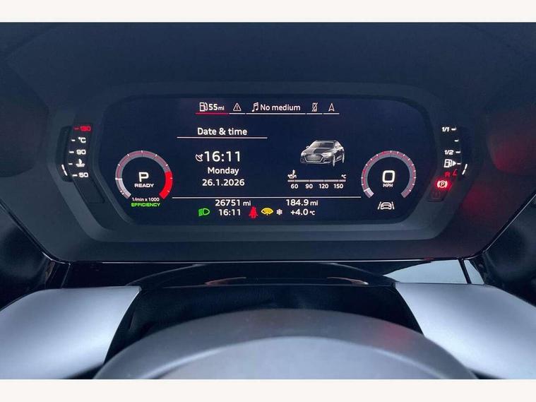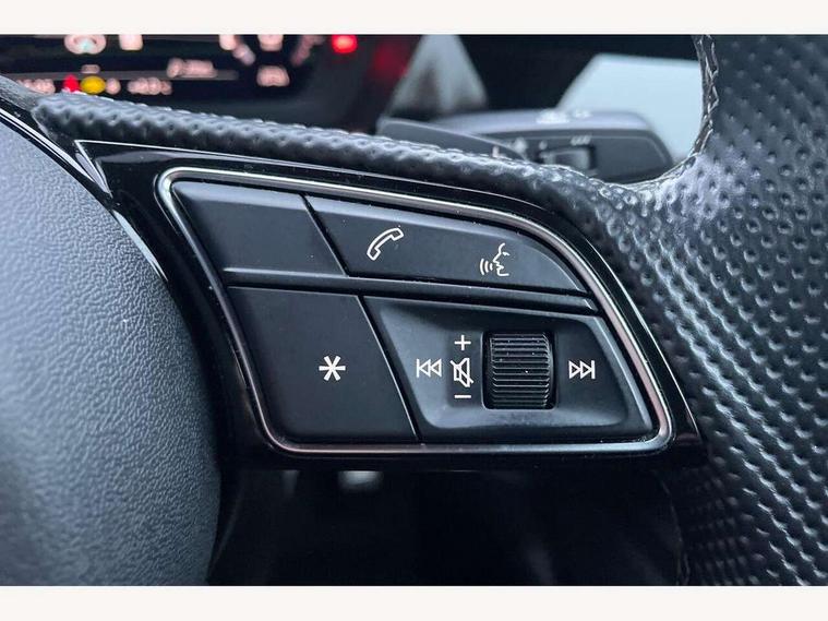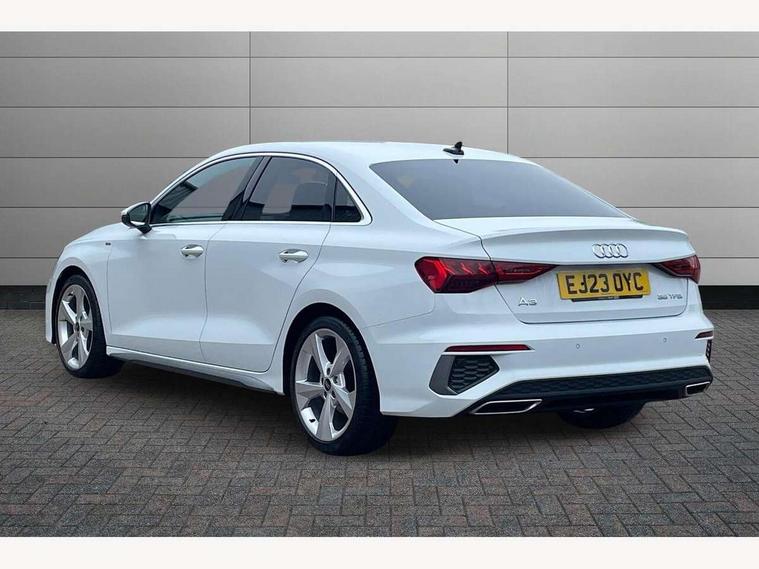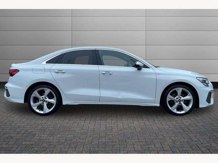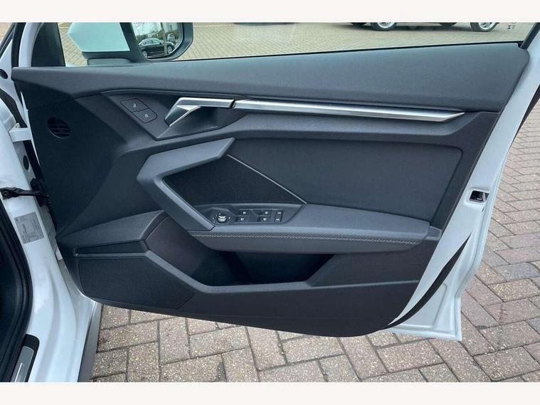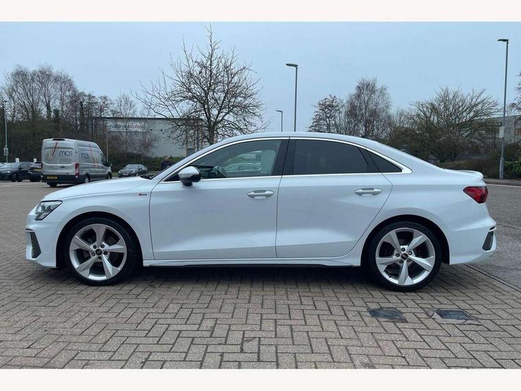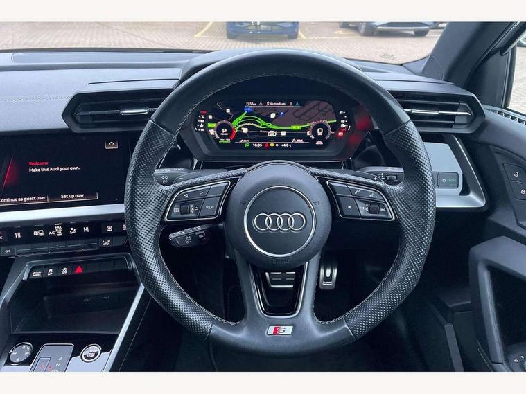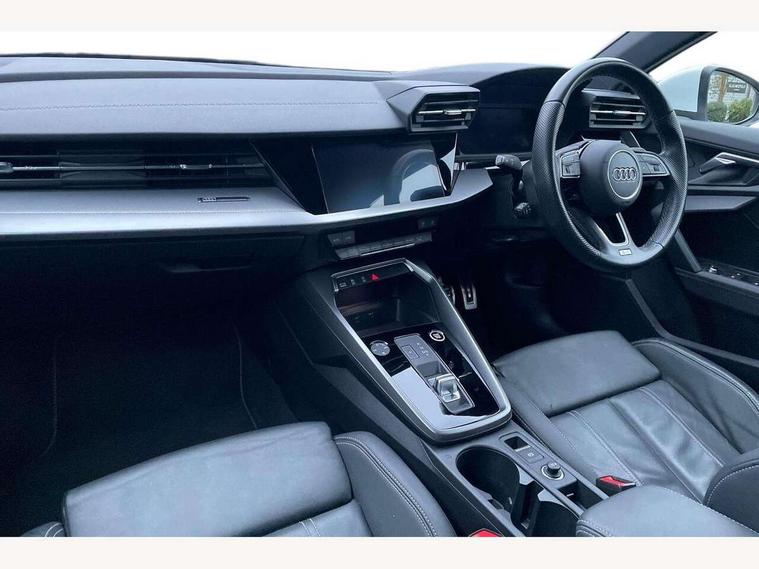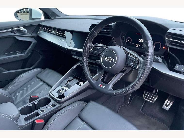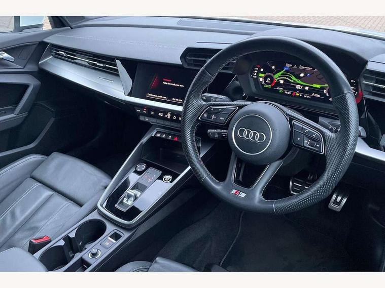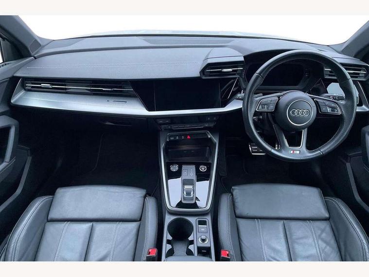 Audi connect emergency call and service, Audi drive select (Auto, Comfort, Dynamic, Efficiency and Individual), Audi smartphone interface, Audi Virtual Cockpit - 10.25" digital and colour instrument cluster, Automatic start/stop system with recuperation, Bluetooth interface, Collision avoidance assistant, Electromechanical power speed sensitive steering, Lane departure warning system, MMI Navigation Plus with high resolution 10.1" colour touch screen display, Service indicator, Voice control system with natural language interaction, Sports suspension, 2x USB Type C ports (for charging and data transfer), 6 passive loudspeakers, CD player, DAB Digital radio, 3rd brake light, Acoustic glass windscreen, Aluminium window trim, Auto dimming frameless rear view mirror, Body colour exterior mirrors, Electrically adjustable/heated/folding/auto dimming door mirrors with integrated LED indications + kerb view function for passenger side, Front electric windows, Illuminated door sills with aluminium inserts at the front with S logo, LED daytime running lights, LED headlights with LED rear lights and dynamic rear indicators, Light and rain sensors, Model and engine designation badges at rear, Privacy glass - dark tinted rear window, rear door and side windows, Rear boot, Rear electric windows, Rear side wing doors, S line bumpers, S roof spoiler, 12V socket and storage compartment in front centre console, 3 seat bench in 2nd row, 3 spoke leather multifunction steering wheel with gear shift paddles, 4 way electrically adjustable lumbar support for driver and front passenger, 60/40 split folding rear seat bench, Black cloth headlining, Dual zone electronic climate control, Front and rear centre armrest in leather, Front and rear headrests, Front/rear floor mats, Height and reach adjustable steering wheel, Interior lighting - glove compartment light and right hand side, Luggage compartment floor covering, Manual boot compartment lid, Manually adjustable front seats, Seat side bolsters, Single front passenger seat, Stainless steel pedals and front footrest in black, Twin leather upholstery with front sports seats S embossed logo, Aluminium interior elements pack - A3, LED interior lighting pack - A3 Saloon, S line styling pack - A3 Saloon, 3x3 point rear seat belts, Driver and front passenger airbag with passenger airbag deactivation, Electronic Stabilisation Control (ESC) including ABS, ASR and EDL, First aid kit with warning triangle and 2 safety vests, Front side airbags with head airbags and interaction airbag, Pre-sense front with pedestrian and cyclist detection, Seatbelt monitoring, Tyre pressure loss indicator, Anti theft alarm, Anti-theft wheel bolts, Electronically operated child locks, Immobiliser, Remote control central locking, Aluminium air vent surrounds, Dark spectrum aluminium inlays, accent surfaces in the dashboard and centre console in platinum grey silk effect paint finish,
