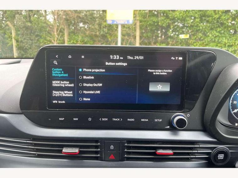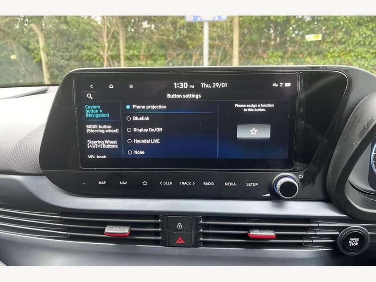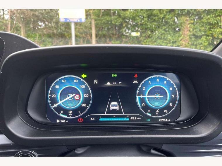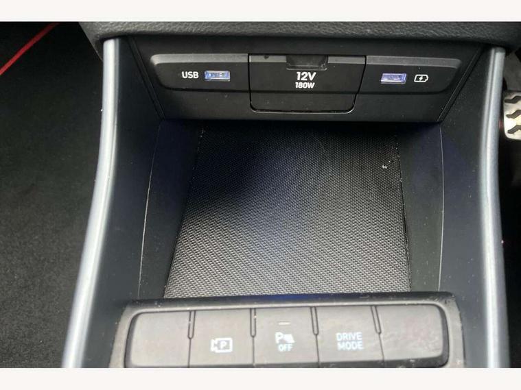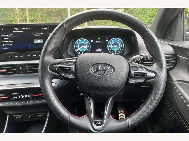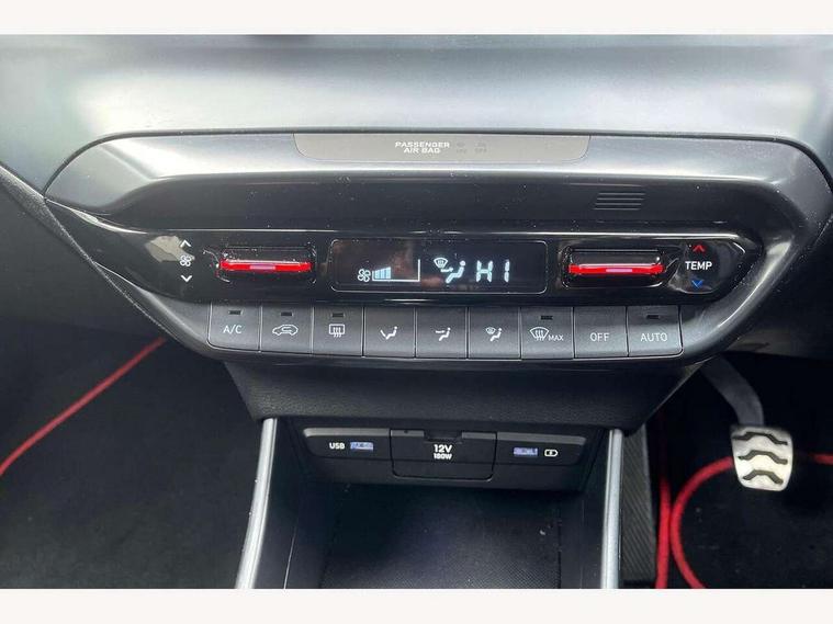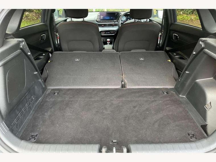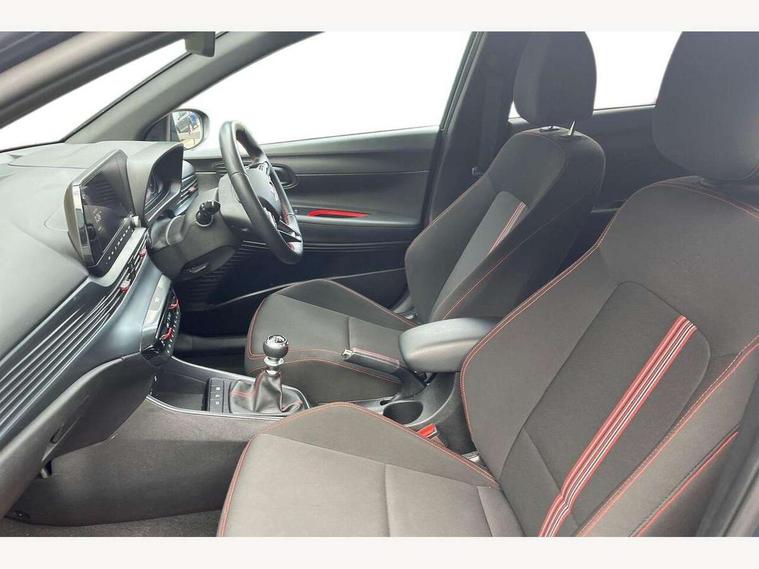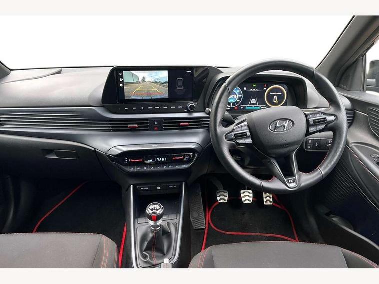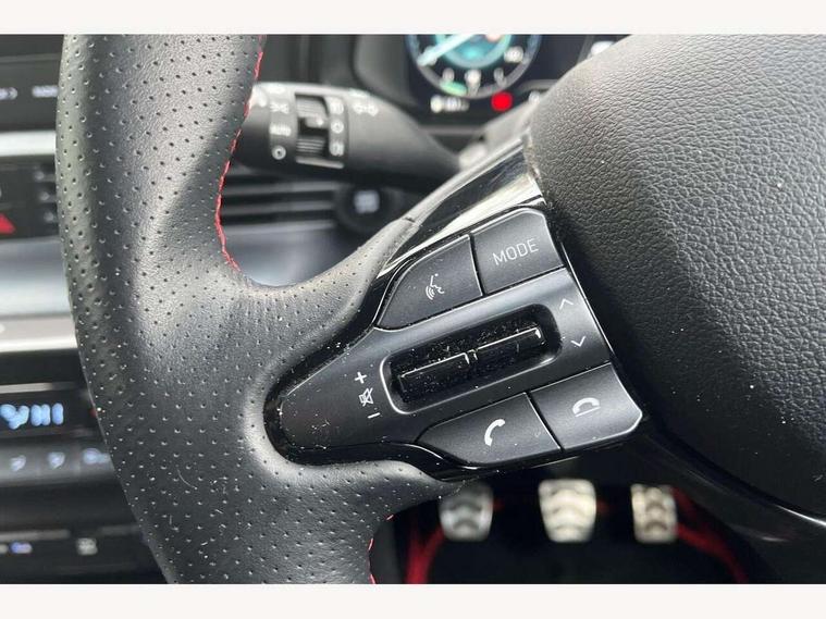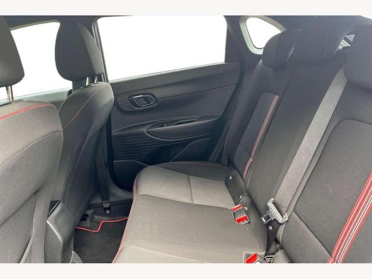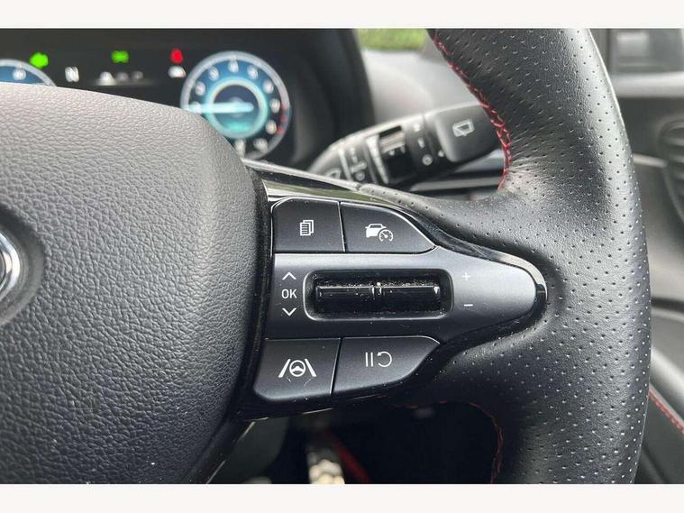 10.25" digital supervision cluster, 10.25" touchscreen centre console display satellite navigation including traffic messaging channel, map care and live services, Apple car play/Android Auto, Bluetooth connectivity with voice recognition, Cruise control + speed limiter, Drive mode selector, Driver alert system, eCall emergency call system, Electric power steering, Emergency stop signalling system, Forward collision assist with pedestrian monitoring and cycle detection, Haptic steering, Lane departure warning system, Lane keep assist, Rear parking sensor, Rear view camera, Trip computer, Vehicle Stability Control (VSC), 6 speakers (2 front, 2 tweeters, 2 rear), Auxiliary input socket, DAB Digital radio, Steering wheel mounted audio/telephone controls, USB connection, Adjustable intermittent front windscreen wipers with aero wiper blade, Auto dimming rear view mirror, Automatic defog system for front windscreen, Automatic headlights with dusk sensor, Automatic windscreen wipers with rain sensor, Black window surrounds, Body colour door mirrors with integrated indicators, Body colour exterior door handles, Body coloured bumpers, Drivers one touch up/down with anti-trap, Electric adjustable heated door mirrors, Electric folding door mirrors, Electric front windows, Electric rear windows, Front fog lights, High beam assist, LED rear combination lights, MFR - LED headlights, N line body kit bumpers, N Line exclusive gloss black radiator grille, Privacy glass - Rear windows and tailgate, Rear dual exhaust muffler, Rear side wing doors, Rear spoiler with integrated LED brake light, Rear Windscreen Wiper - Intermittent Function, Shark fin antenna, Signature LED daytime running lights integrated into headlamp, Static Cornering lights, Tinted windows, 12v power outlet - front, 3 seat bench in 2nd row, 60/40 split folding rear seat, Adjustable head restraints, Black roof liner, Blue interior mood lighting, Climate control, Driver/passenger sunvisors and illuminated vanity mirrors, Front armrest with storage box, Front map reading lights, Height adjustable driver's seat, Height/reach adjustable steering column, Isofix rear child seat preparation, Leather wrapped gear knob with N logo, Leather wrapped steering wheel with N logo, Luggage board, Luggage compartment lighting, N Line cloth trim with red stitching, Parcel shelf, Satin chrome interior door handles, Single front passenger seat, 3x3 point rear seatbelts, Anti-lock brake system (ABS), Autonomous emergency braking, Childproof rear door locks, Curtain airbags, Driver/Front Passenger airbags, ESP, Fasten seatbelt reminder, Front seatbelt pretensioners, Front side airbags, Height adjustable front seatbelts, Hill start assist control (HAC), Impact sensing auto door unlocking, Passenger airbag deactivate switch, Tyre pressure monitoring system, Deadlocks, Immobiliser, Locking wheel nuts, Perimeter alarm, Remote central locking, Smart key with keyless entry and engine start/stop button, Speed sensitive auto door locking, Black N line exclusive with red accents, 17" N Line exclusive design alloy wheels, Michelin Tyre brand, Tyre repair kit,