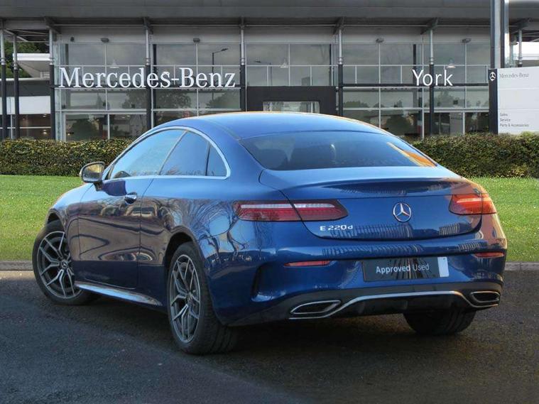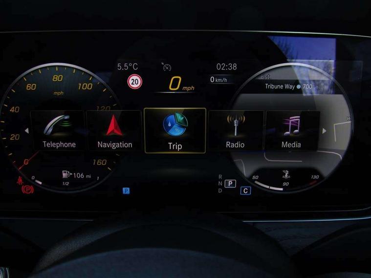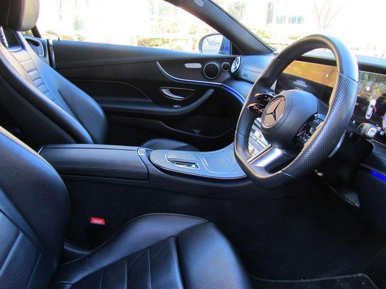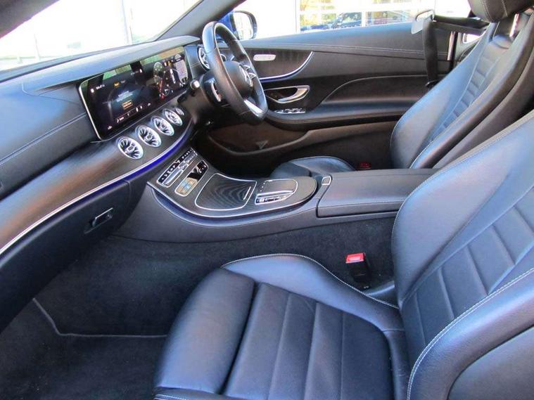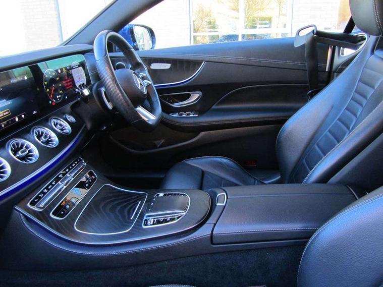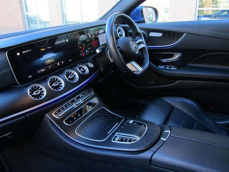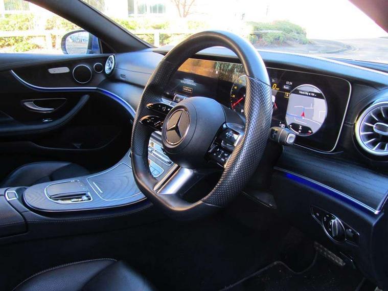 360 degree parking camera, Active parking assist including front and rear parking sensors, Analogue clock, Attention assist, Blind spot assist, Brake wear warning display, Cockpit display 12.3" widescreen digital instrument cluster, Collision prevention assist plus, Cruise control with variable speed limiter, Direct steer speed sensitive steering, DYNAMIC SELECT with a choice of driving modes (ECO, Comfort, Sport, Sport+ and Individual), E-call, ECO start/stop function, Hey Mercedes Voice activation, High resolution 12.3" multimedia colour display, Mercedes connect me, Outside temperature display, Pre-installation for Vehicle Monitoring, Pre-installation for Vehicle Setup, Remote boot release, Service indicator (ASSYST), Status display for rear seat belts in instrument cluster, Touchpad without controller, Traffic sign assist, Trip computer in multifunction display showing current fuel consumption, Wireless charging, 25 litre AdBlue tank, 66 litre fuel tank, 9G TRONIC 9 speed automatic transmission, Agility control sports suspension with selective damping system, Diesel particulate filter, Incorrect fuelling protection, 2 USB ports in centre console, 2 USB ports in the rear, MBUX multimedia system with DAB digital radio and touchpad including satellite navigation, Smartphone integration via Android Auto/Apple CarPlay, Media Interface, USB and Bluetooth interface and touchpad with control wheel, Adaptive brake lights, Adaptive high beam assist, AMG bodystyling front and rear aprons in polished aluminium, AMG boot lid spoiler in body colour, Body colour door handles, Body coloured bumpers, Electric windows with one touch opening/closing and obstruction sensors, Exterior mirrors heated and electronically adjustable, Illuminated front door sill panels with Mercedes-Benz lettering, LED daytime running lights, LED high performance headlamps, Magic Vision Control heated windscreen wiper system, Pre-installation for roof rail systems, Privacy glass Includes rear side windows and rear windscreen, Radiator grille with integral star and 2 louvres in matt iridium silver with chrome trim, Radio aerial integrated into rear window, Rain sensing windscreen wipers, Rear boot, Rear LED lights, Third brake light, Top surround of side windows in polished aluminium, Visible twin pipe exhaust system integrated into bumper, Waistline in polished aluminium, 2 seat bench in 2nd row, 3-spoke flat bottom multifunction AMG steering wheel with Touch Control buttons, trimmed in black nappa leather, 40:20:40 split folding rear seats, Artico man-made leather upper dashboard and beltlines with contrast stitching, Automatic child seat recognition sensor, Belt feeder driver and front passenger seat belt automatically positioned within easier reach, Black door pins, Black roof lining, Central stowage compartment with 12 V socket in centre console, Central stowage compartment with USB socket for use with Android Auto and Apple CarPlay, Centre armrest and door handle illumination, Centre console in black open-pore ash wood, Floor mats with AMG lettering, Front and rear door pockets, Front centre armrest with stowage compartment, Front footwell lights, Glasses compartment in overhead control panel, Glove compartment - lockable, air conditioned and illuminated, Head restraints for driver and front passenger (four-way adjustability) and in rear (two-way), Heated front seats with partial electric adjustment and electro-pneumatic four-way lumbar support, Interior lighting - 64 colour Ambient lighting, Interior rear light/integral reading lights, Isofix rear child seat fastenings, Multi contour front sports seats, Seat occupancy sensor for front passenger seat, Single front passenger seat, Sports pedals in brushed stainless steel with black rubber studs, Steering column manually adjustable for height and reach, Steering wheel gearshift paddles, Sunvisors with illuminated vanity mirrors, THERMOTRONIC automatic climate control system with 3 climate zones, Mirror pack - E Class, Seat comfort pack - E Class, Stowage pack - E Class, 2 x 3-point rear seatbelts, Active bonnet pedestrian safety measure which detects an impact and raises bonnet, Active brake assist, Adaptive brake system with HOLD function and brake drying in the wet, Adaptive driver and front passenger airbags, Airbags - sidebag for driver and front passenger with combined thorax/pelvis bag, Anti-lock braking system (ABS), Drivers knee airbag, Electric parking brake, Electronic Stability Programme, Front and rear window airbags, Head airbags, Hill hold function, Perforated front brake discs with "Mercedes-Benz" lettering, Pre-Safe anticipatory safety system, Seatbelt warning, Tyre pressure monitoring system, Warning triangle and first aid kit, Alarm system/interior protection/immobiliser, Central locking with interior switch, automatic locking and crash sensor with emergency opening function, Chrome surround electric key, Keyless Go entry and starting function, Open-pore black ash wood trim, 19" AMG 5 twin spoke alloy wheels in tantalite grey with high sheen finish (RZI), Summer tyres, TIREFIT with tyre inflation compressor,