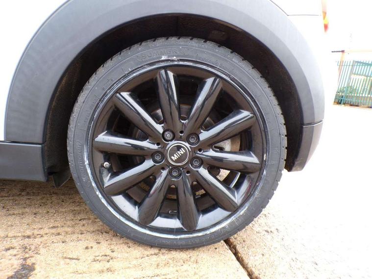 Acoustic seat-belt warning, Brake fluid level warning light, Brake pad wear indicator warning light, DTC - Dynamic traction control, Exterior temperature gauge, Intelligent emergency call, MINI TeleServices, Oil level indicator, On board computer, Push button starter, Service interval indicator, Servotronic PAS, Electronic differential lock, Auxiliary input socket, DAB digital radio module, 2 speed wipers+intermittent wipe, Aluminium tailgate, Anti dazzle mirror, Anti trapping/one touch open close front windows, Body coloured bumpers, Chrome bezels around rear lights and headlights, Chrome door handles, Chrome exhaust tailpipe, Chrome plated radiator grille, Chrome plated trim on bottom edge of window, Chrome strip on lower grille, Electric front windows, Electrically adjustable door mirrors, Flared wheel arches, Follow me home headlights, Green tinted heat insulating glass, Heated door mirrors/heated windscreen washers, Heated rear window with auto timer, Metal look door sill finishers, Rear wiper, Roof spoiler in roof colour, 2 rear head restraints, 4 boot load lashing points, 4 way manually adjustable passenger seat with height, reach, tilt, backrest and headrest, 6-way manually adjustable driver's seat, Active carbon filter, Air recirculation system, Auxiliary socket in centre console storage compartment, Centre console storage, Driver's seat height adjuster, Driver/passenger sunvisors, Easy entry seats, Front and rear cupholders, Front head restraints, Front interior light, Front passenger grab handle, Gear/selector and handbrake in artificial leather, Internal chrome door handles, Isofix child seat preparation, Luggage compartment lighting, Reach + rake adjustable steering column, Rear grab handles, Rear storage trays, Split folding rear seats, Storage compartments in doors, Toolkit in luggage compartment, Vanity mirrors, 3 point seatbelts, ABS/EBD, ASC+T, Cornering brake control (CBC), Crash Sensor - activates hazard/interior lighting + unlocks doors, Driver and passenger airbags, Driver/front passenger side airbags, DSC - Dynamic Stability Control, Fuel cut off safety device, Head airbags, Hill start assist, Manual passenger airbag deactivation function, Seatbelt pretensioners, Tyre pressure warning, Ventilated front disc brakes, Drive away door locking, Locking wheel bolts, Remote central locking/doors+fuel cap+tailgate, Second remote key, Thatcham category 1 alarm + immobiliser,
