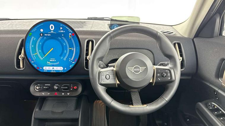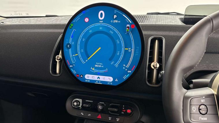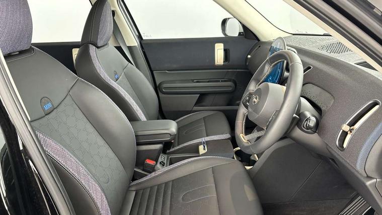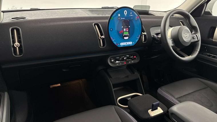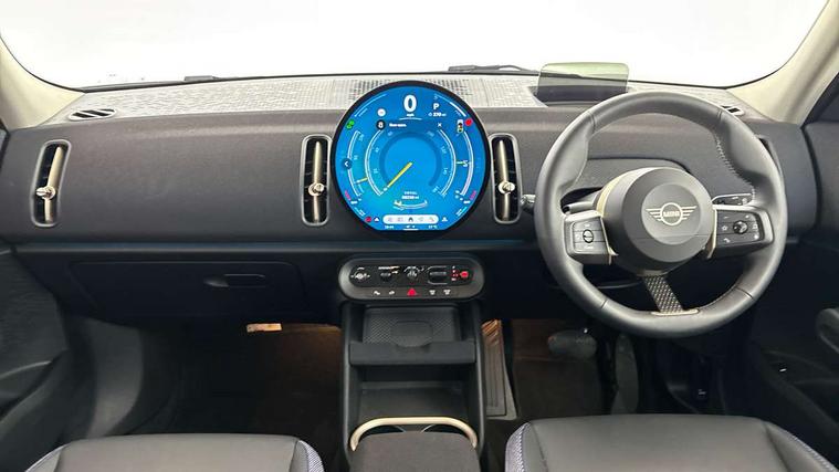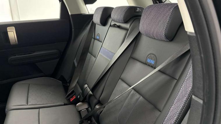 Bluetooth connection, Circular OLED Screen, Compatible mobile phone bluetooth with audio streaming, Cruise Control (DCC), Digital dashboard display, Driving assistant, E-call, Electro-mechanical speed dependant steering assistance, MINI Experience Modes, Mini navigation system, MINI TeleServices, Parking assistant in camera and ultrasound based assistance system, rear view camera, parking aid and distance control, Auto transmission with Paddles, Larger capacity fuel tank, 6 speakers, DAB Digital radio, Personal eSim, Auto tailgate, Electric adjustable heated door mirrors, Front and rear electric windows, Heated rear window, LED daytime running lights, LED Headlights, LED rear lights, LED third brake light, Rain sensor with auto headlights, Rear side wing doors, Rear window wiper, Roof rails, 3 seat bench in 2nd row, 60/40 split rear bench seat, Auto air conditioning, Floor mats, Front armrest, Front headrests, Heated steering wheel, Height and length steering column adjustment, Light headliner, Rear headrests, Single front passenger seat, Sport Vescin Steering Wheel, Sunvisors with vanity mirrors, Vescin/Cloth upholstery, 3x3 point rear seat belts, 6 Airbags - front, side, head and seat belt tensioners, ABS, DSC - Dynamic Stability Control, Electronic handbrake, Electronic Stability Programme (ESP), Front ISOFIX (iSize), Hill hold assist, Hill start assist, Manual rear child locks, Traction control, Tyre pressure monitoring system, Warning triangle, Alarm system with tilt sensor, monitoring doors, bonnet interior and tailgate, Auto drive away locking, Deadlocking function, Electronic vehicle immobiliser, Locking wheel bolts, Remote control locking, Start/stop toggle with keyless go, Black/Blue dashboard knit, MINI Mobility Kit,
