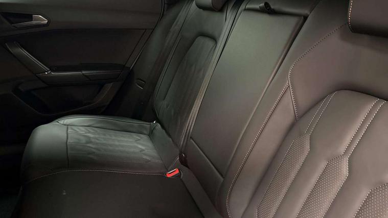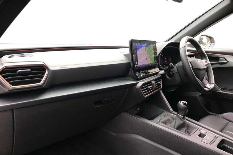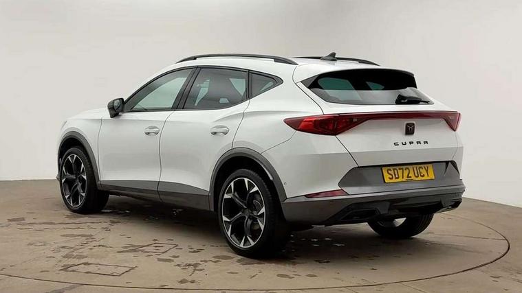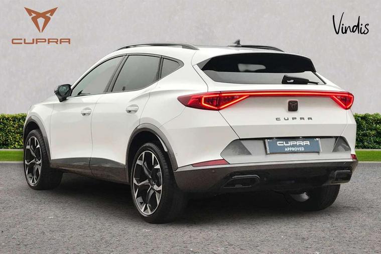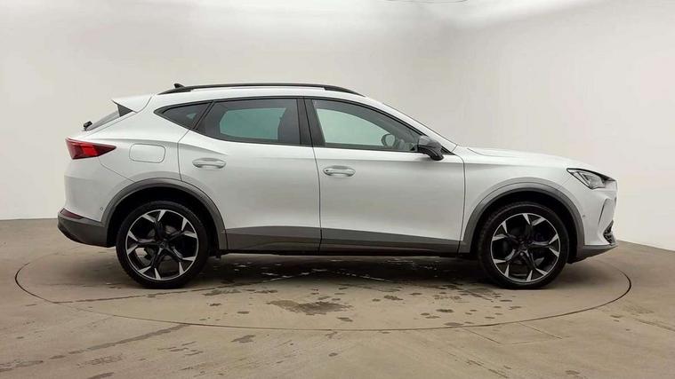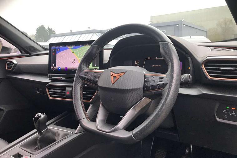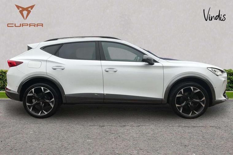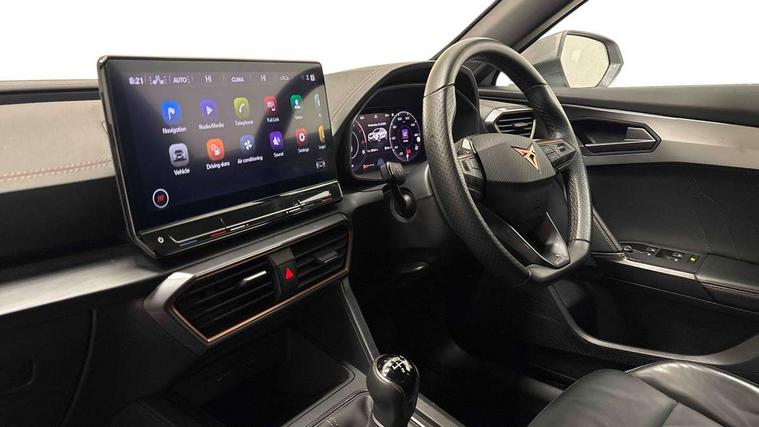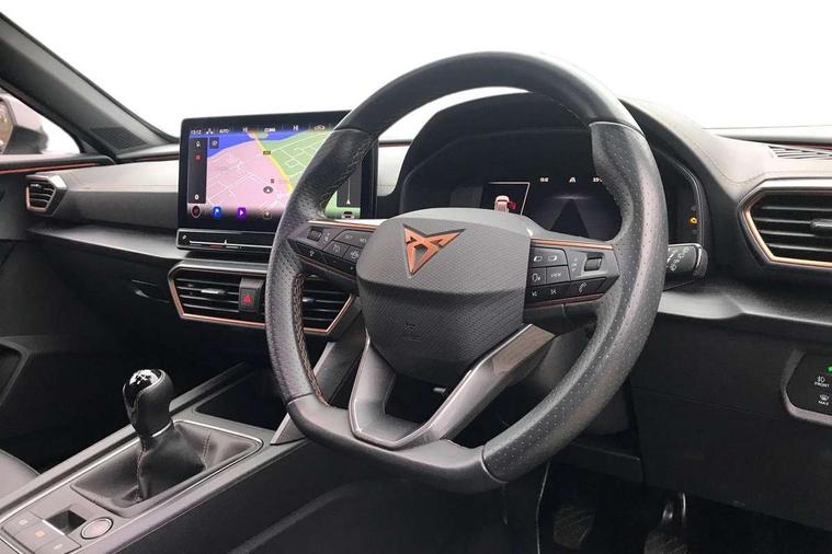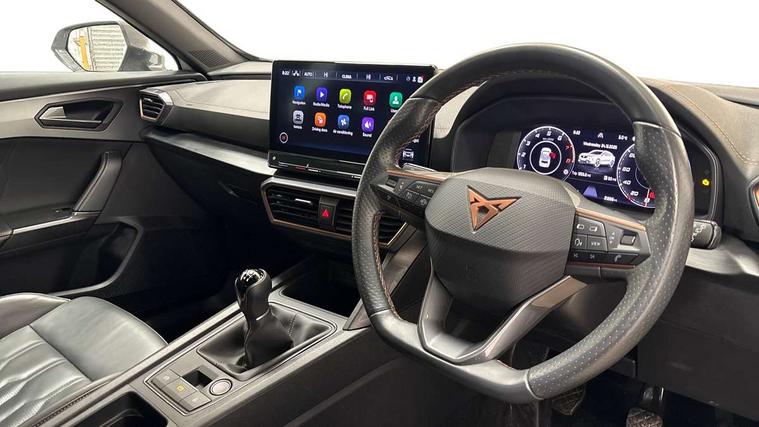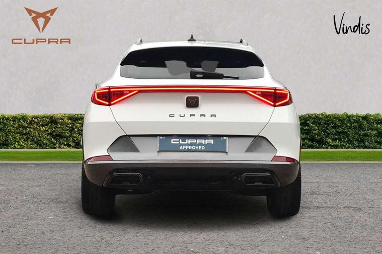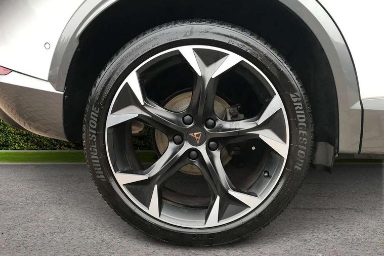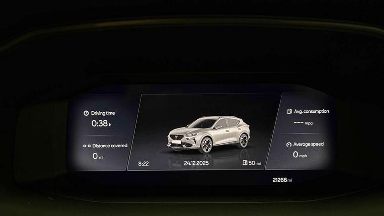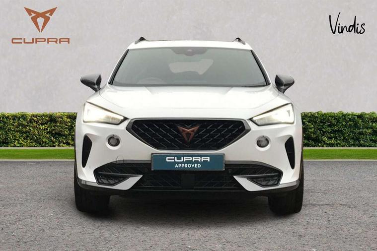 Digital cockpit and configurable dashboard, Driver alert system, Driving profile selection, Forward collision warning with automatic braking, Lane assist, Navigation system with 12'' Touchscreen Display, Park assist (inc front/rear parking sensors), PAS, Predictive adaptive cruise control with speed limiter, Rear view camera, RPM, trip computer, outside temp gauge, instrument light brightness, low fuel warning light, lights on reminder, gearshift indicator, Service interval indicator, Start/stop system with regenerative braking, Voice control system, Wireless apple carplay, Wireless phone charger, Electronic locking differential and dynamic traction support, Standard suspension, 2 front and 2 rear USB type C sockets, Auxiliary input socket, DAB radio, Auto dimming rear view mirror, Body colour door handles, Body coloured bumpers, Dark grey wing mirror, Daytime running light with automatic headlight control and coming home feature, Dynamic headlight range control, Electric front/rear windows, Electrically adjustable heated and folding door mirrors with memory function, Front fog lamps with cornering function, Gloss black roof rails and window surrounds, LED Headlights, LED Taillights with dynamic indicator, Rain sensing wipers, Rear diffuser with black simulated exhaust pipes, Rear side wing doors, Rear wash/wipe, Third brake light, Tinted rear windows, Welcome lights, 12v power supply in centre console, 12V socket, 12v socket in loadspace, 2 front and 2 rear reading lights, 230V socket, 3 seat bench in 2nd row, 60/40 split rear bench seat with armrest and mechanical seat release, Black headlining, Dust/pollen filter, Front and rear head restraints, Front centre armrest, Height/reach adjust steering wheel, Illuminated interior front door sills, Illuminated sunvisor with mirror, Isofix, Leather multi function steering wheel, Luggage tie-down hooks, Single front passenger seat, Three zone climate control with control panel in rear, Variable luggage/load compartment floor, Wraparound lighting, Genuine Nappa leather Pack - Cupra, Safety and driving pack (M) - Formentor, 3 point seatbelts on all rear seats, ABS, Brake control system - ESC and brake booster, Child proof door locks, Driver and front passenger airbags with front passenger airbag de-activation, Electronic parking brake, Front and rear disc brakes, Front side curtain airbags, Hill hold control, Public e-call, Seat belt reminder for front and rear seats, Tyre pressure monitoring system, Anti theft alarm system, Keyless entry and start system (KESSY), Locking wheel bolts, Copper and aluminium interior detailing, 19" 'Exclusive' machined sport matte black and silver alloy wheels,