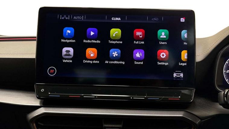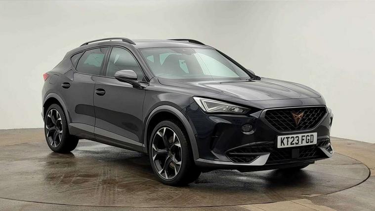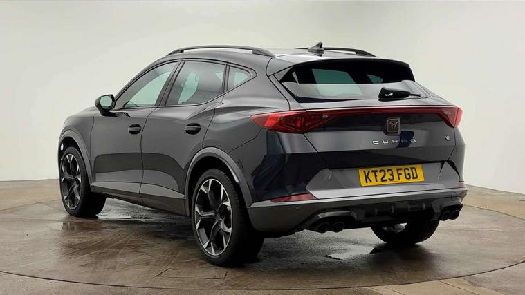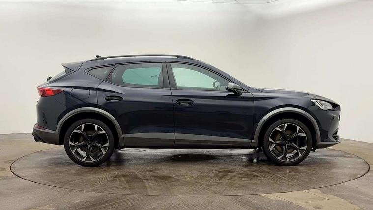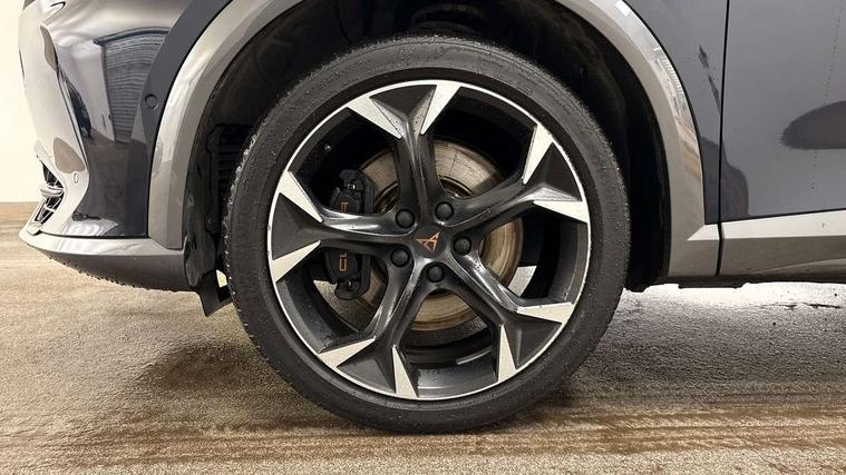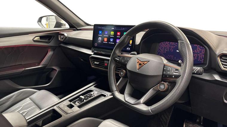 Digital cockpit and configurable dashboard, Driver alert system, Dynamic chassis control with driving profile selection (Comfort, Sport, CUPRA, Individual), Forward collision warning with automatic braking, Lane assist, Navigation system with 12'' Touchscreen Display, Park assist (inc front/rear parking sensors), Predictive adaptive cruise control with speed limiter, RPM, trip computer, outside temp gauge, instrument light brightness, low fuel warning light, lights on reminder, gearshift indicator, Service interval indicator, Speed sensitive power steering, Start/stop system with regenerative braking, Virtual pedal and electric tailgate, Voice control system, Wired Android Auto, Wireless apple carplay, Wireless phone charger, Electronic locking differential and dynamic traction support, Sports suspension with front shock absoption, 2 front and 2 rear USB type C sockets, Auxiliary input socket, DAB radio, Auto dimming rear view mirror, Body colour door handles, Body coloured bumpers, Dark grey wing mirror, Daytime running light with automatic headlight control and coming home feature, Dynamic headlight range control, Electric front/rear windows, Electrically adjustable heated and folding door mirrors with memory function, Front fog lamps with cornering function, Gloss black roof rails and window surrounds, LED Headlights, LED Taillights with dynamic indicator, Rain sensing wipers, Rear diffuser with twin exhaust pipe on each side, Rear side wing doors, Rear wash/wipe, Sports bumpers, Third brake light, Tinted rear windows, VZ logo rear badging, Welcome lights, 12v power supply in centre console, 12V socket, 12v socket in loadspace, 2 front and 2 rear reading lights, 230V socket, 3 seat bench in 2nd row, 60/40 split rear bench seat with armrest and mechanical seat release, Black headlining, Cupra sports pedals, Dust/pollen filter, Front and rear head restraints, Front centre armrest, Height/reach adjust steering wheel, Illuminated interior front door sills, Illuminated sunvisor with mirror, Isofix, Leather heated multi-function sports steering wheel with start stop, CUPRA mode button and gear shift paddles, Luggage tie-down hooks, Single front passenger seat, Three zone climate control with control panel in rear, Variable luggage/load compartment floor, Wraparound lighting, Genuine Nappa leather Pack - Cupra, Safety and driving pack (XL) - Formentor, 3 point seatbelts on all rear seats, ABS, Brake control system - ESC and brake booster, Child proof door locks, Driver and front passenger airbags with front passenger airbag de-activation, Electronic parking brake, Front and rear disc brakes, Front side curtain airbags, Hill hold control, Public e-call, Seat belt reminder for front and rear seats, Tyre pressure monitoring system, Anti theft alarm system, Keyless entry and start system (KESSY), Locking wheel bolts, Copper and aluminium interior detailing, 19" 'Exclusive' machined sport matte black and silver alloy wheels, Space saver spare wheel,