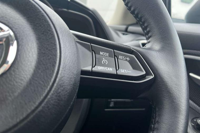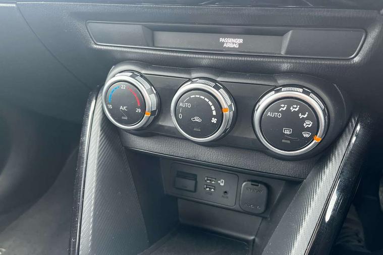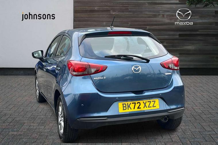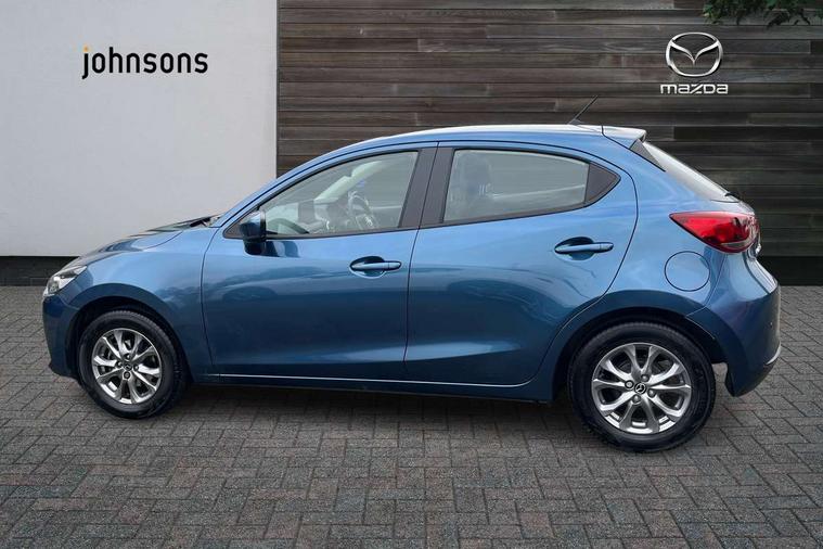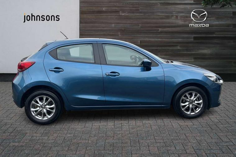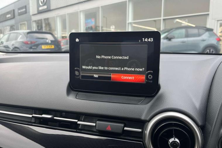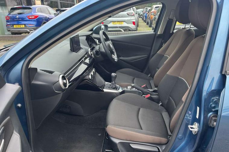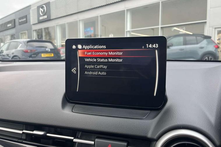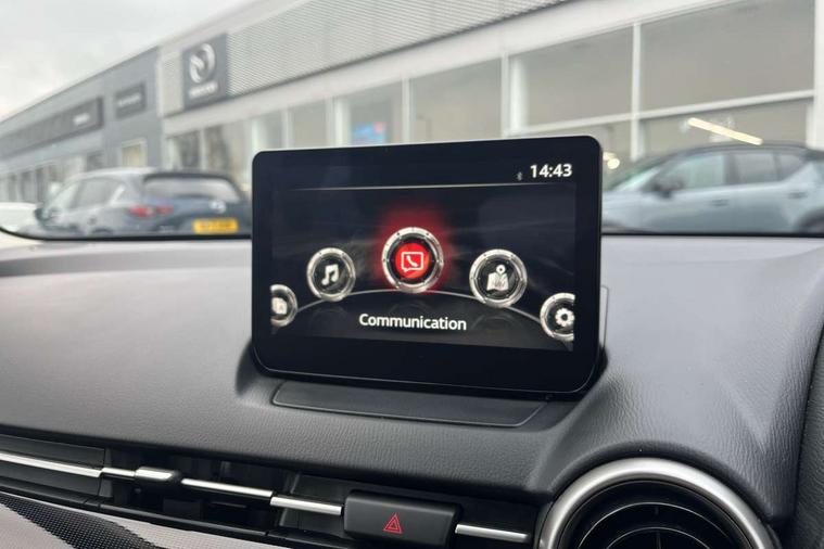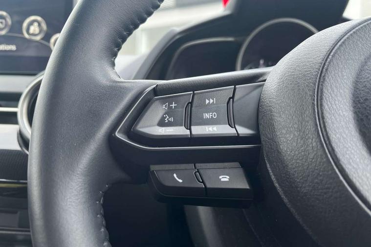 Adjustable speed limiter, Analogue speed display meter, Apple car play/Android Auto, Cruise control, Digital instrument cluster, Digital rev counter, E-call, Emergency stop signalling system, Engine start/stop button, Integrated bluetooth, Lane departure warning system, Lane keep assist, Mazda connect with 8" colour touch screen, Navigation system, PAS, Rear parking sensor, Service indicator, Trip computer, i-stop, AM/FM/DAB radio with 6 speakers with USB and AUX inputs, Multimedia Commander including separate volume dial, Steering wheel mounted audio/bluetooth controls, Auto dimming rear view mirror, Auto headlight levelling, Body colour door mirrors, Body coloured front bumper with black lower bezel, Body coloured rear bumper with black lower mouldings, Chrome finish signature wing on front grille, Coming/leaving home lighting function, Dusk sensing headlights, Electric adjustable/heated/folding door mirrors, Electric front/rear windows with one touch auto up/down for driver's window, Halogen daytime running lights, LED Headlights, LED indicator lights, LED third brake light, Rain sensing front wipers with adjustable sensitivity and speed, Rear side wing doors, Rear wiper, Satin black front grille, 3 seat bench in 2nd row, 60/40 split rear seats, Climate control air conditioning, Cloth upholstery, Driver, Front passenger and two rear grab handles with coathooks, Drivers seat manual slide recline and height adjustment, Drivers/front passengers covered vanity mirrors and drivers ticket holder, Folding rear seats, Front centre storage with two cupholders, Front head restraints, Front passenger and driver door pockets, Front passenger seat manual slide, recline and height adjust, Front passenger seatback pockets, Gear shift indicator, Glovebox, Interior courtesy light with integrated spotlight, ISOFIX child seat anchorage points attached on outer rear seats, Leather handbrake, Leather steering wheel and gear knob, Luggage compartment light, Satin silver dials, Single front passenger seat, Three height adjustable rear head restraints, Tilt/telescopic adjustable steering wheel, 2x3 point front seatbelts with pre-tensioners, 3 point seatbelts on all rear seats, Anti-lock braking system (ABS), Autonomous emergency braking, Collision mitigation braking system, Dynamic stability control + Traction control, ESP, Front and rear curtain airbags, Front driver, passenger and rear seat seatbelt warning, Front dual stage driver and single stage front passenger airbags, Front side airbags, Front smart city brake support, G-Vectoring control plus, Hill launch assist, Manual child lock in rear doors, Passenger airbag cut-off switch, Tyre pressure monitoring system, Deadlocking system, Immobiliser, Power door locks, Remote central locking, Thatcham accredited alarm and immobiliser, Black dashboard, 15" Silver alloy wheels, Emergency tyre repair kit,