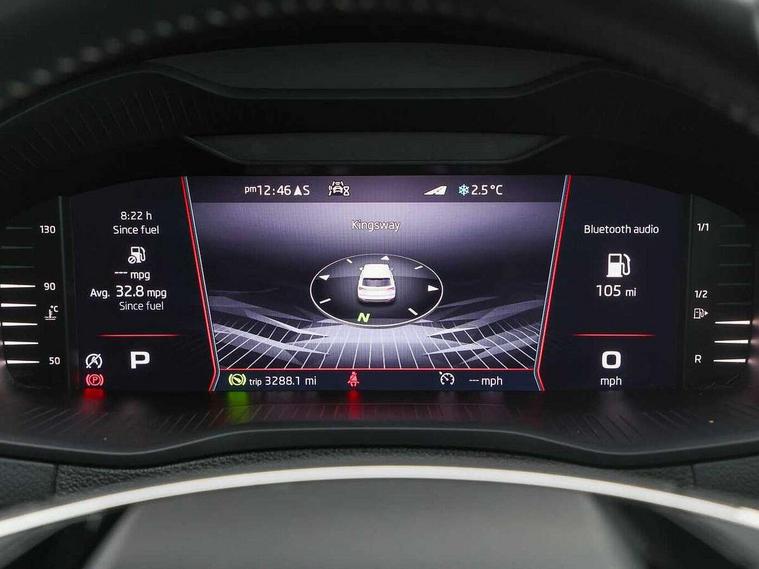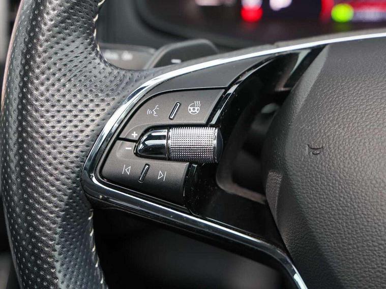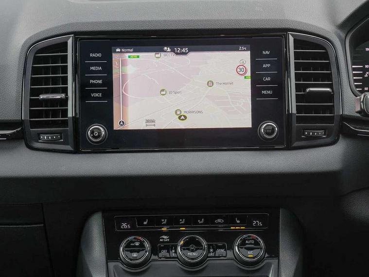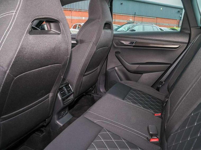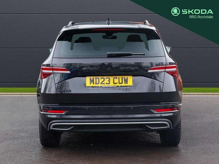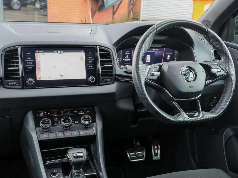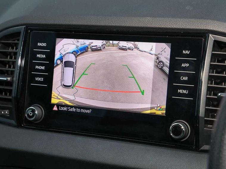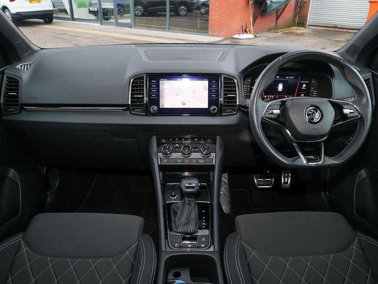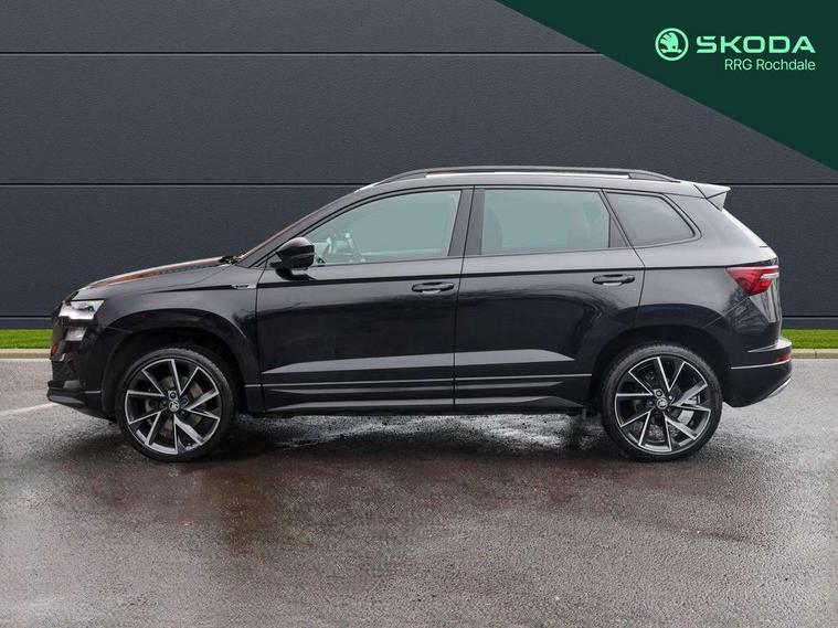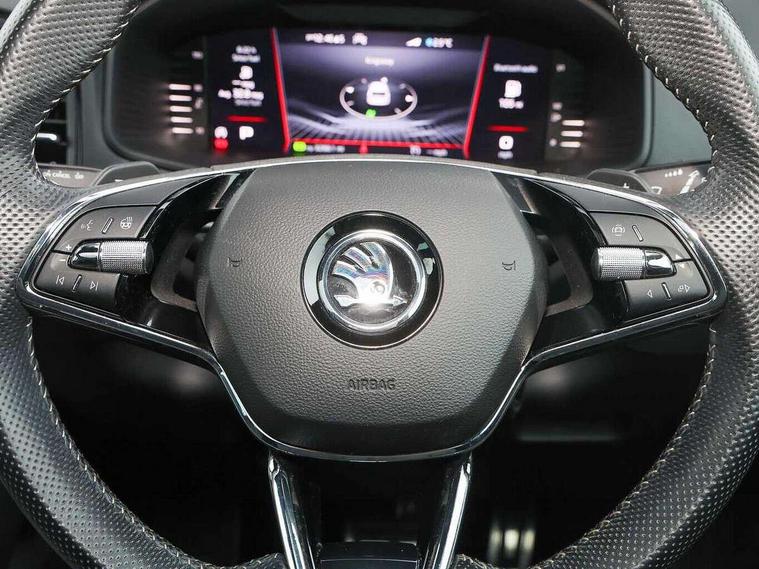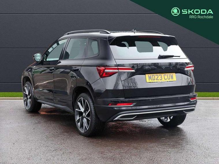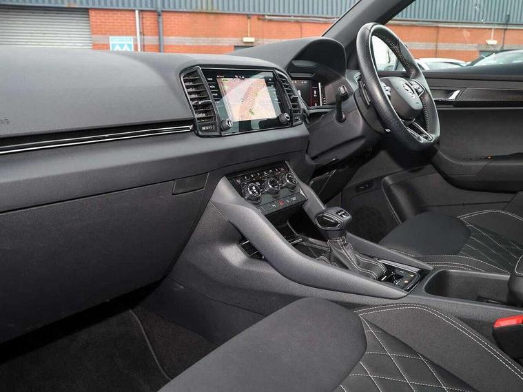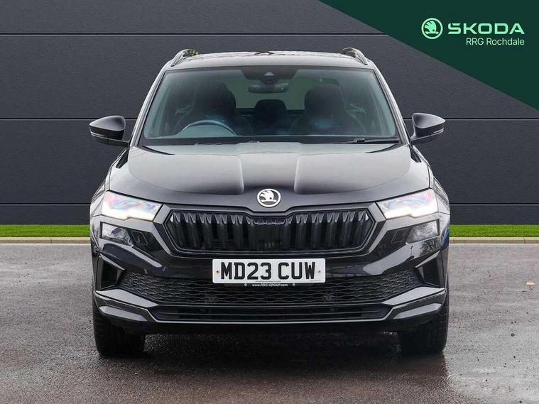 8" Digital display, Care connect, Driver fatigue sensor, Emergency services call system, Outside temperature gauge, Service interval indicator, SmartLink wireless for Apple and wired for Android, Start/stop system with regenerative braking, USB C Port x 2 in front centre console, Virtual cockpit, Virtual pedal with electrically operated boot door, 8 Speakers, DAB radio with Bluetooth, USB connection, Wireless charging without wireless aerial connection, Acoustic glass, Aero front windscreen wipers with intermittent function, Auto dimming rear view mirror with light and rain sensors, Black door mirrors, Black electric window control buttons, Black radiator grille, Black roof rails, Body colour door handles, Dynamic headlight range control with cornering light function, Electric front and rear windows with child proof lock, Front door steps with SportLine logo, Heated rear windscreen, LED daytime running lights, LED rear lights with high functionality welcome effect and dynamic indicators, Light assistant (coming/leaving home/tunnel light), Panoramic sliding sunroof, Plastic scuff plates, Privacy glass, Protective door side sills in body colour, Rear diffuser, Rear side wing doors, Rear spoiler, Rear window wiper with washer system and intermittent control, Safety reflectors on front doors, Skoda lettering on tailgate in black, Sportline badge on front fender, Sportline decorative inserts with badging, Sports front and rear bumpers, 1.5 litre bottle holders in driver and front passenger door panels, 12V socket in boot, 12v socket in front centre armrest with storage compartment and rear air vents, 3 rear height adjustable headrests, 3 seat bench in 2nd row, 3 spoke leather sports multifunction steering wheel and silver stitching with gear shift paddles, 4 foldable roof handles with rear coat hooks, Black floor carpet, Black roof headlining, Chrome inner door handles, Double sided boot floor, Foldable hooks in the boot, Front head restraints, Height adjustable front three point seats belts with tensioners, Height/reach adjust steering wheel, Ice scraper, Illuminated glovebox, Illuminated luggage compartment, Isofix child seat preparation outer rear, Manual lumbar support for front seats, Pen holder, Pollen filter, Rear boot cover, Rear reading lights, Rear seats fixed folding and divided 60:40, Rubbish bin door, Safety vest holder, Single front passenger seat, Storage box in upper central dashboard closed, Sunvisors with illuminated vanity mirrors, Textile floor mats, Ticket holder, Titan black interior ceiling, Welcome animation with sportline logo, Boot pack - Karoq, Light Pack - Karoq, Parking pack - Karoq, Automatic door unlocking in case of crash, Automatic fuel cut off in case of crash, Child locks on rear doors, Driver airbag, Electronic parking brake with auto hold function, Emergency rear braking signal, ESC including ABS, MSR, ASR, EDS, HBA, DSR, RBS, MKB and traction control, Front side airbags, Hill hold control, Knee airbags, Passenger airbag with switch-off function, Pedestrian monitor, Seatbelt reminder signalisation and pretensioner for all seats, Three point seatbelts rear, Two tone horn, Tyre pressure display, Tyre pressure monitor, Alarm with interior monitoring, back up horn and tilt sensor with safe function, Electronic engine immobiliser, Keyless entry and start/stop, Remote central locking with 2 remote folding keys, Black air vent surround, Black centre console, Satin black dashboard, Satin black door trim, 19" Vega black polished alloy wheels, Anti-theft wheel bolts protection, Matt black aero hub caps, Storage on wheel cover, Tool kit,