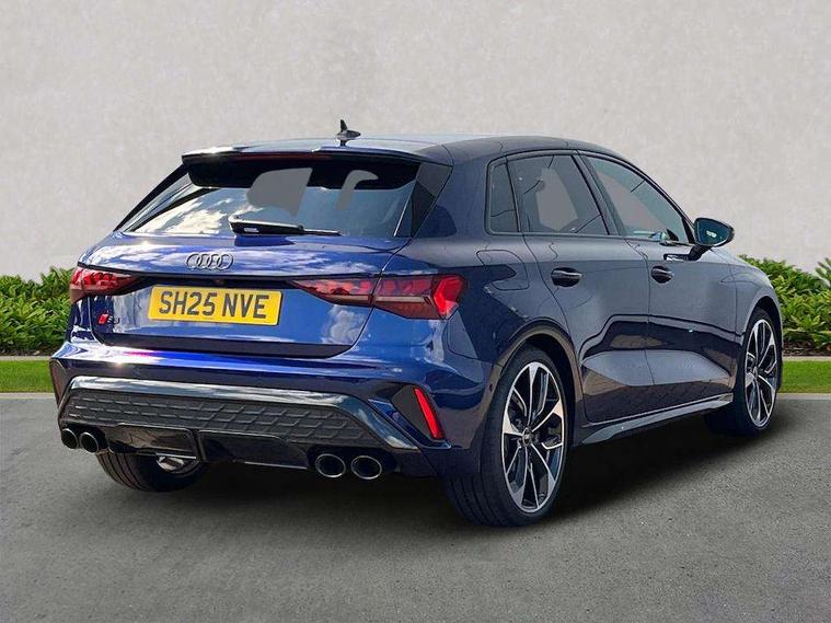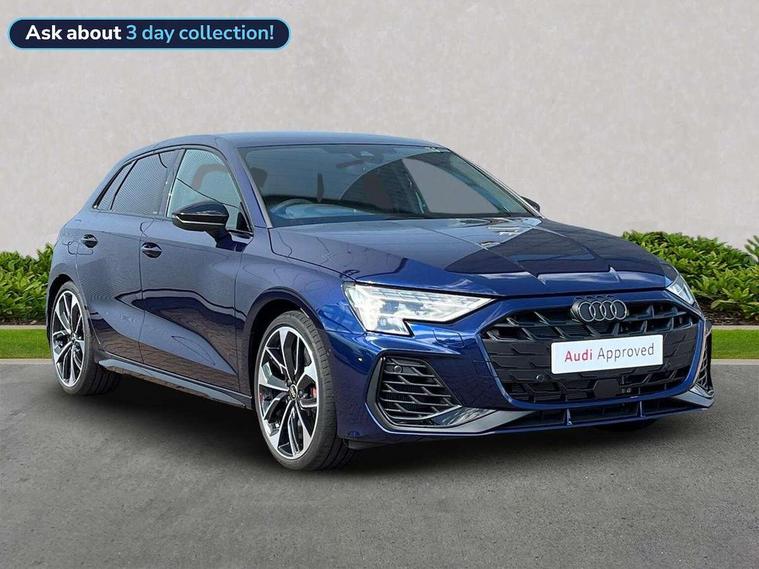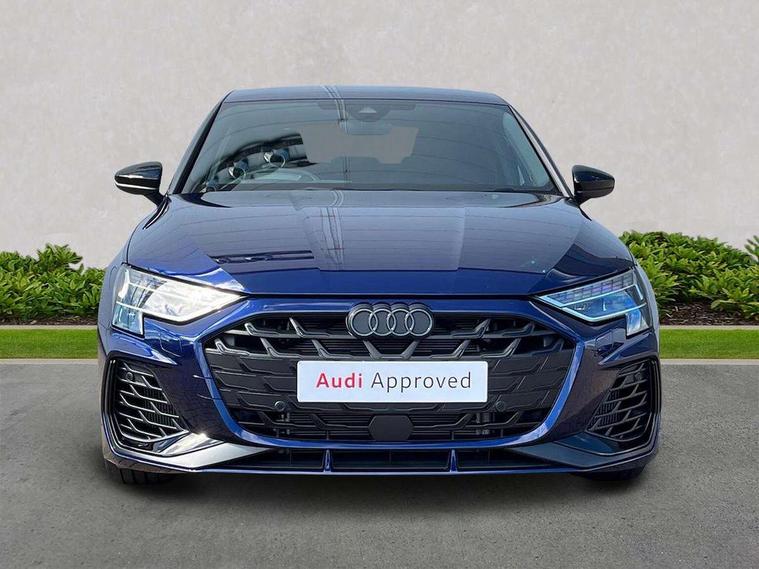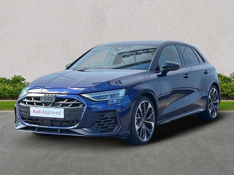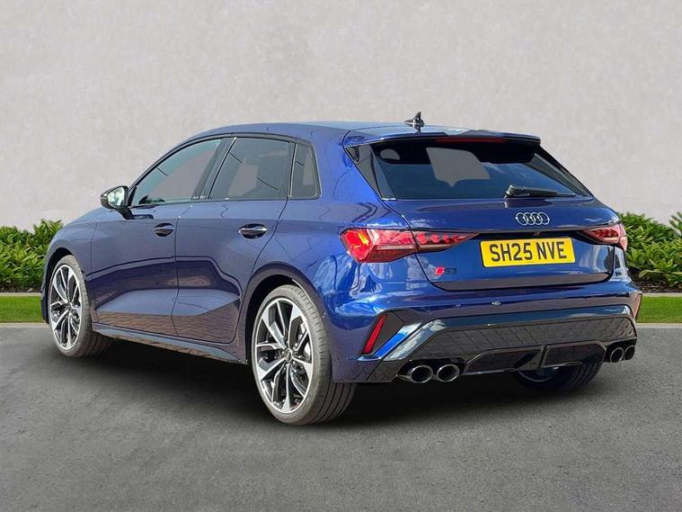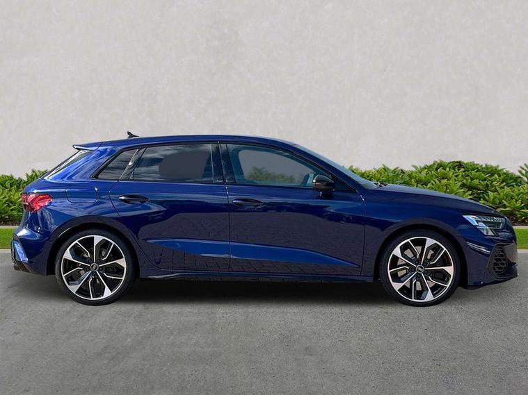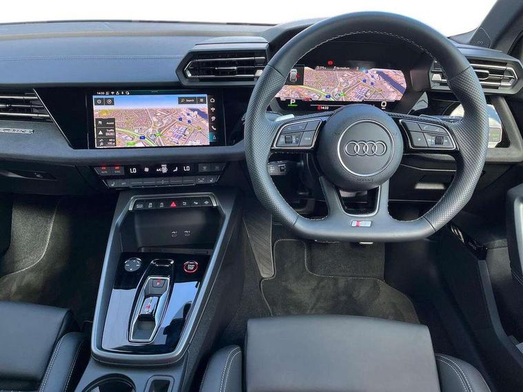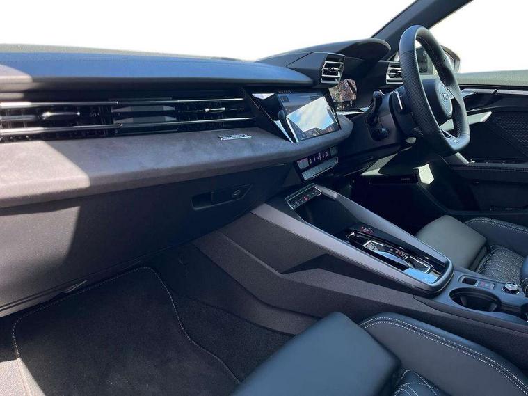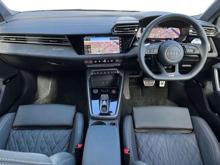 Adjustable speed limiter, Audi drive select, Audi smartphone interface with app store includes wireless Apple carplay, Android auto and Amazon alexa integration, Audi virtual cockpit plus - 12.3" full HD resolution dynamic digital instrument cluster, Automatic start/stop system with recuperation, Bluetooth interface, Camera based traffic sign recognition, Collision avoidance assistant, Distraction and Fatigue warning, e-Call (emergency call), Emergency assist, Lane departure warning system, MMI Navigation Plus with high resolution 10.1" colour touch screen display, Park Assist with parking system Plus, Progressive steering, Service indicator, Tailgate, Trip computer, Voice control system with natural language interaction, quattro permanent all-wheel drive with torque splitter, S sport suspension with spring damper adjustment and lowering by 15mm, Audi Phonebox light with wireless charging, DAB Digital radio, USB ports with charging function in the rear, All weather light, Anthracite grey Audi rings (front and rear), Audi Beam uses LEDs to project the rhombus S logo onto the ground as you exit your S3, Auto dimming frameless rear view mirror, Automatic dynamic range control, Black accents front and rear bumpers including air inlets, Black accents in front grille and frame, Black accents in window trims, Dipped beam, main beam, position light and turning light, Electrically adjustable/heated/folding/auto dimming door mirrors with integrated LED indications + kerb view function for passenger side, Exterior model badging, Front electric windows, Headlight washers, Heat insulating glass windscreen, Illuminated door sills with aluminium inserts at the front with S logo, Intersection light, LED 3rd brake light, LED brake lights, LED daytime running x3, LED headlights with LED rear lights and dynamic rear indicators, LED rear number plate lights, LED reverse light, LED tail lights, Light and rain sensors, Manoeuvring light, Motorway light, Privacy glass - dark tinted rear window, rear door and side windows, Rear diffuser and grill in grained matt black with inlay in dark liquid chrome, Rear electric windows, Rear side wing doors, Rear wiper, S grille, S3 front bumper with S specific air intake grilles, S3 roof spoiler, Static cornering light, 12V socket and storage compartment in front centre console, 3 seat bench in 2nd row, 3 spoke flat bottomed leather multifunction sport steering wheel with gear shift paddles, 3-zone deluxe automatic air conditioning, 4 way electrically adjustable lumbar support for driver and front passenger, 40/20/40 split folding rear seat bench, Black cloth headlining, Black front and rear floor mats, Fine Nappa leather upholstery with front sports seats S embossed logo, Front and rear centre armrest in artificial leather with contrasting stitching on armrests and instrument panel, Front and rear headrests, Heated front seats, Height and reach adjustable steering wheel, Manual boot compartment lid, Manually adjustable front seats, Rear centre armrest with cupholder, S badging on the steering wheel, Seat side bolsters, Single front passenger seat, Stainless steel pedals and front footrest in black, Aluminium interior elements pack - A3, Storage package - A3, Technology package - A3, 3x3 point rear seat belts, Driver and front passenger airbag with passenger airbag deactivation, Electronic Stabilisation Control (ESC) including ABS, ASR and EDL, First aid kit with warning triangle and 2 safety vests, Front side airbags with head airbags and interaction airbag, Hill hold assist, Pre-sense front with pedestrian and cyclist detection, Seatbelt monitoring, Tyre pressure loss indicator, Anti theft alarm, Anti-theft wheel bolts, Electronically operated child locks, Immobiliser, Remote central locking with safelock, Black dashboard, Tyre repair kit,