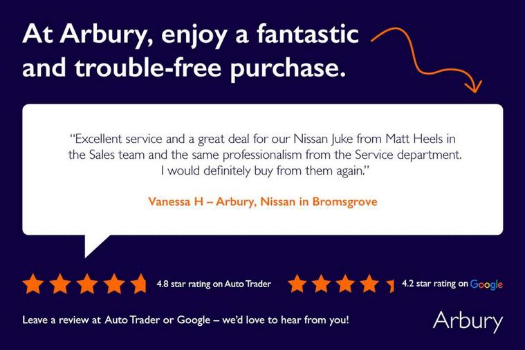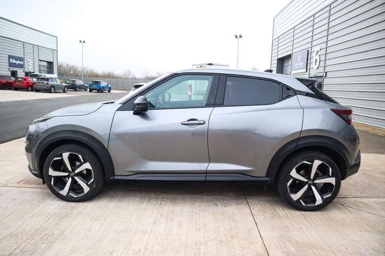 7" full colour TFT screen combimeter, Apple CarPlay and Google Android auto, Drive modes select (Eco, normal and sport), Emergency and breakdown call, Front parking sensor, Idle start/stop system, Intelligent lane intervention, Lane departure warning system, Nissan connect 8" touch screen entertainment system, Nissan connect nav with TomTom traffic, Nissan connect services and Wifi connection, Outside temperature sensor, Power Steering, Rear parking sensor, Traffic sign recognition, Trip computer, Voice recognition, Gasoline particulate filter, 10 Bose speakers 6 speakers and 2 headrest speakers for driver/passenger seats, Bluetooth system, USB, Aux-in and 12V socket, Bose personal sound stage control, DAB Digital radio, Rear console USB port, Auto dimming interior rear view mirror, Auto headlights, Automatic hazard signal with emergency stop signal, Body colour bumpers, Body colour door handles, Electrically adjustable door mirrors with integrated indicators, Follow me home headlights, Front and rear electric window with one touch driver window, Heated and auto folding door mirrors, High beam assist, LED daytime running lights, LED front fog lights, LED headlamps, LED rear fog lamp, LED rear lamps, Rain sensor windscreen wipers, Rear privacy glass, Rear side wing doors, Rear wiper, Thermaclear heated windscreen, Three blink turn signal, 3 height adjustable rear headrests, 3 seat bench in 2nd row, 60/40 split folding rear seat, Automatic climate control, Card holder on driver sunvisor, Door ambient lighting, Driver and passenger sliding and reclining seats, Driver seat back pocket, Driver side rear coat hanger, Driver/passenger sunvisors and vanity mirrors, Front and rear cabin lights, Front armrest, Front door pockets with bottle holders, Front head restraints, Front passenger isofix child seat anchorage point, Front/rear passenger grab handles, Gear console ambient circle lighting, Grey synthetic leather kneepad, Heated front seats, Height adjustable driver's seat, Height adjustable passenger seat, Internal chrome door handles, Leather gearshift knob, Leather steering wheel, Luggage board, Luggage space lighting, Monoform sporty seats, Multifunction steering wheel, Passenger seat back pocket, Rear door bottle holders, Single front passenger seat, Synthetic leather upholstery, Telescopic steering wheel adjustment, Two cupholders in front centre console, Two rear isofix child seat anchorage points with top tether, Welcome light and console tray ambient lighting, Advanced safety shield pack - Juke, ABS with EBD and brake assist, Active ride control, Active Trace Control, Driver and passenger airbags, Driver and passenger side airbags, Electric handbrake with auto hold function, Electronic Stability Programme (ESP), Front and rear curtain airbags, Height adjustable seatbelts, Hill start assist, Intelligent emergency braking with pedestrian and cyclist recognition, Rear door child safety locks, Seatbelt reminder for driver/front passenger and rear seats, Single tone horn, Three 3 point rear seatbelts, Traction control, Tyre pressure monitoring system, VDC Dynamic Vehicle Control, Ventilated rear brake discs, Alarm, Immobiliser, Intelligent key and start push button with walk away lock and approach unlock functions, Remote central locking,