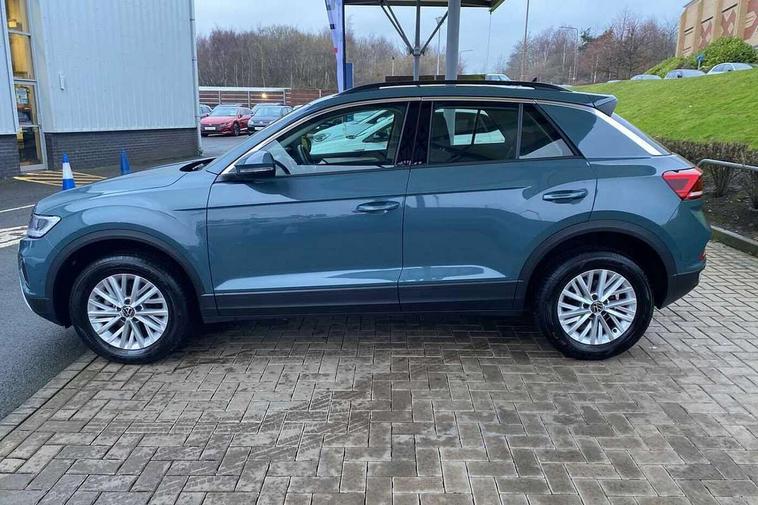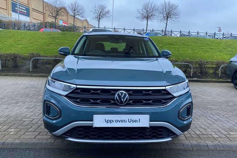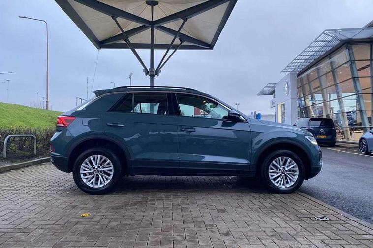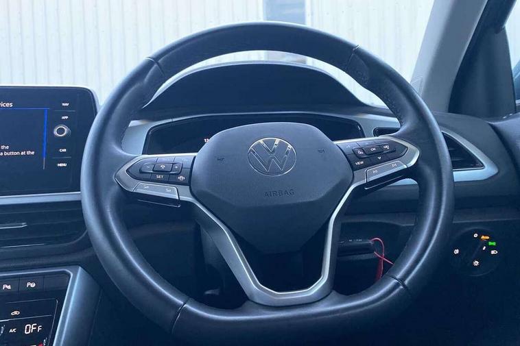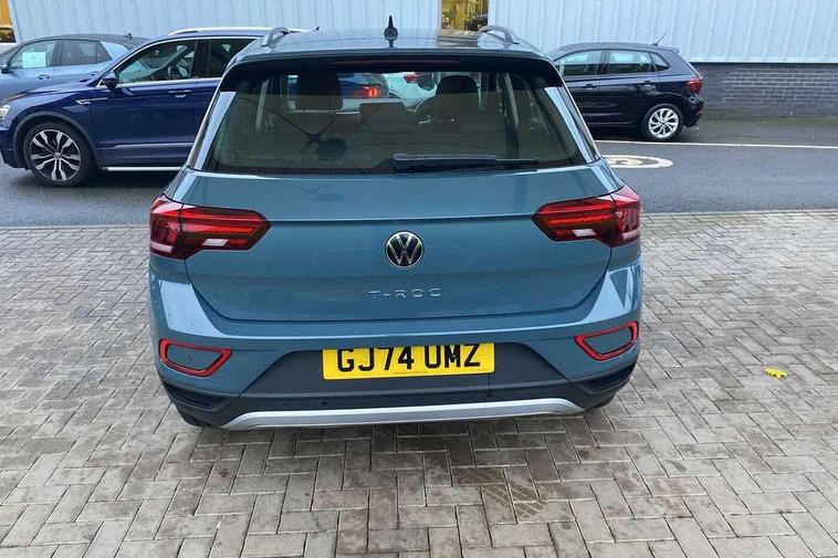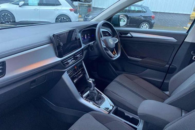 Advanced driver attention and drowsiness monitor, Dynamic road sign display, Emergency call service, Lane keeping system Lane Assist, Mobile phone interface, Modified key software - reduce switch off time for key status change to Long no motion, Online services, Park assist including front and rear parking sensors, Power assisted speed sensitive steering, Service interval indicator, Tailgate/trunk lid release from outside, Think blue trainer driver tips and journey analysis, Warning sound and light for front seatbelts unfastened, Wireless app connect, Battery regeneration during braking, Front shock absorption, Rear shock absorption chassis with increased ride height, Start/stop function with battery regeneration, DAB Digital radio, Diversity antenna for FM reception, Front and rear 6 speakers, Music playback - MP3, WMA and AAC files, Premium USB cable in choice of either Apple or Android smartphone compatibility, SD card slot, Simultaneous pairing of 2 compatible mobile devices, Title and cover art display, We Connect and We Connect Plus functionality, Auto dimming interior rear view mirror, Automatic hazard lights activation under emergency braking, Automatic headlight control with LED separate daytime running lights with coming/leaving home function, Black roof rails, Body coloured bumpers and radiator grille with chrome trim and front fog lamps with chrome bezel, Body coloured exterior mirror housings and door handles, Electrically adjustable and heated door mirrors, Extended roof spoiler, Exterior mirrors aspherical on driver side, convex on front passenger side, External USB type C socket and charging sockets, Front windscreen wiper with intermittent wipe and 4 position delay, Heated rear window, LED 3rd brake light, LED rear combination lamps, LED rear number plate lights, Power windows with comfort operation and circuit breaker, Rain sensor, Rear exhaust tailpipe, Rear fog light on one side and reversing lights on both sides, Rear side wing doors, Rear wash/wipe with intermittent wipe setting, Remote electrically foldable door mirrors, puddle lights and reverse activated passenger's door mirror, 12V power socket in centre console, 3 rear head restraints, 3 seat bench in 2nd row, 4 load lashing points in luggage compartment, Air care climatronic air conditoning system with active combination filter and 2-zone temperature control, Ambient lighting with mirror logo projection, Cloth upholstery, Door and side trim panel in cloth, Drawer under drivers seat, Driver/front passenger seat height adjustment, Front centre armrest, Front comfort sports seats, Front cupholders x 2, Front reading light, Front seat back storage pockets, Glove compartment door with light, Instrument lighting, white adjustable panel illumination, Interior light delay, Isofix child seat preparation, Leather gearshift handle, Load-through provision with cup holder when folded down ('Unsplit rear seat bench, split folding backrest, with centre armrest), Luggage compartment lighting, Lumbar support for driver's and front passengers seat, Non-folding front passenger seat backrest, Single front passenger seat, Storage compartment in left and right luggage area, Storage compartment in rear doors, Storage compartments in driver and front passenger doors, Sunvisors with illuminated vanity mirrors, Variable boot floor, height adjustable and removable, Driver assistance pack without proactive passenger protection - T-Roc Life/Match, 3 point height adj front seatbelts + pretensioners, 3 point seatbelts in outer rear with ECE label, ABS, Child locks on rear doors, City emergency braking and pedestrian monitoring, Driver and front passenger airbag with front passenger airbag deactivation, Driver and front passenger safety-optimised head restraints, Drivers seatbelt reminder, Electronic parking brake, Electronic Stability Control (ESC) inc EDL (Electronic Differential Lock) and ASR (Traction Control), Front and rear passengers curtain airbag system including front side airbags, Front disc brakes, Hill start assist, Predictive pedestrian protection, Rear disc brakes, Two tone horn, Tyre pressure loss indicator, Volkswagen roadside assistance, Alarm with interior protection, Pewter matt decorative inserts for intrument panel, centre console and door panels at the front, Trims for alloy wheels,