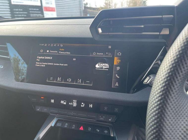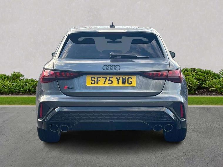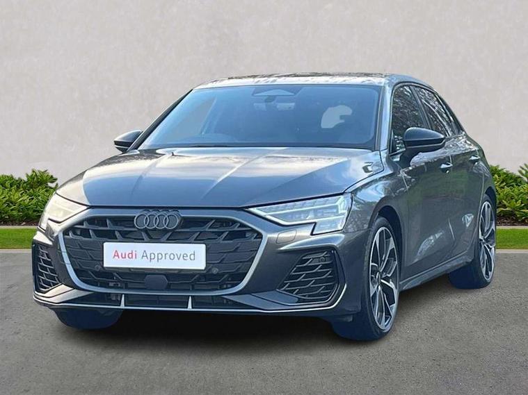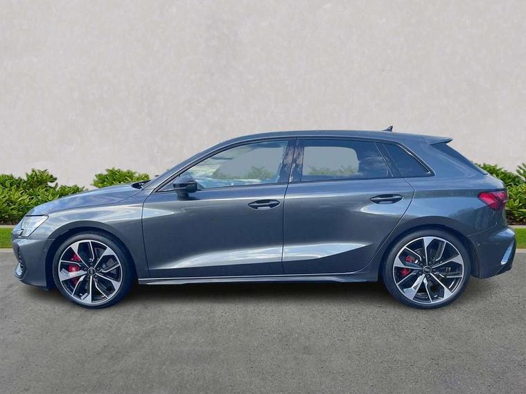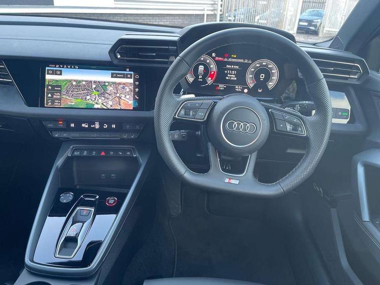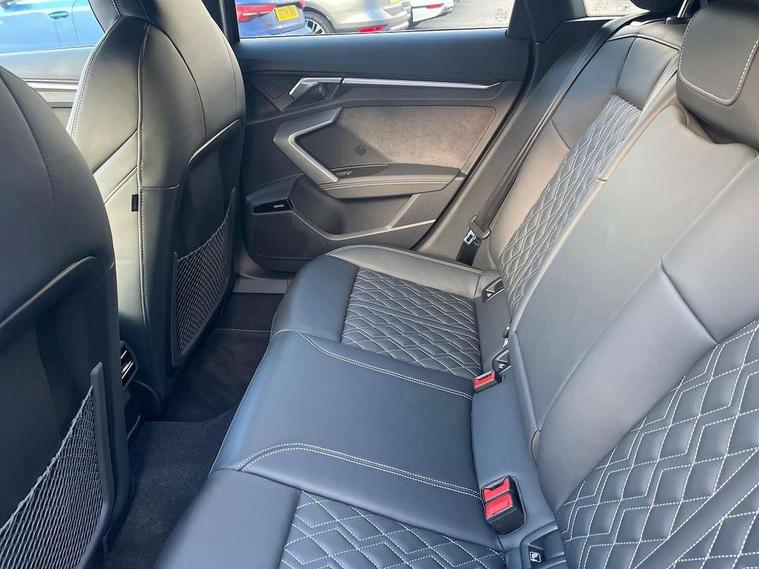 Adaptive cruise control (ACC), Adjustable speed limiter, Audi drive select (Auto, Comfort, Dynamic, Efficiency and Individual), Audi virtual cockpit plus - 12.3" full HD resolution dynamic digital instrument cluster, Automatic start/stop system with recuperation, Bluetooth interface, Camera based traffic sign recognition, Collision avoidance assistant, Driver attention and fatigue detection, e-Call (emergency call), Emergency assist, Intersection assist, Lane departure warning system, MMI Navigation Plus with high resolution 10.1" colour touch screen display, Park Assist with parking system Plus, Progressive steering, Reversing camera, Service indicator, Smartphone interface with app store includes wireless Apple carplay, Android auto and Amazon alexa integration, Trip computer, Voice control system with natural language interaction, quattro permanent all-wheel drive with torque splitter, S sport suspension with spring damper adjustment and lowering by 15mm, Audi Phonebox light with wireless charging, DAB Digital radio, USB ports with charging function in the rear, Anthracite grey Audi rings (front and rear), Audi Beam uses LEDs to project the rhombus S logo onto the ground as you exit your S3, Auto dimming frameless rear view mirror, Black accents front and rear bumpers including air inlets, Black accents in front grille and frame, Black accents in window trims, Electrically adjustable/heated/folding/auto dimming door mirrors with integrated LED indications + kerb view function for passenger side, Exterior model badging, Front and rear side air inlets in grained matt black with dark liquid chrome frame, Front electric windows, Front radiator grill in high gloss dark chrome, Heat insulating glass windscreen, Illuminated door sills with aluminium inserts at the front with S logo, LED 3rd brake light, Light and rain sensors, Privacy glass - dark tinted rear window, rear door and side windows, Rear diffuser and grill in grained matt black with inlay in dark liquid chrome, Rear electric windows, Rear side wing doors, Rear wiper, S grille, S3 front bumper with S specific air intake grilles, S3 roof spoiler, Side sill trim in dark liquid chrome, 12V socket and storage compartment in front centre console, 3 seat bench in 2nd row, 3 spoke flat bottomed leather multifunction sport steering wheel with gear shift paddles, 3-zone deluxe automatic air conditioning, 4 way electrically adjustable lumbar support for driver and front passenger, 40/20/40 split folding rear seat bench, Black cloth headlining, Black front and rear floor mats, Fine Nappa leather upholstery with front sports seats S embossed logo, Front and rear centre armrest in artificial leather with contrasting stitching on armrests and instrument panel, Front and rear headrests, Heated front seats, Height and reach adjustable steering wheel, i-Size child seat mounting on the front passenger side and outer rear seats, i-Size and top tether on the outer rear seats, Manual boot compartment lid, Manually adjustable front seats, Rear centre armrest with cupholder, S badging on the steering wheel, Seat side bolsters, Single front passenger seat, Stainless steel pedals and front footrest in black, Aluminium interior elements pack - A3, Storage package - A3, Technology pack with Matrix LED headlights - A3, 3x3 point rear seat belts, Driver and front passenger airbag with passenger airbag deactivation, Electronic Stabilisation Control (ESC) including ABS, ASR and EDL, First aid kit with warning triangle and 2 safety vests, Front side airbags with head airbags and interaction airbag, Hill hold assist, Pre-sense front with pedestrian and cyclist detection, Seatbelt monitoring, Tyre pressure loss indicator, Anti theft alarm, Anti-theft wheel bolts, Electronically operated child locks, Immobiliser, Black dashboard, Tyre repair kit,