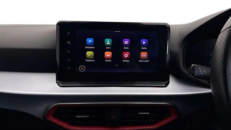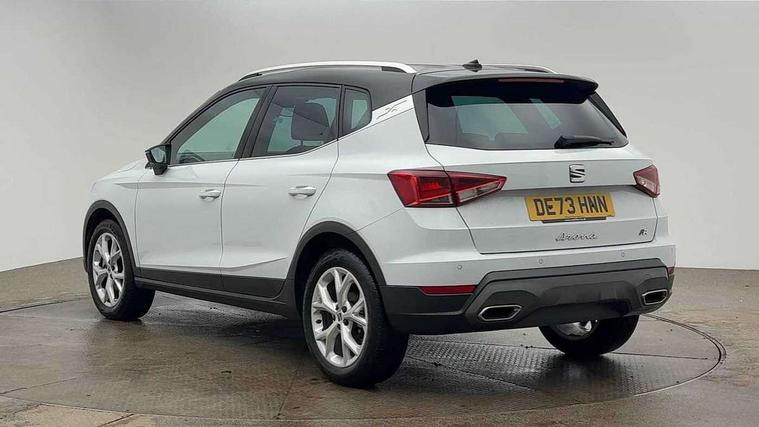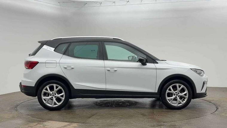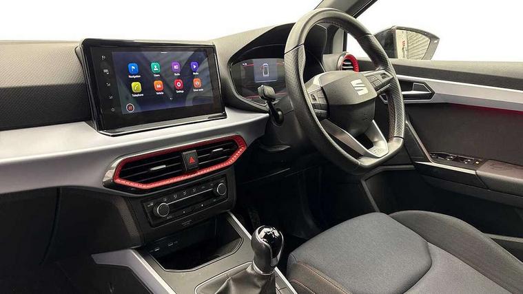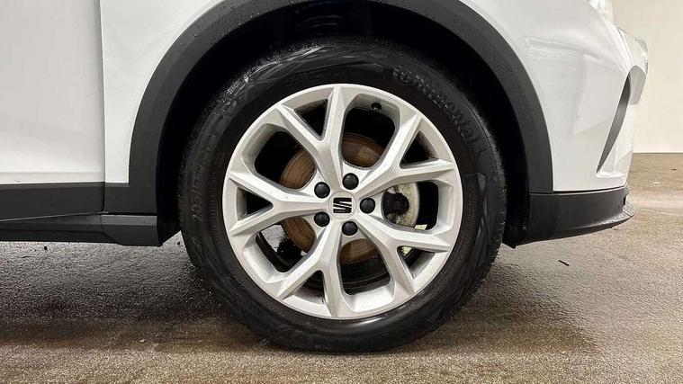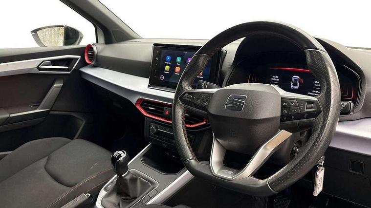 'Lights On' Reminder warning buzzer, 8" Digital cockpit, Digital clock, E-call, Electric speed sensitive power steering, Full Link Smartphone Integration with Mirror Link, Apple Car Play, Google Android Auto with USB Type C cable for Apple and Android compatibility, Lane keeping system, Low fuel warning light, Outside temperature display, Rear parking sensor, RPM counter, Seat connect with safety, service, remote and online, SEAT Drive profile - Four different models normal-sport-eco-individual, steering response, throttle response, Trip computer, Wireless phone charger, 9.2" colour touchscreen with navigation system, voice control and USB port (type c), Bluetooth interface for hands free and audio streaming, DAB digital radio and AM/FM radio, Steering wheel mounted audio controls, Anti theft roof antenna, Auto dimming interior rear view mirror, Automatic activation of hazard warning lights, Body coloured bumpers, Body coloured door handle inserts, Chrome roof rails and window surrounds, Dark tinted rear windows, Electric front/rear windows, Electrically adjustable, heated and folding door mirrors, Front fog lights with cornering function and rear fog light, FULL LED automatic headlights with dynamic headlight range control, coming and leaving home, LED daytime running lights, LED rear tail lights and licence plate lights, Protective side mouldings, Rain sensing wipers, Rear side wing doors, Rear spoiler, Rear window wash/wipe, Roof colour door mirrors, Third brake light, Twin exhaust pipe styling hidden exhaust pipe, Visible VIN plate, Windshield wiper with intermittent control and potentiometer, 2 cupholders, 3 seat bench in 2nd row, 60/40 split folding rear seat, Aircare filter, Black interior roof, Cloth upholstery, Double boot floor, Driver sunvisor with covered mirror + card holder, Dual zone climate control, Front courtesy light with front reading lights, Front sport seats, Gear shift indicator, Height adjustable front seats, Height/reach adjustable steering column, Illuminated boot, Instrument lighting with brightness control, Interior ambient lighting, Interior light in footwell, central console and door panel, ISOFIX points in outer rear seats with top tether anchorage points, Passenger sunvisor with vanity mirror, Perforated flat bottomed leather steering wheel/gear knob/handbrake with red stitching and FR logo, Single front passenger seat, Two front and three rear height adjustable headrests, Interior chrome pack - Arona, 3 point seatbelts on all rear seats, ABS, Active front headrests, Child locks on rear doors, Driver and front passenger airbags with front passenger airbag de activation, front side and curtain airbags, Electronic stability control, Emergency Brake Assist (EBA) and front assist, Front and rear seatbelt reminder, Hill hold control, Multi-Collision braking, Tiredness recognition system, Traction control, Tyre pressure monitoring system, Alarm with back-up horn, Electronic engine immobiliser, Locking wheel bolts, Remote central locking + deadlocks, Tow away protection, Titan black dashboard, 17" Dynamic alloy wheels,