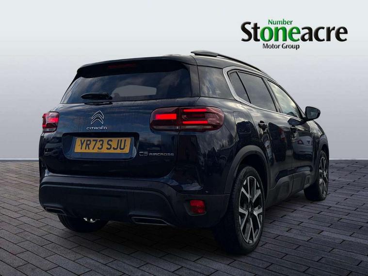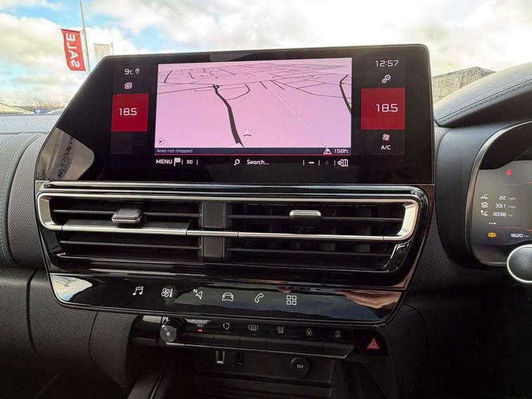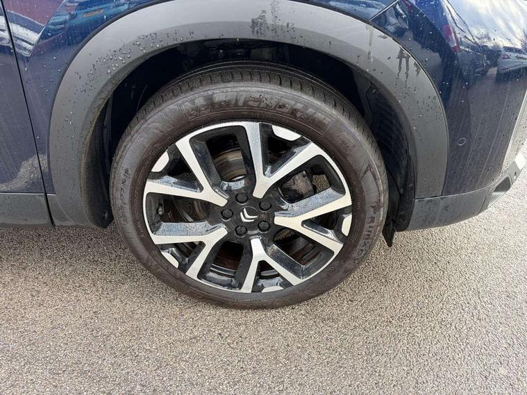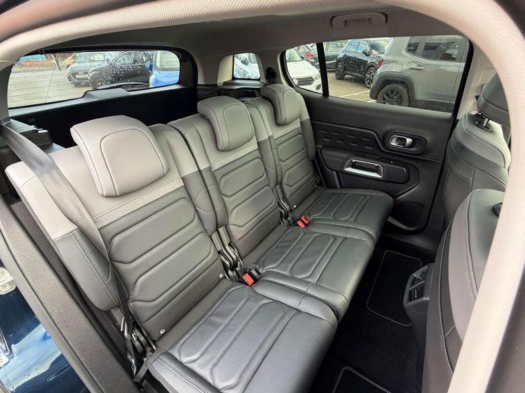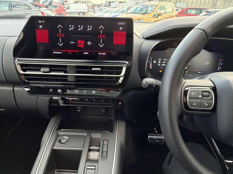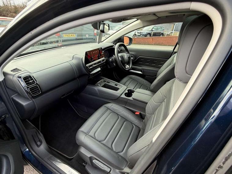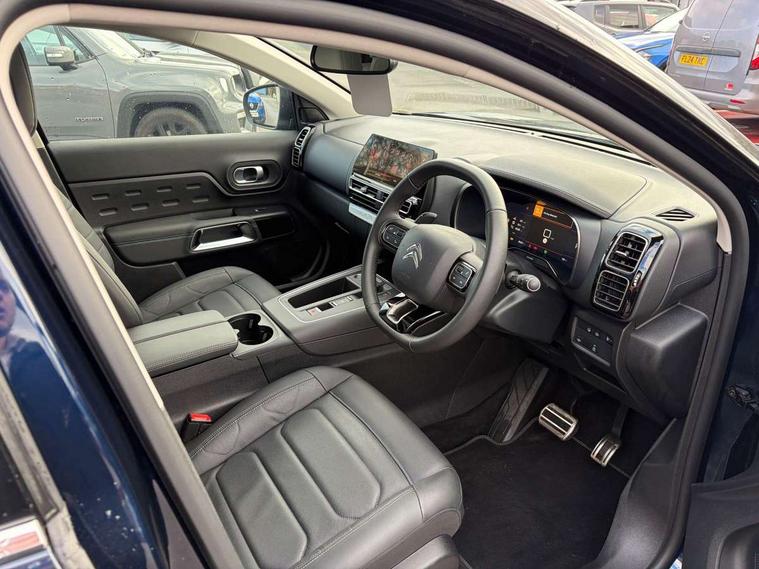 10" Touchscreen user interface with citroen connect nav, voice commands, Bluetooth handsfree and audio streaming, 12.3" digital instrument cluster with customisable zones and colour schemes, Citroen connect box emergency assist system, Citroen connect play featuring android auto and apple carPlay, Electric power steering, Motorised electric tailgate with hands free access, Multi function trip computer, Smartphone wireless charging plate, Advanced comfort suspension, Auxiliary input socket, FM and DAB digital radio, 6 speakers, Polyphonic sounds, USB A socket (charge only) on rear part of central console, 3rd brake light, Acoustic laminated front side windows, Acoustic laminated windscreen with rain and brightness sensors, Automatic hazard light activation upon heavy brake application, Automatic headlights with welcome and goodbye lighting, Body colour door handles, Body colour front bumper with air curtain, silver painted skid plate, and matt black lower section, Body colour rear bumper, C-Series edition exterior detail and badging, Electric heated and folding door mirrors with LED approach lighting and blind spot monitoring indicators, Electrochrome auto dimming interior rear view mirror, Front fog lights with static cornering function, Gloss black longitudinal roof bars, Glossy black door mirrors, Glossy black structured grille, LED headlights with LED daytime running lights and visual signature, LED rear lights with visual signature, Magic wash automatic windscreen wipers with flat blades, variable speed depending on vehicle speed, and windscreen washers integrated into the wipers, Panoramic glass sunroof with opening front portion and electric sliding sunblind, moves rear reading lights to sides of ceiling, Perla nera black bi-tone roof, Radio aerial integrated into rear window, Rear side wing doors, Rear window wiper with intermittent facility, linked to reverse gear, Sequential electric front and rear side windows with anti pinch function, Stainless steel front door thresholds, Stainless steel window finishers, Tinted row 1 windows and dark tinted row 2, C-Pillar and tailgate windows, 12V power outlet and 2x USB-A sockets (1x charge+data, 1x charge only) on front part of central console, 12V socket in boot, 2 Position boot floor, 3 point ISOFIX mountings on front passenger and rear outer seats, 4 way adjustable steering column, Adjustable headrests (2 in front, 3 in rear), Advanced comfort front and rear seats, Aluminium pedals and foot rest, Automatic bi-zone air conditioning with active carbon filter and air quality system, plus controllable row 2 air diffuser, Boot light, Central storage box with opening central armrest and interior lighting, Dashboard storage area to right of driver, open storage at front of central console, glovebox with smooth opening and lighting, e-Toggle automatic gearbox selector, Front + rear carpet mats, Front door storage can hold 1.5 litre bottle and A4 size documents, B-pillar coat hooks, rear door storage, central storage under armrest, Manual driver lumbar adjustment, Manual front passenger seat adjustment (height, slide, backrest angle), Map pockets in rear of front seats, Multi function leather steering wheel with two command blocks, Single front passenger seat, Three individual sliding seats with adjustable backrest and flat floor function, Two open cupholders with LED lighting in central console, City camera pack with front and rear parking sensors - C5 Aircross, Drive assist pack - C5 Aircross/Highway driver assist, LED interior lighting - - C5 Aircross, 3 rear 3-point seatbelts (outer seats featuring force limiters), ABS/EBD, Adaptive driver and front passenger airbags with passenger airbag deactivation function, Collision risk alert, Driver and front passenger side airbags, DSC (Dynamic Stability Control) and ASR (Electronic Anti-skid System), Electronic parking brake, ESP including traction control and stability programme, Front seat belts with double pretensioning, force limiters and height adjustment (driver and passenger), Front ventilated disc brakes and rear disc brakes, Head curtain airbags covering rows 1 and 2 (left and right), Hill start assist, Manual child lock in second row, Seatbelt unfastened audible alert, Two tone horn, Tyre under inflation indicator, Anti theft alarm with perimetric and volumetric protection, plus tilt sensor, Anti theft locking wheel nuts, Automatic door and tailgate locking with automatic unlocking in case of collision, Electronic code immobiliser, Keyless entry and start, Remote central locking + deadlocks, Compressor with puncture repair kit,