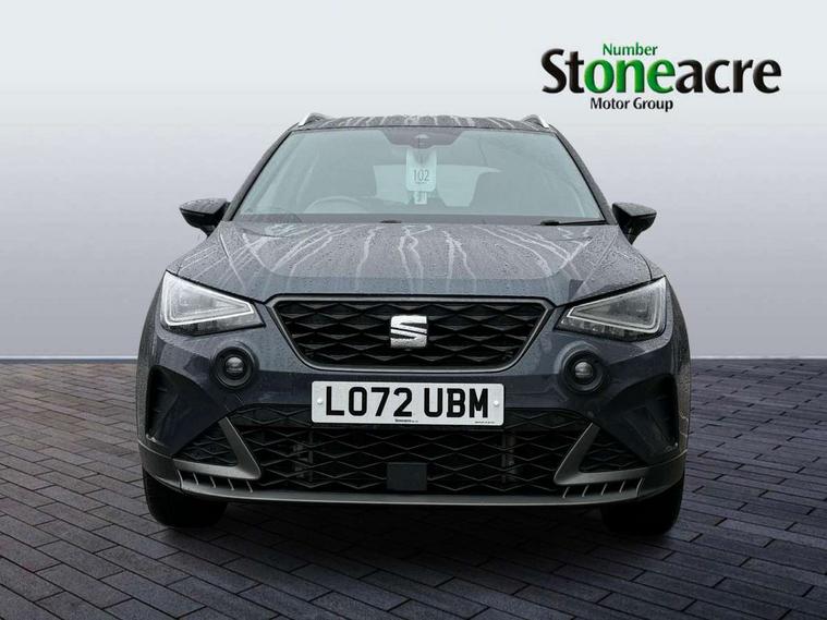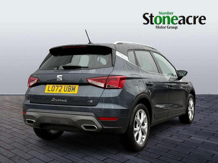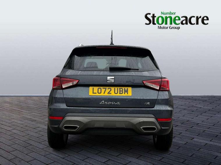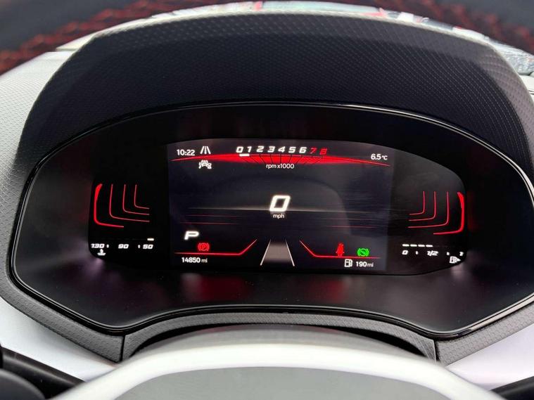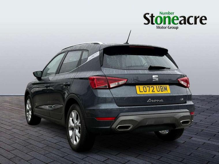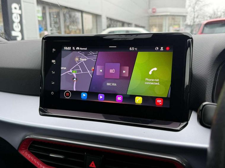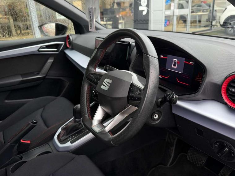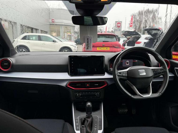 'Lights On' Reminder warning buzzer, 8" Digital cockpit, Digital clock, E-call, Electric speed sensitive power steering, Full Link Smartphone Integration with Mirror Link, Apple Car Play, Google Android Auto with USB Type C cable for Apple and Android compatibility, Lane keeping system, Low fuel warning light, Outside temperature display, Rear parking sensor, RPM counter, Seat connect with safety, service, remote and online, SEAT Drive profile - Four different models normal-sport-eco-individual, steering response, throttle response and gear shifts mode, Trip computer, Wireless phone charger, 9.2" colour touchscreen with navigation system, voice control and USB port (type c), Bluetooth interface for hands free and audio streaming, DAB digital radio and AM/FM radio, Steering wheel mounted audio controls, Anti theft roof antenna, Auto dimming interior rear view mirror, Automatic activation of hazard warning lights, Body coloured bumpers, Body coloured door handle inserts, Chrome roof rails and window surrounds, Dark tinted rear windows, Electric front/rear windows, Electrically adjustable, heated and folding door mirrors, Front fog lights with cornering function and rear fog light, FULL LED automatic headlights with dynamic headlight range control, coming and leaving home, LED daytime running lights, LED rear tail lights and licence plate lights, Protective side mouldings, Rain sensing wipers, Rear side wing doors, Rear spoiler, Rear window wash/wipe, Roof colour door mirrors, Third brake light, Twin exhaust pipe styling hidden exhaust pipe, Visible VIN plate, Windshield wiper with intermittent control and potentiometer, 2 cupholders, 3 seat bench in 2nd row, 60/40 split folding rear seat, Aircare filter, Black interior roof, Cloth upholstery, Double boot floor, Driver sunvisor with covered mirror + card holder, Dual zone climate control, Front courtesy light with 2x front and 2x rear reading lights, Front sport seats, Gear shift indicator, Height adjustable front seats, Height/reach adjustable steering column, Illuminated boot, Instrument lighting with brightness control, Interior ambient lighting, Interior light in footwell, central console and door panel, ISOFIX points in outer rear seats with top tether anchorage points, Passenger sunvisor with vanity mirror, Perforated flat bottomed leather steering wheel/gear knob/handbrake with red stitching and FR logo, Single front passenger seat, Steering wheel mounted gearshift paddles, Two front and three rear height adjustable headrests, Interior chrome pack - Arona, 3 point seatbelts on all rear seats, ABS, Active front headrests, Child locks on rear doors, Driver and front passenger airbags with front passenger airbag de activation, front side and curtain airbags, Electronic stability control, Emergency Brake Assist (EBA) and front assist, Front and rear seatbelt reminder, Hill hold control, Multi-Collision braking, Tiredness recognition system, Traction control, Tyre pressure monitoring system, Alarm with back-up horn, Electronic engine immobiliser, Locking wheel bolts, Remote central locking + deadlocks, Tow away protection, Titan black dashboard, 17" Dynamic alloy wheels,