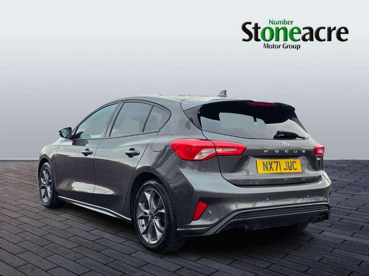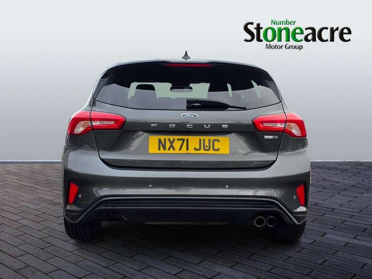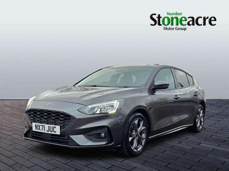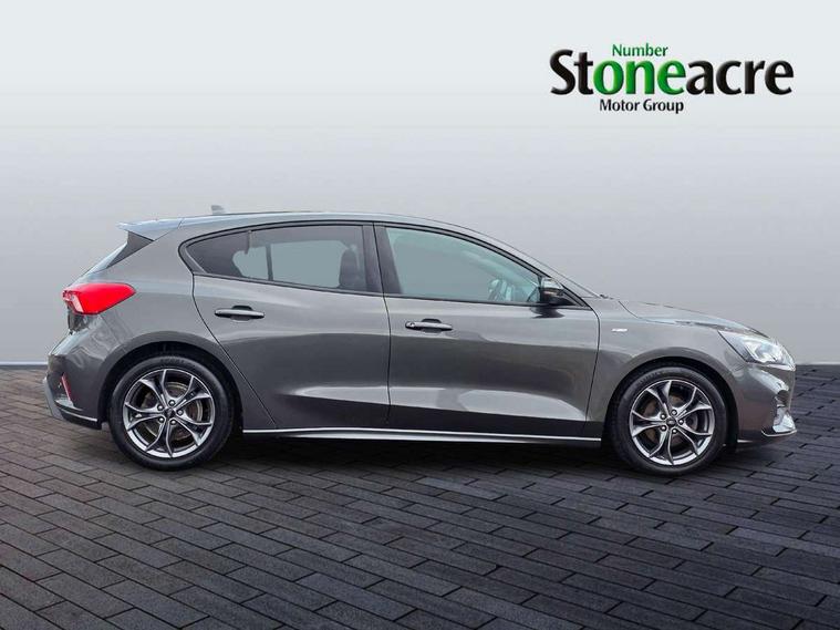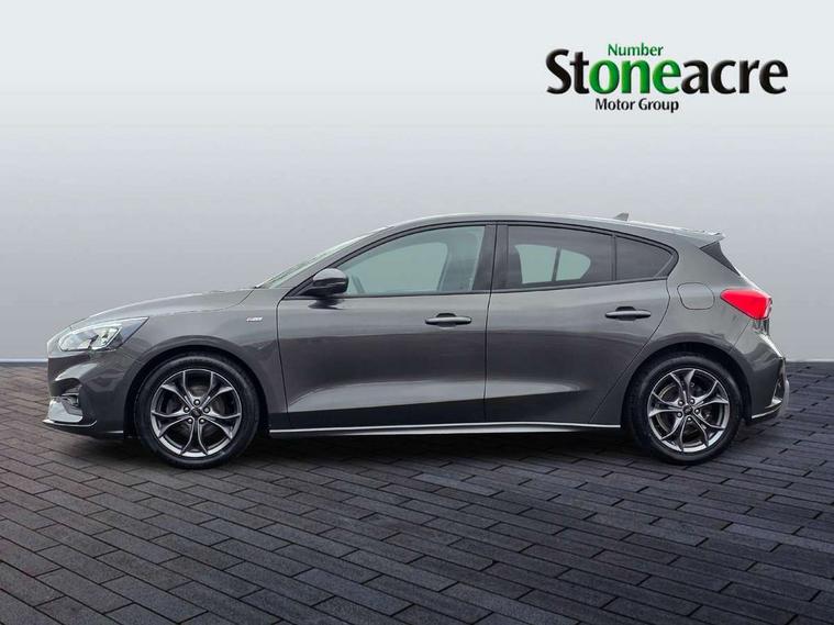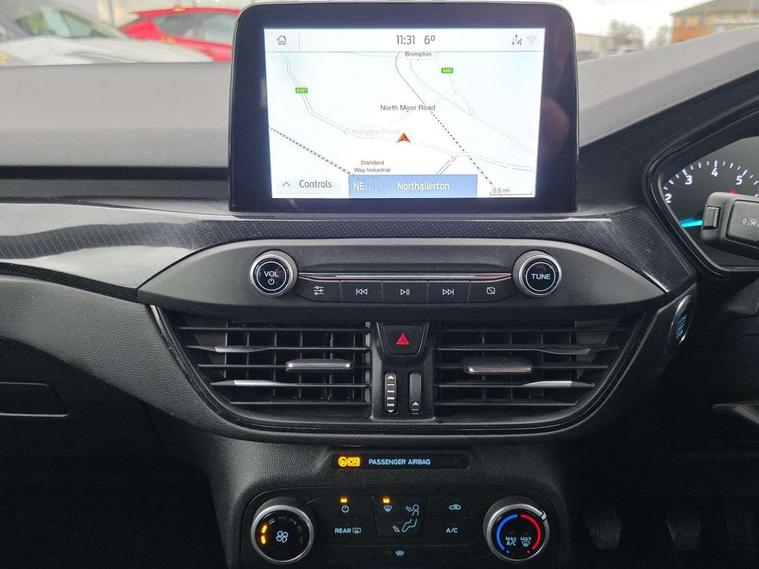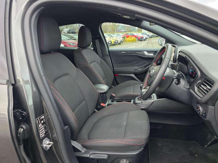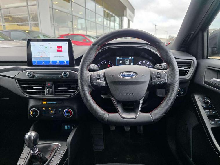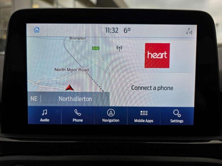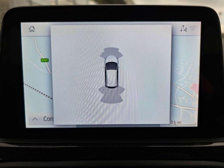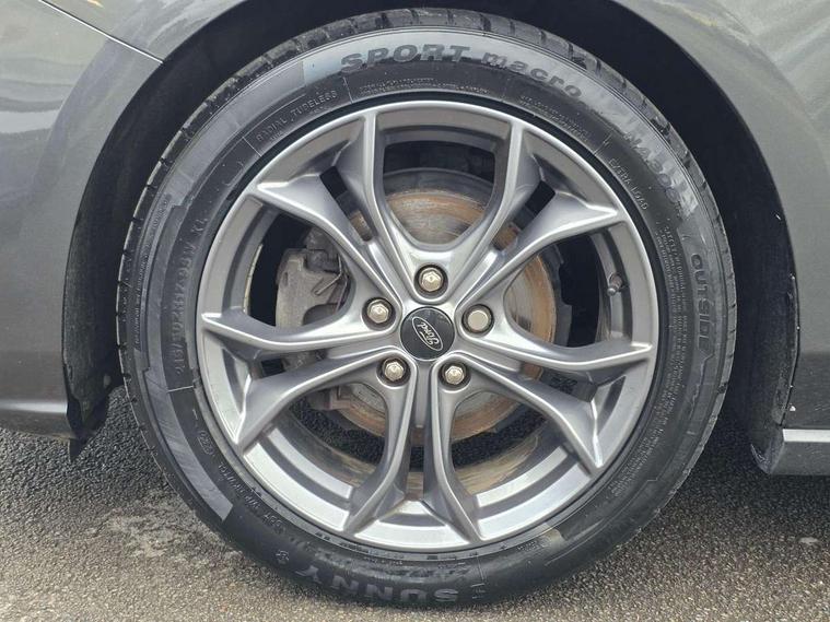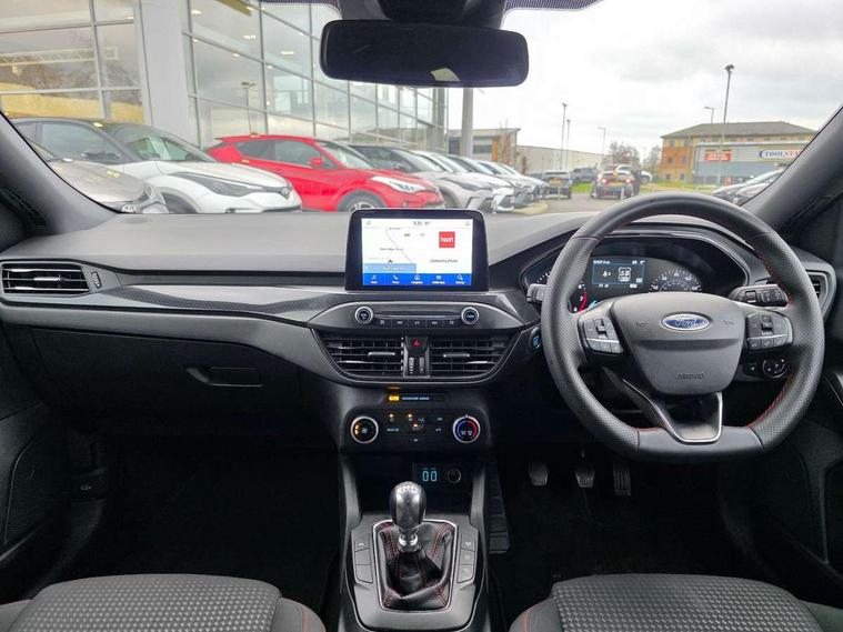 4.2" TFT coloured cluster, Bluetooth system, Digital clock, E-call, Easy fuel capless refuelling system, Eco mode, Ford SYNC 3 navigation with 8" TFT touchscreen, DAB radio and app link Android auto/Apple carplay, Intelligent speed assist, Lane keeping system - lane keeping alert and lane keeping aid, PAS, Selectable drive mode, Trip computer, Sports tuned suspension, 2 USB ports, Aux input, Auto dimming rear view mirror, Auto headlamps (on/off), Automatic rain sensing wipers, Body colour large rear spoiler, Body coloured bumpers, Body coloured door handles, Body coloured electrically operated and heated door mirrors with side indicators, Electrically operated front and rear windows with one touch opening and closing, Front variable intermittent wipers with electric wash, Heated rear window, LED daytime running lamp, LED front fog lamps with cornering function, LED reflector headlamps, Polished twin tailpipe, Power folding door mirrors, Quickclear heated windscreen, Rear privacy glass, Rear side wing doors, ST-Line upper and lower grille with full body styling kit and wing badges, Tailgate wash/wipe, Third brake light, 3 seat bench in 2nd row, 3 spoke flat bottomed Sensico steering wheel with red stitching, Aluminium gear knob, Cloth upholstery, Dark headliner, Driver's lumbar support, Front floor mats, Height adjustable front headrests, Isofix child seat preparation, Manual air conditioning, Reach + rake adjustable steering column, Rear centre headrest, Single front passenger seat, 3x3 point rear seatbelts, ABS+Electronic Brake force Distribution, Auto hold function, Driver airbag, Electronic parking brake, Electronic stability control, Front and rear seatbelt reminder, Front inertia reel height adjustable seatbelts with pre-tensioners, Front passenger airbag, Front side airbags, Hill start assist, Manual rear child locks, Passenger airbag deactivate switch, Post collision braking, Pre collision assist with autonomous emergency braking and pedestrian/cyclist detection, Side curtain airbags, Three rear inertia reel lap/diagonal seatbelts, Tyre pressure monitoring system, Ford keyfree system with Keyless entry and keyless start/sleep mode key fob, MyKey system, Remote central locking & engine immobiliser, Thatcham category 1 alarm, 17" 5x2 spoke alloy wheels with rock metallic finish, Mini steel spare wheel,