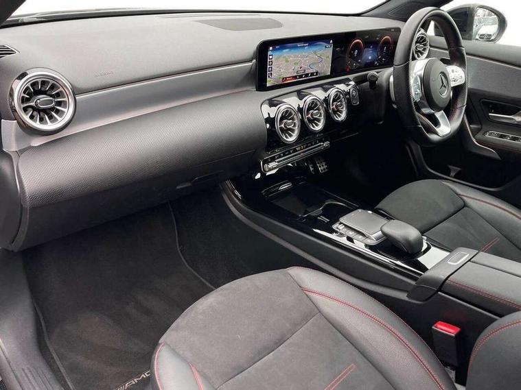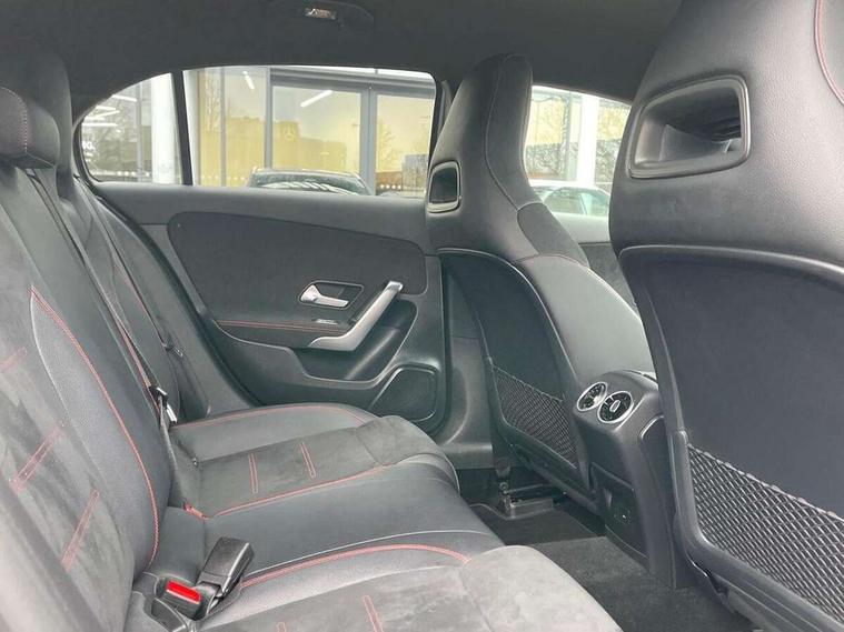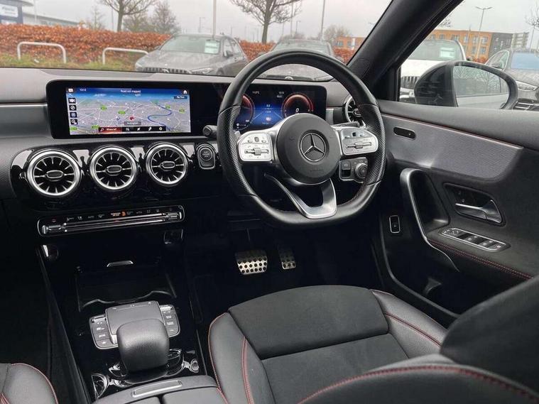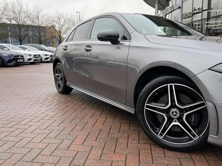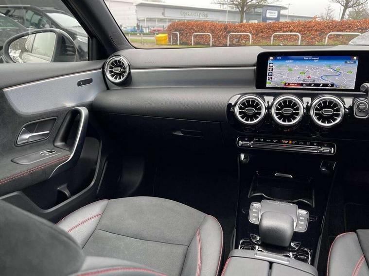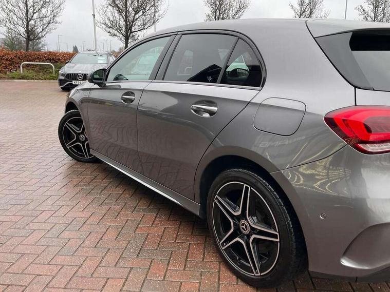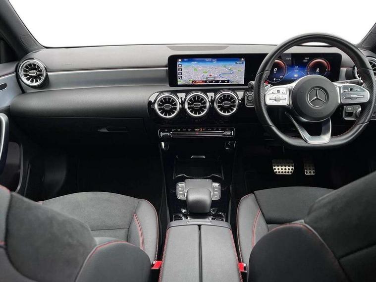 10.25" Digital instrument cluster display screen, 10.25" media display, 180 degree rear view camera with parking guidelines, Acoustic ambient protection, Active parking assist with visual and audible warning of detected obstacles, Attention assist, Brake pad wear indicator warning light, Car wash mode, Cruise control + speed limiter, Direct steering, Dual bluetooth interfaces, DYNAMIC SELECT with a choice of driving modes (ECO, Comfort, Sport and Individual), ECO start/stop function, Fluid level warning indicator for fuel, oil, coolant and washer fluid, Hard-disk navigation, Hey Mercedes Voice activation, Lamp failure indicator, Lane keeping system, Mercedes me connect including emergency call system, accident recovery, breakdown and maintenance management, Mercedes me remote services, Outside temperature gauge, Owners manual in English, Pre-installation for private car sharing, Preinstallation for Mercedes Benz link, Remote and charging services plus, Service indicator (ASSYST), Smartphone integration with Apple CarPlay and Android auto, Speed limit assist, Speed sensitive power steering, Trip computer, Ultrasonic sensors positioned in the front and rear bumpers, 7.4 kW monophase on board charger, Comfort suspension, Mode 2 charging cable and 5m upto 2.3kW, Mode 3 charging cable 22 kW, Rear axle multi-link, 2 USB ports (type C) in rear stowage compartment and one in front of center console, 6 speakers, DAB Digital radio, MBUX multimedia system with DAB digital radio and touchpad including satellite navigation, Mercedes-Benz sound system - 100W, 4 Electric Front and Rear windows, Adaptive brake lights, AMG bodystyling - Front apron with splitter in chrome, rear apron with chrome trim and chrome visible trim elements in tailpipe, Automatic headlights, Black weather strip, Body colour bumpers, Body colour door handles with chrome inserts, Body colour side skirt, Electric adjustable and heated door mirrors with integrated LED side indicators, Exclusive diamond radiator grille, Exhaust system - Twin visible tailpipes in polished stainless steel, Headlamp assist automatic headlamp activation, Heated glass rear windscreen + timer control, LED High level third brake light, LED high performance headlamps with integrated LED daytime running lights, LED tail lamp, Privacy glass, Radio aerial, Rain sensing windscreen wipers with two sensitivity settings, Rear fog lights, Rear side wing doors, Rear wiper, 3 seat bench in 2nd row, 3 Spoke flat bottom leather multi function steering wheel with perforated leather in grip area, 40:20:40 split folding rear seats, Artico man-made leather/Microfibre Dinamica upholstery with red contrast stitching, Auto Mercedes-Benz child seat recognition sensor, Black air vents with surround in silver chrome, Black roof lining, Brushed stainless steel sports pedals with rubber studs, Charging socket, Controller on centre console with chrome surround, Floor mats with AMG lettering, Front centre armrest with storage compartment, Front seat backs luggage nets, Galvanished gear shift paddles on steering wheel, Heated front seats, Height/reach adjustable steering column, Illuminated Mercedes Benz lettering front door sills with changeable cover, Interior lighting - 64 colour Ambient lighting, Interior mirror with reading lamps in black and frameless, Manual height adjustable front seats, Pre-entry climate control, Rear head restraints, Seat occupancy sensor for front passenger seat, Single front passenger seat, Sports seats with integrated headrests, Stowage compartment in centre console with retractable cover, Sunvisors with illuminated vanity mirrors, Touchpad on center console, Twin front cupholders, Two zone thermotronic luxury automatic climate control, Light and sight pack - A Class, Mirror package - A Class, Night pack - A Class Saloon/Hatchback, Seat comfort pack - A Class, 3 rear 3 point seatbelts, ABS with Brake Assist, Active bonnet, Active brake assist includes forward collision warning system with autonomous braking, Adaptive brake assist with hold function and hill start assist, Black seatbelts, Childproof locks manually operated for rear doors and electrically operated for rear power windows, Crash responsive emergency lighting, Driver and passenger head and side airbags, Drivers knee airbag, Dual stage driver/passenger airbags, Electronic parking brake, ESP curve dynamic assist, ESP with ASR, Front and rear seatbelt reminder, Front brake callipers with Mercedes Benz lettering, ISOFIX and top tether child seat fixing points in two outer rear seats, Perforated front brake discs, Radar based regeneration, Tyre pressure monitoring system, Warning triangle and first aid kit, Window airbags, Alarm system/interior protection/immobiliser, Keyless Go, Remote central locking and crash sensor with emergency opening function, Urban guard vehicle protection system with immobiliser and interior protection, Matrix look light longitudinal grain aluminium trim element, 18" AMG 5 twin spoke light alloy wheels aerodynamically optimised painted in black with highsheen finish, Summer tyres, Tirefit sealant kit,