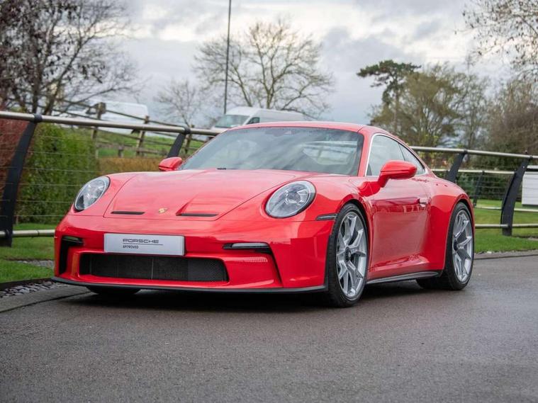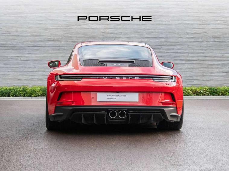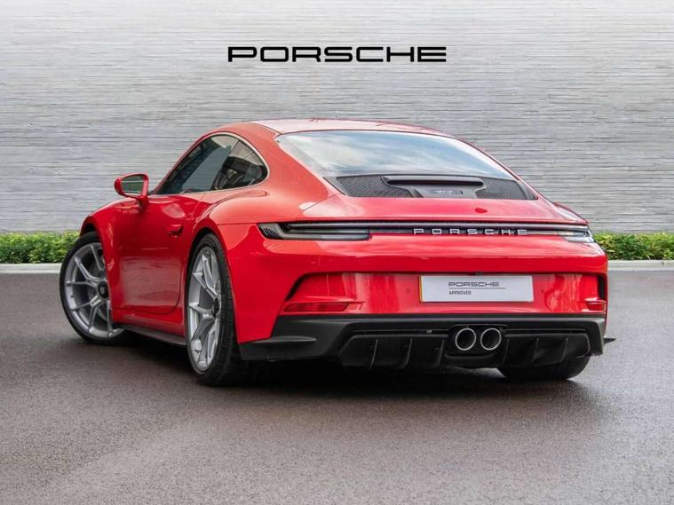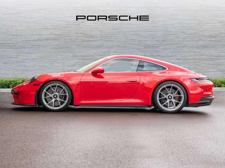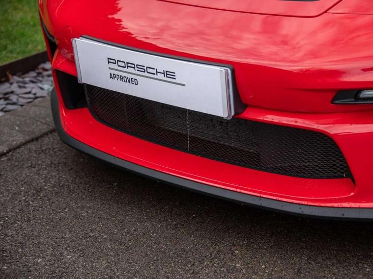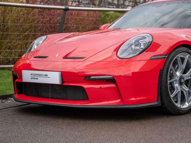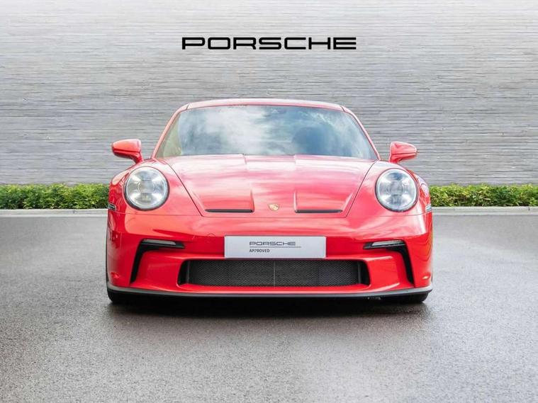 Automatic start/stop system, Brake pad wear indicator warning light, Cruise control, eCall emergency system, Electromechanical power-assisted with variable steering ratio and speed sensitive power steering assistance, Instrument cluster with central analogue rev counter and two 7-inch TFT displays with track screen, Porsche Communication Management (PCM) including online navigation module, mobile phone preparation, audio interfaces and voice control system, Porsche track precision app, Rear axle steering with sport tuning, Rev counter with digital display for selected gear and vehicle speed with distinguishable yellow dial and illuminated "GT3" logo, Service indicator, Smartphone integration with Apple CarPlay and Android auto, Trip computer, 2 seat coupe with rear mounted engine, 6 speed manual GT sports transmission, 60Ah Lightweight starter battery, Adjustable suspension for race track use in toe, camber, anti-roll bars, Aluminium engine block and cylinder heads, Direct fuel injection (DFI), Dry-sump lubrication with separate engine oil tank, Four valve technology with cam followers, Front axle - Double wishbone front suspension with anti-roll bar, all suspension mountings ball jointed, Multi-link rear axle with integrated helper springs, anti roll bar, selected suspension mountings ball jointed, Porsche Active Suspension Management (PASM) sport tuning and 25mm lower chassis, Porsche Stability Management (PSM), including ABS, with two switchable stages (SC OFF and SC+TC OFF), Porsche Torque Vectoring (PTV) including mechanical rear differential lock with asymmetrical lock factor, Rear wheel drive, Two gasoline particulate filter, Two three-way catalytic converters and on-board diagnostics for monitoring emission control system, Variable plastic intake manifold with switchable tuning flap, VarioCam camshaft control for inlet and exhaust valves, 2 USB ports in centre console main storage comaprtment lid, DAB Digital radio, Automatic headlight activation including welcome home lighting, Automatically dimming interior and exterior mirrors with integrated rain sensor, Automatically extendible rear spoiler and distinctive air intake grille including plaque with GT3 touring logo, Central wheel bolts in black and wheel hub cover with two tone Porsche crest, Deletion of model designation on rear apron PORSCHE logo retained, Electrically adjustable heated exterior mirrors on door waist rails, aspherical on driver's side, Front apron entirely in exterior colour with integral cooling air intakes with anthracite coloured grilles and black spoiler lip, Heated rear windscreen, Intelligent lightweight body in Aluminium/Steel composite construction, LED auxiliary light units in the front end with position lights, direction indicators and side indicators, Lightweight black carpet rear cover, Lightweight bonnet in carbon fibre reinforced plastic in exterior colour with two air outlets, Lightweight glazing made of compound glass and acoustic, Lightweight stainless steel sports exhaust system with 2 central tailpipes in black, Power windows with one touch operation and door seal protection, Rear apron with additional air outlets including anthracite coloured grilles, black lower section, Rear boot, Rear side wing doors, Retractable door handles, Seamless taillight strip with integrated PORSCHE logo in high gloss light silver, Side window trim in anodised aluminium and side skirts in black, Side window with water repellent coating, Taillight strip as rear driving lights with integrated parking and rear fog light, Underbody panelling with finned rear diffuser, Windscreen washer system with aero wiper blades, two wiping speeds, adjustable intermittent wipe and washer jets, Windscreen with grey top tint, 12V socket in front passenger footwell, Clothes hooks on seat backrests and on B-Pillar, Driver and front passenger illuminated vanity mirrors, Front head restraints, Headrests embossed with Porsche crest, backrest shells in dark silver, LED courtesy light, LED footwell lights, LED glove compartment lighting, LED ignition light, LED luggage compartment lighting, LED orientation light, LED reading lights, Lockable glove compartment, Luggage compartment at front, Multifunction GT3 sports steering wheel and mode switch, steering rim and top centre marking and airbag module in black leather, Oil supply with fully variable hydraulic oil pump, seven suction stages and centrifugal oil cleaner, Partial seat centre, steering rim, gear selector grip area incl gaiter, door pulls, door panel armrest, centre console storage compartment lid armrest, Particle/pollen filter with active carbon filter, Seat bolsters, headrests and steering wheel airbag module in black leather, Single front passenger seat, Smooth finish leather airbag module in black and manual fore/aft and height adjustment, Stitching and door release levers in black, Storage compartment in centre console, Storage compartments in doors, Two individual cupholders 1x as inlet in centre console and 1x passenger side, Two zone auto climate control with separate temperature settings for driver/front passenger, automatic air recirculation mode incl air quality sensor, Black exterior touring package - 911, 3 Point automatic front seat belts with buckle on seat, Composite brake discs with aluminium brake chambers, 408mm diameter at front and 380mm at rear, internally vented and cross drilled, Electric parking brake, Forged titanium piston rods, Full size airbags for driver and front passenger, Porsche side impact protection incl side impact protection in doors, thorax airbag side front seat bolster, curtain airbag door panels for passengers, Tyre pressure monitoring system with race circuit mode, Dashcam prep, Engine immobiliser with remote central locking and alarm system with radar based interior surveillance, Keyless drive, Porsche vehicle tracking system (PVTS Plus), 20" / 21" 911 GT3 forged alloy wheels in silver colour with central locking and sport tyres, Tyre 