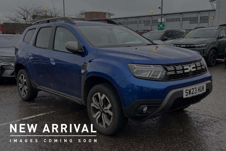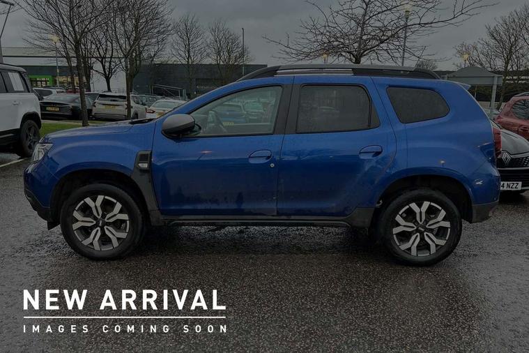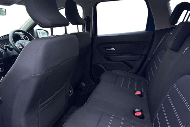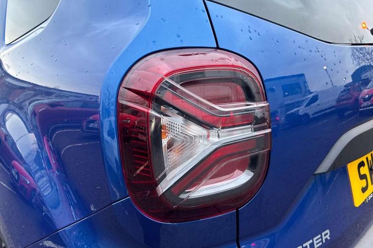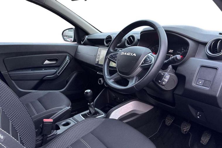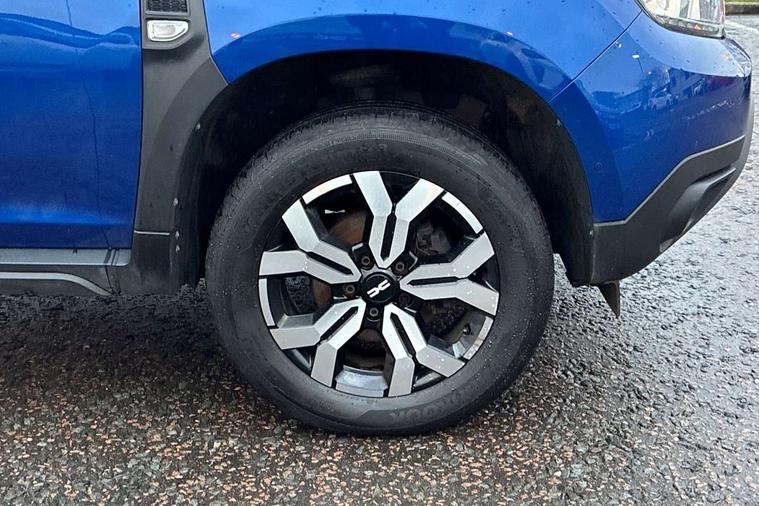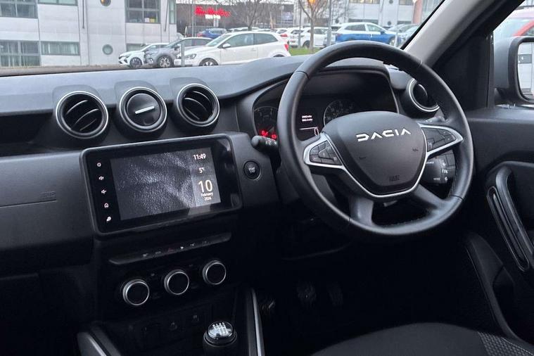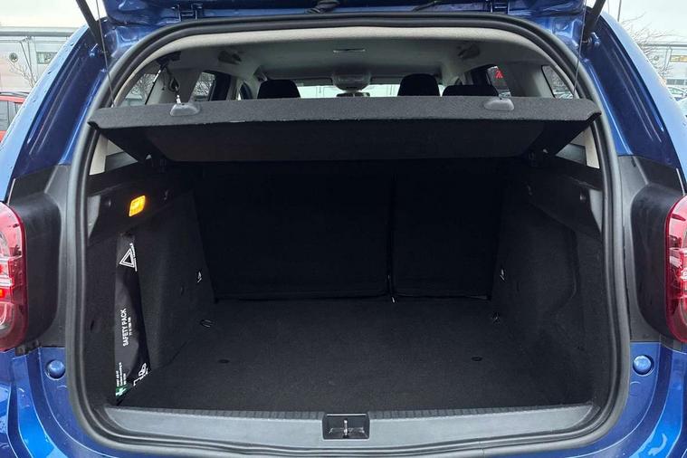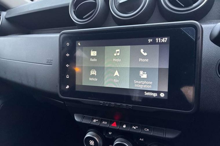 Blind spot warning, Cruise control and speed limiter, eCall emergency system, Eco mode, Electric power assisted steering, Multi view camera, On board computer, odometer, trip computer, average fuel consumption, average speed, service indicator, outside temperature gauge, Rear parking sensors, Rev counter, Reversing camera, Stop/start system, 8" Media Navigation with wireless smartphone replication, Dacia plug and radio/MP3/USB/bluetooth/DAB/steering wheel control, 3 speed windscreen wipers, Acoustic windshield, Automatic front wipers, Black side sills, Black/satin chrome tailgate trim with Duster inscription in black background and lettering, Body coloured door handles, Chrome front grille with hot stamping, Chrome logo surround on steering wheel, Dark glass on lateral rear windows, Daytime running lights, Drivers window one touch up/down, Dusk sensor, Electric adjustable/heated door mirrors, Electric folding door mirrors, Electric front windows, Electric rear windows, Front and rear body coloured bumpers, Front door sill protection strip, Front fog lights, Grey quartz longitudinal roof bars with Duster inscription, Heated rear window, High level third rear brake light, Modular roof bars, Rain sensor, Rear side wing doors, Rear spoiler, Rear wash/wipe, Satin chrome door mirrors, Underbody protection skid plates, Y shaped LED headlights with rear LED lights, 3 rear height adjustable headrests, 3 seat bench in 2nd row, 60/40 split folding rear seat, Automatic air conditioning, Backlighted steering wheel buttons, Boot light, Driver seat lumbar adjustment, Fabric decorative insert on door panels, Fabric upholstery, Front head restraints, Front passenger reading light, Gear shift indicator, Glovebox light, Heated seats, Height adjustable driver seat, Height adjustable front and rear headrests, Height and depth adjustable steering wheel, High centre console with driver armrest, Isofix points for child seats in both outer rear seats, Map pocket on front seat backs, Passenger sunvisor with vanity mirror, Rear passenger reading light, Satin chrome gear lever cap insert, Satin chrome interior door handles, Satin chrome lower steering wheel insert, Single front passenger seat, Soft feel leather steering wheel, 3x3 point rear seatbelts, ABS and Emergency brake assist, ASR traction control with Electronic stability control, Child locks on rear doors, Door open visual and audible warning, Driver airbag, Driver and passenger seatbelt not fastened - visual and audible warning, EBD - Electronic brakeforce distribution, Front passenger airbag, Front passenger airbag deactivation, Front seatbelt pretensioners, Front side airbags, Height adjustable front seatbelts, Hill start assist, Tyre pressure monitor, Keyless entry, Remote central locking, Thatcham approved engine immobiliser, Charcoal grey central console surround, Matt black central console fascia, Matt black decorative insert on rear door panels, Piano black decorative insert on front door panels, Satin chrome air vent surround, Satin chrome instrument dial surrounds, 17" Alloy wheels,