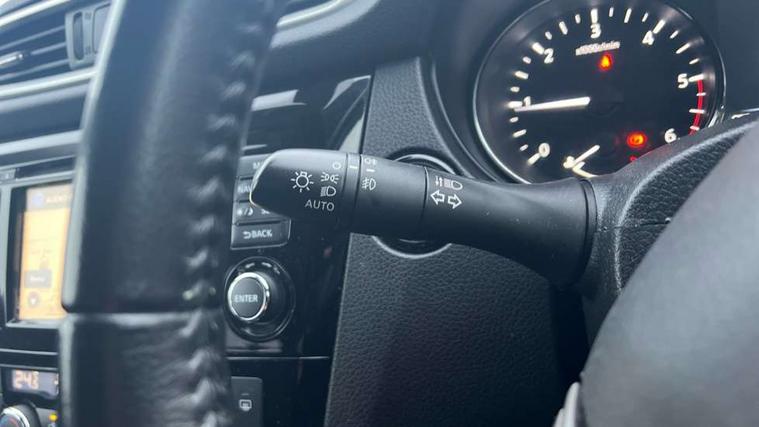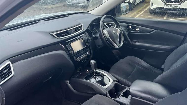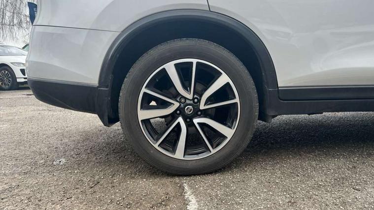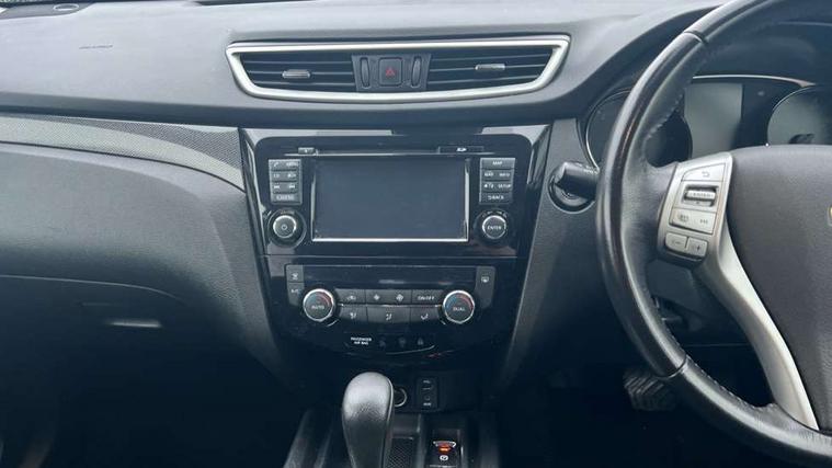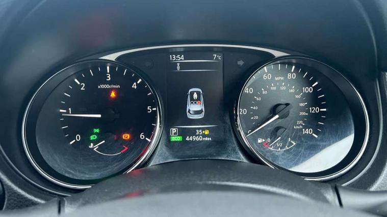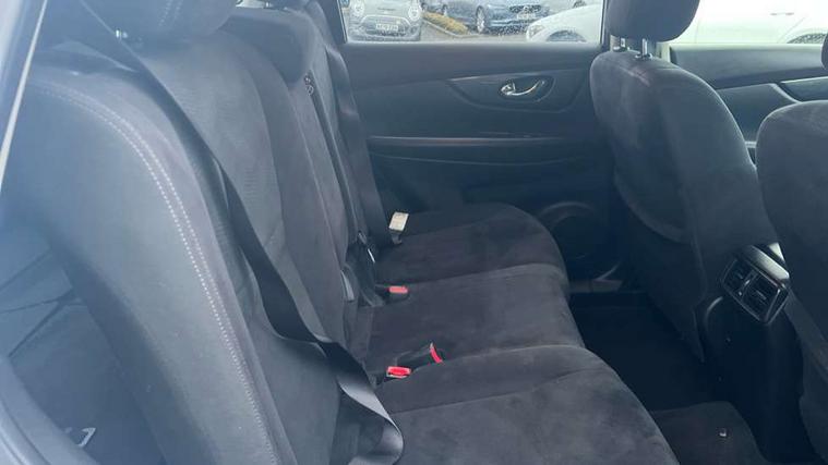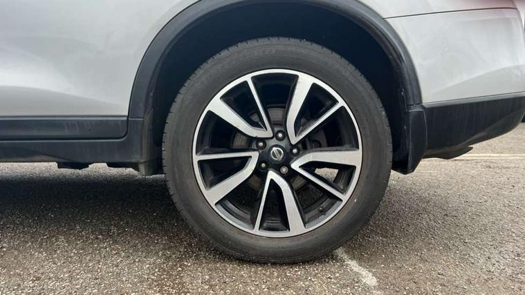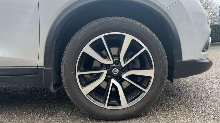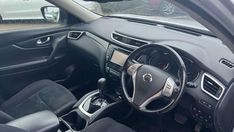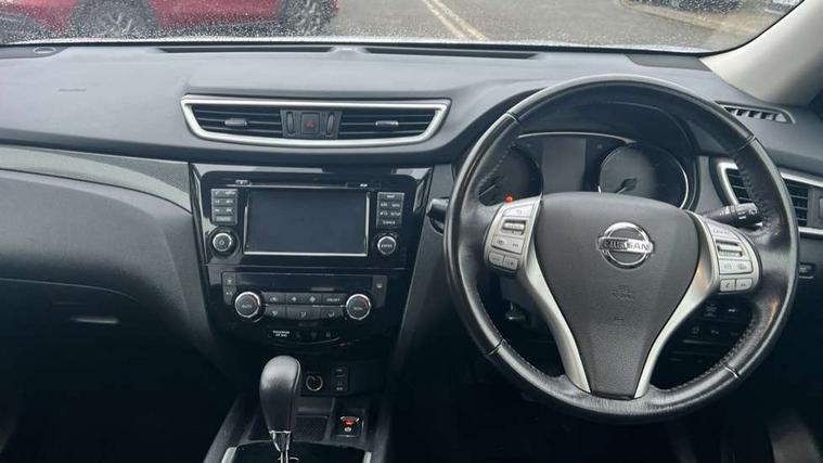5" TFT driver information centre, Around View Monitor, Automatic tailgate opening, Bluetooth phone integration system, Cruise control + speed limiter, Engine start button, Front and rear parking cameras, Front and rear parking sensors, Lane departure warning system, Nissan connect sat nav system, PAS, Service interval indicator, Side view cameras, Traffic sign recognition, Trip computer, Diesel particulate filter, 6 speakers, Audio remote control in steering wheel, DAB Digital radio, Radio/CD, USB/aux input socket, Auto dimming rear view mirror, Automatic headlights, Automatic rain sensing wipers, Black honeycomb front grille, Body colour bumpers, Chrome door handles, Chrome window surround, Electric folding door mirrors, Electric panoramic sunroof, Electrically adjustable and heated door mirrors, Front and rear power windows, Front foglights with chrome rings, LED daytime running lights, Rear privacy glass, Rear wiper, Satin silver roof rails, 60/40 split folding rear seat, Cloth upholstery, Configurable luggage board system, Driver's seat manual height adjust, Dual zone climate control, Front and rear headrests, Front armrest, Isofix child seat attachment, Leather steering wheel and gear knob, Rake/reach adjustable steering wheel, Rear armrest, 3 point seatbelts on all seats, ABS, Child locks on rear doors, Driver and passenger airbags, EBD + Brake Assist, Electronic parking brake, ESP + traction control, Forward emergency braking, Front and rear curtain airbags, Hill start assist, Tyre pressure monitoring system, Warning triangle, Alarm, Immobiliser, Intelligent Key, Remote central locking, Metal grain interior trim, 19" 5 spoke alloy wheels, Space saver spare wheel,