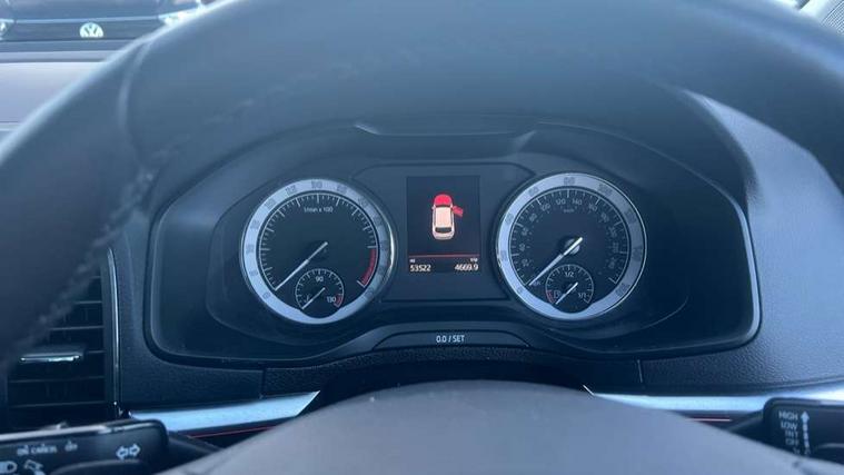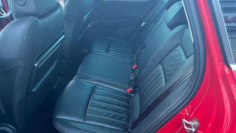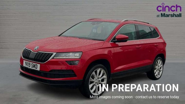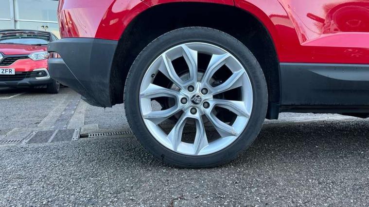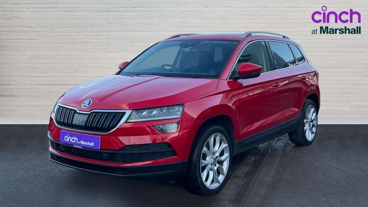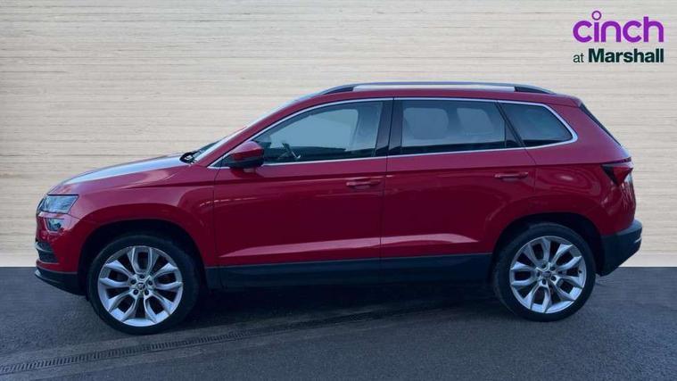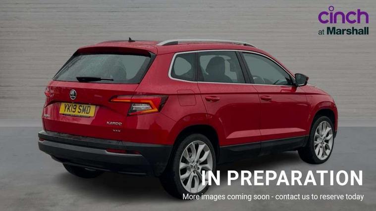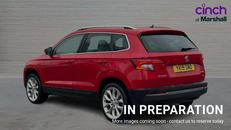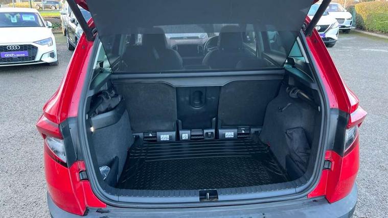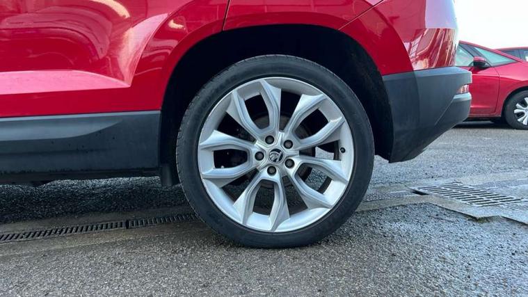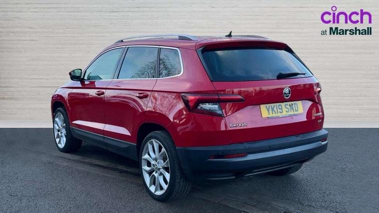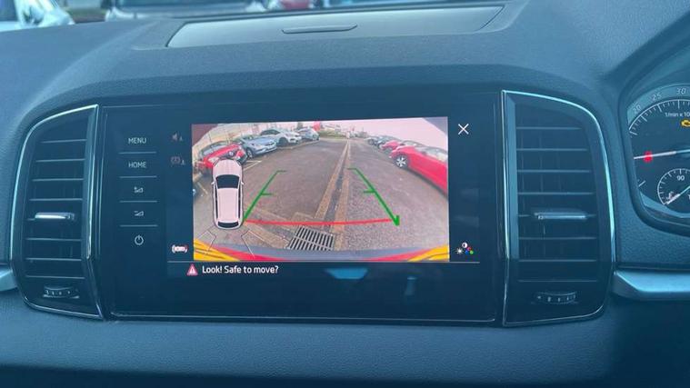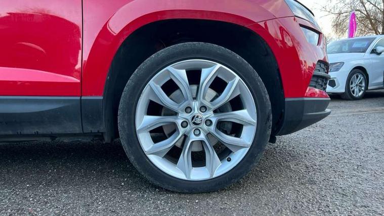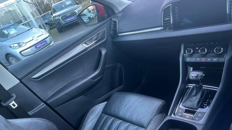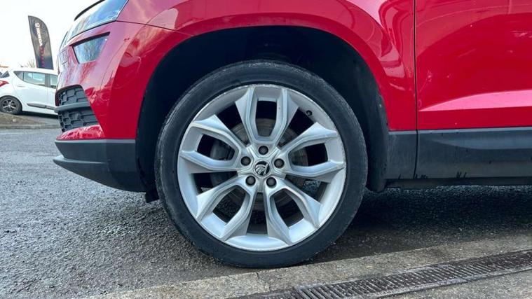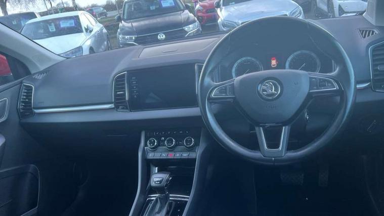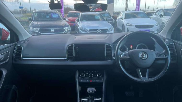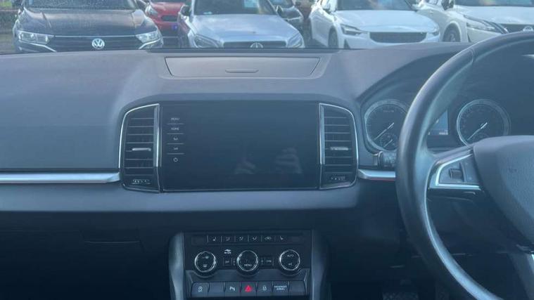 Columbus satellite navigation with 9.2" touchscreen display, integrated Wi-Fi, gesture control and WLAN, Drive mode selection with off road, Driver alert system, Driver fatigue sensor, Driver profile selection, Multifunction colour trip computer, Outside temperature gauge, Rear cross traffic alert, Rear view camera, Service interval indicator, Start/stop system with regenerative braking, Traffic sign recognition, Diesel particulate filter, DAB radio with Bluetooth, SD card slot, USB connection, Acoustic glass, Aero front windscreen wipers with intermittent function, Automatic headlight control system, Body colour door mirrors and handles, Body coloured bumpers, Chrome outside aluminium bar around the window, Chrome roof rails, Electric front and rear windows with child proof lock, Electrically adjustable heated folding and auto dimming door mirrors with boarding spots and memory function, Full LED headlights + adaptive front light system + LED daytime running lights and front cornering fog lights, Headlight washers, Heated rear windscreen, LED rear lights with high functionality, Light assistant (coming/leaving home/tunnel light), Panoramic sliding sunroof, Privacy glass, Safety reflectors on front doors, Third brake light, 1.5 litre bottle holders in driver and front passenger door panels, 12V socket in boot, 12v socket in front centre armrest with storage compartment and rear air vents, 2 Folding hooks and nets in boot, 2 Front readings lights for driver and passenger, 3 rear height adjustable headrests, 4 foldable roof handles with rear coat hooks, 4 lashing points on luggage floor, Backrest release, Cargo elements in boot, Chrome inner door handles, Dual zone climate control, Electrically adjustable driver's seat with memory function includes lumbar support + heated folding door mirrors with auto dimming and boarding spots, Folding tables on the front seat backrests, Front seat and rear pockets, Height adjustable front three point seats belts with tensioners, Height adjustable passenger seat, Height/reach adjust steering wheel, Ice scraper, Illuminated and cooled glovebox, Illuminated luggage compartment, Isofix child seat preparation outer rear, Leather upholstery, Manual lumbar support for front passenger seat, Net programme in boot, Pen holder, Pollen filter, Rear boot cover, Rear reading lights, Rear seats fixed folding and divided 60:40, Removable LED torch in the boot, Retractable parcel shelf attachable to tailgate, Safety vest holder, Storage box in upper central dashboard closed, Storage compartment below the passenger seat, Storage net on centre console passenger side, Sunglasses storage compartment, Sunvisors with illuminated vanity mirrors, Textile floor mats, Umbrella under passenger seat, VarioFlex seats with retractable parcel shelf, LED Interior lighting pack with Skoda welcome logo - Karoq, Airbags - Front side, head, knee and curtain, Automatic door unlocking in case of crash, Automatic fuel cut off in case of crash, Driver airbag, Electronic parking brake with auto hold function, Emergency rear braking signal, ESC including ABS, MSR, ASR, EDS, HBA, DSR, RBS, MKB and traction control, Front assist radar scanning of the space in front of the car with automatic braking, Hill hold control, Passenger airbag with switch-off function, Pedestrian monitor, Seatbelt reminder signalisation and pretensioner for all seats, Three point seatbelts rear, Two tone horn, Tyre pressure display, Tyre pressure monitor, Alarm with interior monitoring, back up horn and tilt sensor with safe function, Electronic engine immobiliser, Keyless entry and keyless start with safe system, Remote central locking with 2 remote folding keys, Chrome framed air vents, 19" Crater silver alloy wheels with anti theft wheel bolts, Storage on wheel cover,