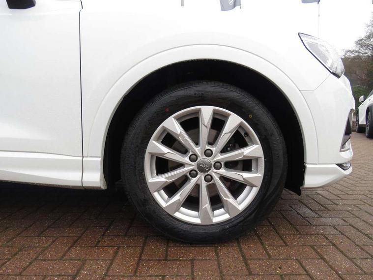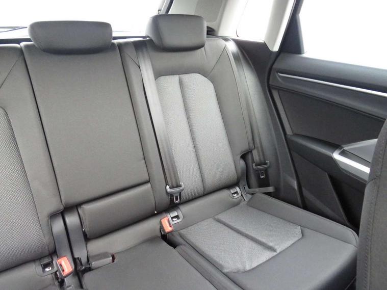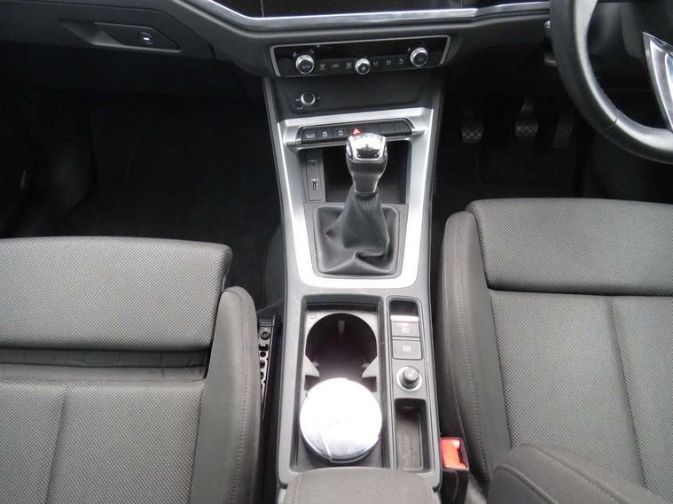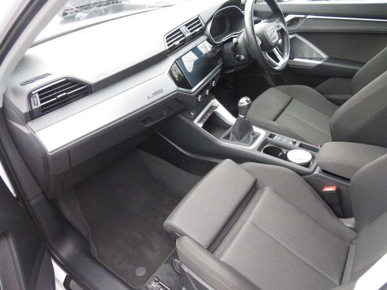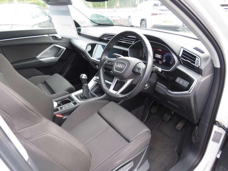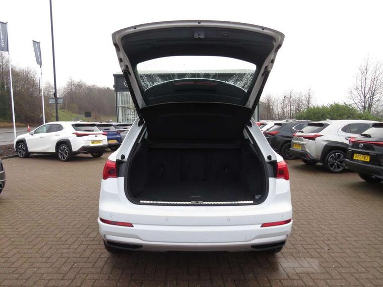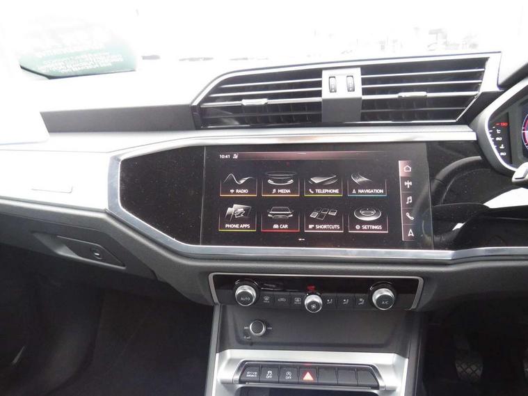 Audi connect safety and service (e-call), Audi drive select, Audi lane departure warning, Audi side assist, Audi smartphone interface, Audi Virtual Cockpit - 10.25" display, Bluetooth interface, Camera based traffic sign recognition, Cruise control + speed limiter, MMI navigation plus with MMI touch, Power opening/closing tailgate, Progressive steering, Rear parking sensors, Service interval indicator, Stop/start system, Voice control system, Standard suspension, 1 x USB type C and 1 USB type A charging points, 6 speakers, DAB digital radio module, Acoustic windscreen, Aluminium roof rails, Aluminium window trim, Auto dimming rear view mirror, Body coloured bumpers, Electrically adjustable and heated door mirrors with integrated LED side indicators, Front and rear electric windows, Front fog lights, Front side air inlets in matt selenite silver, Front spoiler in matt selenite silver, Grille vertical bars in aluminium silver/Matt, High gloss black finish B and C pillars, LED headlights with LED daytime running lights and dynamic rear indicator, LED rear lights, Rain and light sensors, Rear diffuser strip in selenite silver, Titanium black radiator grille, 12V socket in rear centre console, 40:20:40 split folding rear bench seat, Adjustable rear seat bench/backrest, Aluminium door sill trims, Dual zone climate control, Front and rear headrests, Front and rear roof module including reading lights, Front and rear velour floor mats, Front centre armrest with storage compartment and angle adjustment, Glove compartment lighting, Height and reach adjustable steering wheel, ISOFIX child seat mounting and Top Tether with front passenger airbag deactivation, Luggage compartment light, Lunar silver cloth headlining, Manual front seats with height adjustment, Stainless steel luggage compartment sill finisher, Non smoking pack - Q3, 3x3 point rear seatbelts, 6 airbags - Driver, front passenger, curtain and side windows, Audi pre-sense front with pedestrain and cyclist recognition, Electrically operated child locks on rear doors, Electromechanical parking brake, Electronic stabilisation control including ABS, ASR and EDL, Hill descent control, Hill hold assist, Pre sense basic, Seatbelt monitoring, Tyre pressure warning, Warning triangle and first aid kit, Anti theft alarm, Anti theft wheel bolts, Remote central locking, MMI touch colour display in gloss black with aluminium surround,