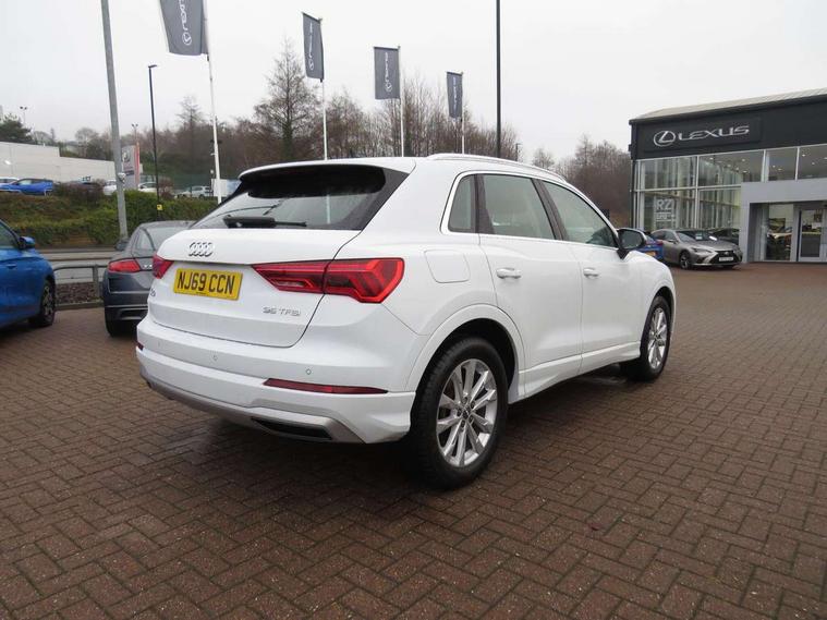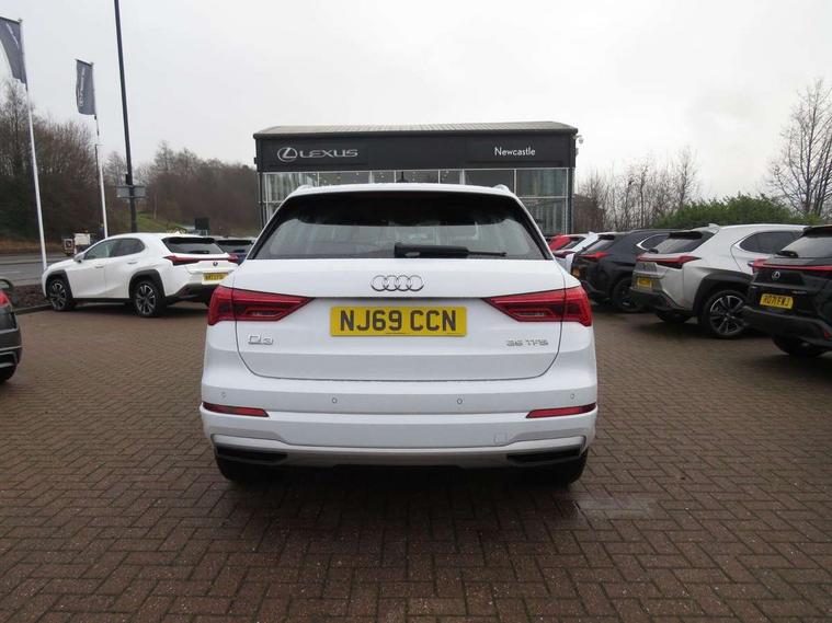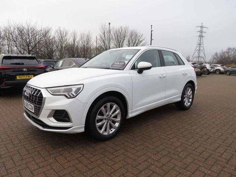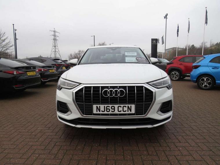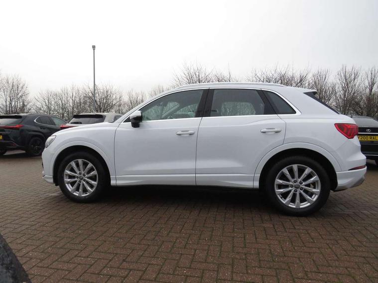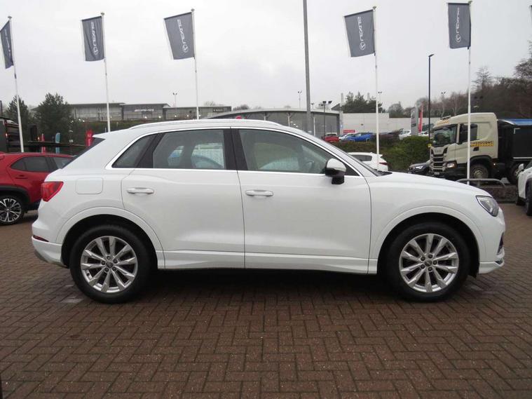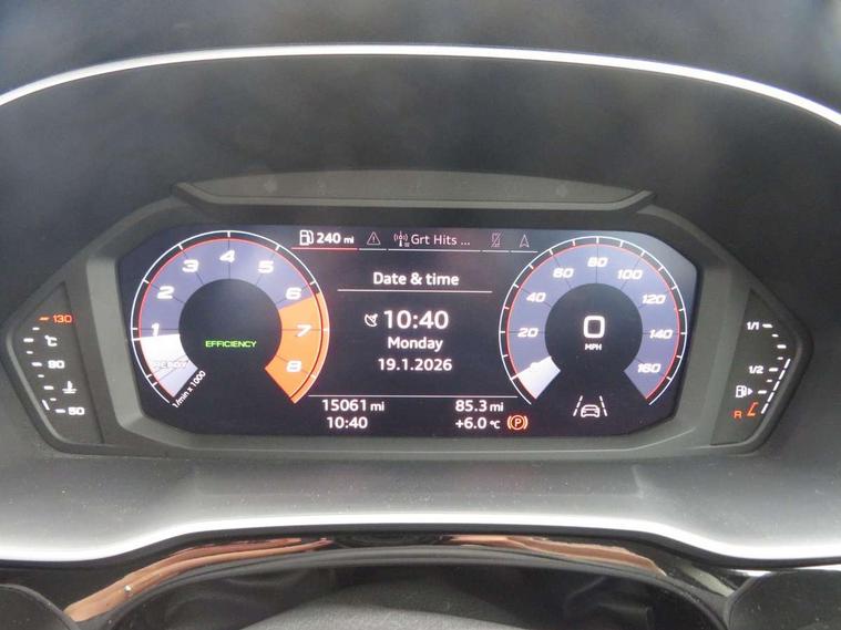 Audi connect safety and service (e-call), Audi drive select, Audi lane departure warning, Audi side assist, Audi smartphone interface, Audi Virtual Cockpit - 10.25" display, Bluetooth interface, Camera based traffic sign recognition, Cruise control + speed limiter, MMI navigation plus with MMI touch, Power opening/closing tailgate, Progressive steering, Rear parking sensors, Service interval indicator, Stop/start system, Voice control system, Standard suspension, 1 x USB type C and 1 USB type A charging points, 6 speakers, DAB digital radio module, Acoustic windscreen, Aluminium roof rails, Aluminium window trim, Auto dimming rear view mirror, Body coloured bumpers, Electrically adjustable and heated door mirrors with integrated LED side indicators, Front and rear electric windows, Front fog lights, Front side air inlets in matt selenite silver, Front spoiler in matt selenite silver, Grille vertical bars in aluminium silver/Matt, High gloss black finish B and C pillars, LED headlights with LED daytime running lights and dynamic rear indicator, LED rear lights, Rain and light sensors, Rear diffuser strip in selenite silver, Titanium black radiator grille, 12V socket in rear centre console, 40:20:40 split folding rear bench seat, Adjustable rear seat bench/backrest, Aluminium door sill trims, Dual zone climate control, Front and rear headrests, Front and rear roof module including reading lights, Front and rear velour floor mats, Front centre armrest with storage compartment and angle adjustment, Glove compartment lighting, Height and reach adjustable steering wheel, ISOFIX child seat mounting and Top Tether with front passenger airbag deactivation, Luggage compartment light, Lunar silver cloth headlining, Manual front seats with height adjustment, Stainless steel luggage compartment sill finisher, Non smoking pack - Q3, 3x3 point rear seatbelts, 6 airbags - Driver, front passenger, curtain and side windows, Audi pre-sense front with pedestrain and cyclist recognition, Electrically operated child locks on rear doors, Electromechanical parking brake, Electronic stabilisation control including ABS, ASR and EDL, Hill descent control, Hill hold assist, Pre sense basic, Seatbelt monitoring, Tyre pressure warning, Warning triangle and first aid kit, Anti theft alarm, Anti theft wheel bolts, Remote central locking, MMI touch colour display in gloss black with aluminium surround,