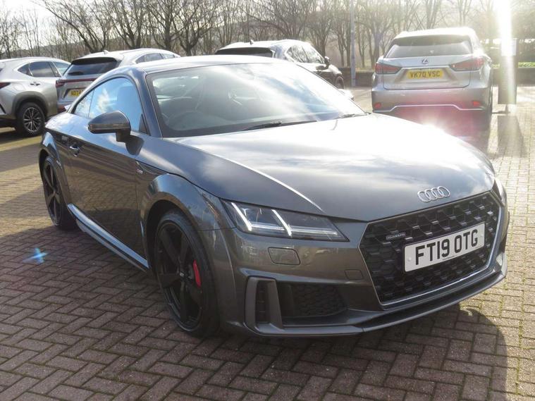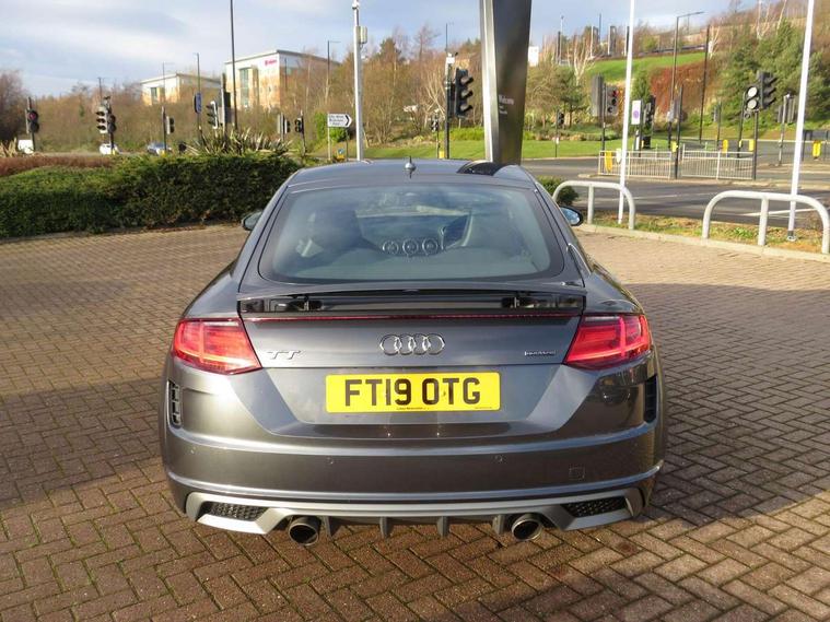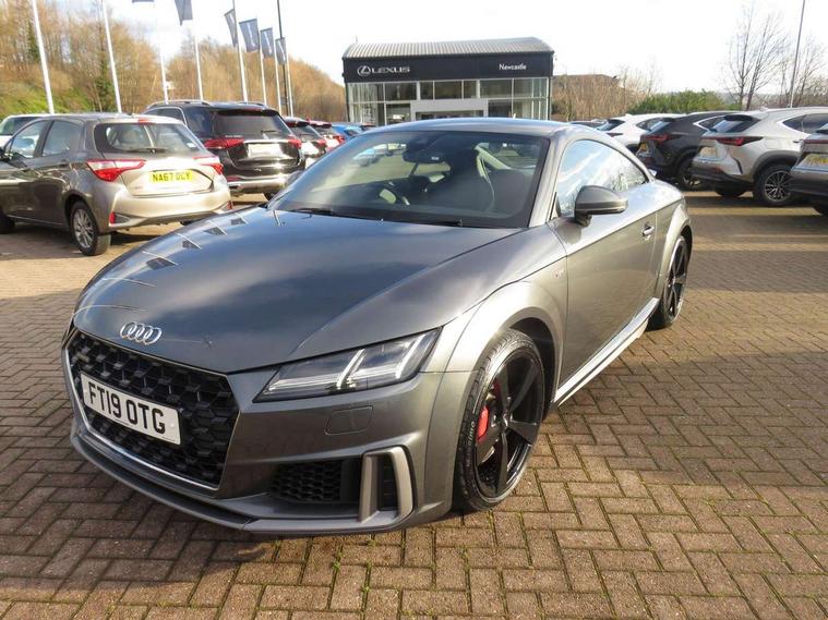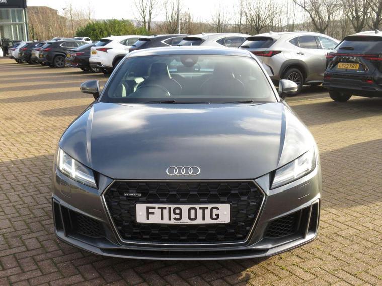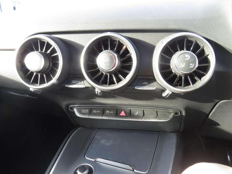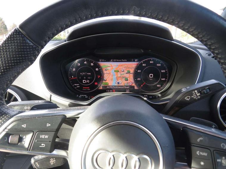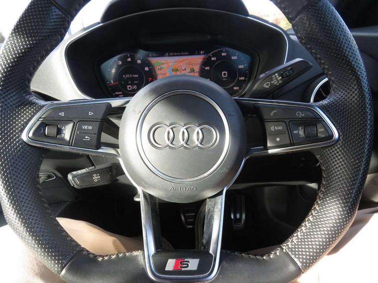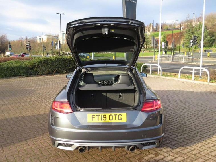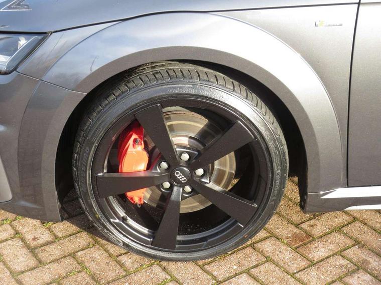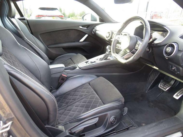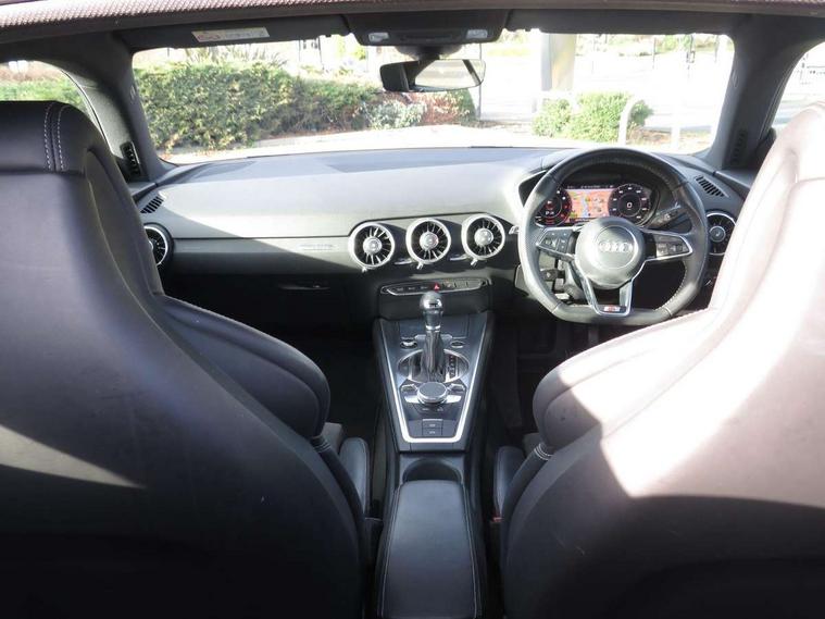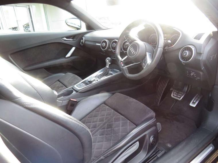 Audi active lane assist, Audi drive select with 4 Pre configured modes, Cruise control + speed limiter, MMI touch panel, Mobile phone preparation with bluetooth interface, Progressive power assisted steering, Rear parking sensors, Service interval indicator, Start/Stop system with energy recuperation, TP memo, 8 speakers, AM/FM radio, Audi music interface, Bluetooth audio streaming, DAB Digital radio, MMI Radio with CD player and SD/XC card slot, Auto dimming rear view mirror, Auto headlight range control, Body colour bumpers, Dynamic rear indicators, Electric front windows, Front fog lights, Green tinted heat insulating glass, Headlight wash system, High gloss black radiator grille, LED daytime running lights, Light and rain sensors, Retractable rear spoiler, S line badges on front wings, S Line body styling, S Line front and rear bumpers, S line rear diffuser with platinum grey insert, S line sill plates, Sunband for windscreen, 12V socket, 3 spoke flat bottomed high multi-function leather sport steering wheel with gearshift paddles, 4 way electric lumbar support for driver and front passenger, Black headlining, Door sill trims with S line logo, Extended aluminium look with stainless steel pedals, Front centre armrest, Front super sports seats, Heated front seats, Height adjustable driver's seat, Height adjustable front head restraints, Height/reach adjust steering wheel, ISOFIX child seat mounting for front passenger seat with airbag deactivation, Perforated leather gearknob, Rear top tether child seat ISOFIX attachment, S Line badge on steering wheel, Split folding rear seat, Tool kit, Top tether anchor plate for isofix child seat, Non smoking pack - TT/TT RS, 3 point front seat belts, ABS, ASR traction control, Brake energy regeneration, Curtain airbags, Driver and front passenger airbag with front passenger airbag deactivation, EDL traction control, Electromechanical parking brake, ESP, First aid kit, Front side airbags, Head airbags, Hill hold assist, Roll bar in glossy black, Seatbelt warning, Tyre pressure warning, Warning triangle, Anti theft alarm, Anti theft wheel bolts, Immobiliser, Keyless Go, Remote central locking, Matt brushed aluminium inlays, Tyre repair kit,