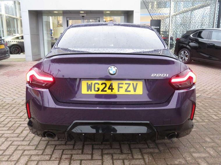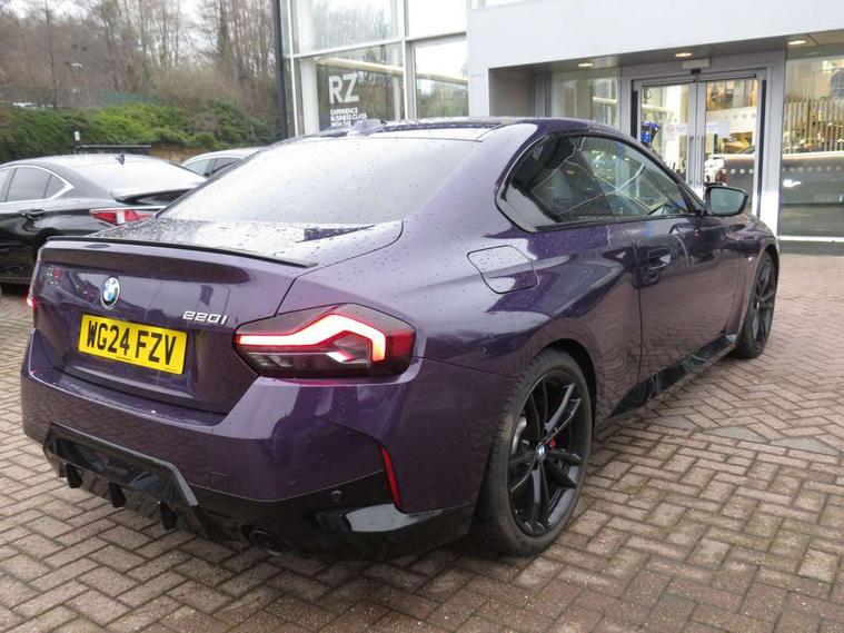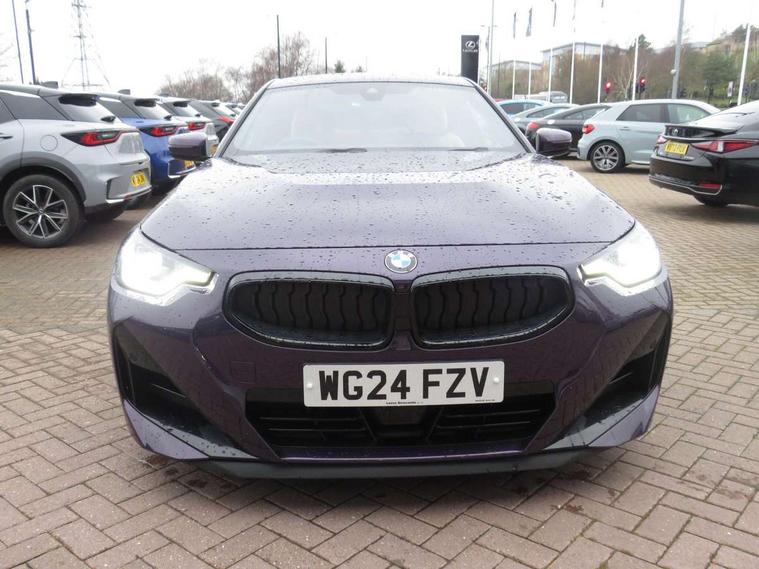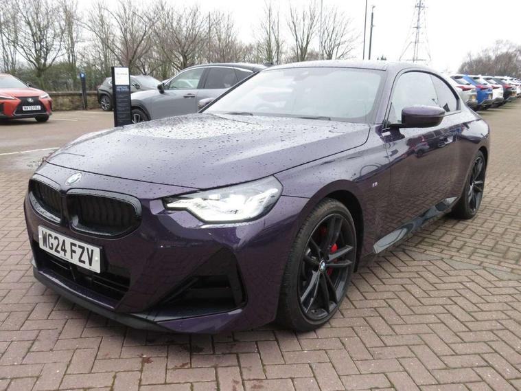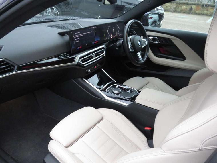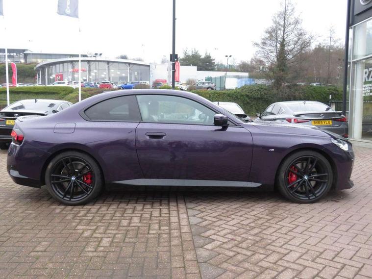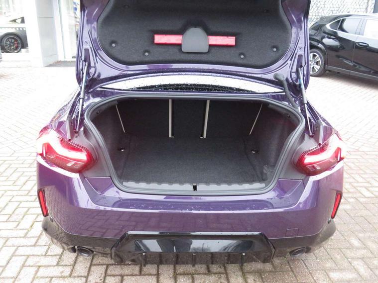 2 USB connections for charging and transferring data, 4G LTE connectivity with hard wired 4G network sim card, Attentiveness assist, Bluetooth with USB, BMW ConnectedDrive online services, BMW Intelligent Personal Assistant, BMW operating system 8 with variable, configurable widgets display information in real time, BMW Teleservices, Check Control warning system for monitoring of lights and door/luggage compartment open warning, Direct selection buttons, Drive off assistant, Eco pro mode, Electric power steering, Front and rear parking sensors, Front/rear Parking distance control, iDrive controller with turn and press function, Integrated owners handbook, Intelligent functions, Live cockpit plus with nav function 12.3" instrument cluster and 14.9" centre display, Oil sensor for level and grade, Optimum shift indicator, Personal Profile, Touch operation on control display, Variable sport steering, Widescreen multi-media display, WiFi interface for wireless connection of mobile terminal devices, Aluminium lightweight construction, Balancer shaft, BMW TwinPower Turbo four-cylinder petrol engine, Double VANOS, Drive performance control with ECO PRO comfort + sport mode, Electronic differential lock, High precision injection, M sport suspension, Petrol Particulate Filter, Sport automatic steptronic transmission with gearshift paddles, manual gearshift time display, launch control, coasting idle ECO PRO/COMFORT modes, Twin scroll turbocharger with Valvetronic, DAB tuner, Acoustic windscreen wipers for reduced driving noise, Adaptive LED Headlights, Automatic windscreen wipers and automatic headlight, Automatically dimming rear view mirror, Body colour door handles flush with door surface, Body colour door mirrors, Body colour front and rear bumpers, Daytime running lights, Electric windows - front and rear, with open/close fingertip control and trap release, Exhaust tailpipes x2 - 90mm in left and right, Fading support, Front and rear bumper system with replaceable deformation elements, Front door sill finishers in black plastic with BMW designation, Front windscreen wipers with integrated washer jets, Green tinted heat protection glazing, High beam assistant, High gloss black sill, bumper trim sides and diffuser insert, High gloss shadowline exterior trim in mirror triangle cover, mirror cover panel, mirror bezel and window border, High level third brake light, Indicators integrated int mirror housing, LED registration plate light, LED technology rear tail lights, brake lights and turn indicators, Lightweight engineering, Model designation on right side of tailgate, One piece kidney grille with hight gloss chrome surround, Rear boot, Rear fog lights, Reversing light in rear light cluster, Shark fin antenna, Single part LED rear lights with smoked glass components, Trailer stabilisation logic, Visible VIN plate, 12V power socket in front centre console with blanking plug, 2 cupholders in front centre console, 2 zone automatic air conditioning, Ambient lighting, Compartment in front of cupholder, Conditioned based service, Driver seat backrest width adjustment, Front and rear side armrests integrated into door trim, Front armrest, Front door pockets, Front head restraints, Front sport seats, Heated front seats, Illuminated glove compartment with separate small compartment, M headliner Anthracite, M sport leather steering wheel, Manually adjustment steering wheel column, Rear seat backrest with manual 40:20:40 split folding, Rear seat centre foldable armrest with integrated cup holder, Single front passenger seat, Storage compartment between rear seats, Storage tray and compartment with cover in centre console, Sun visors with vanity mirrors and insert tab, Through loading system with 40/20/40 split folding 2 rear seat in 2nd row, Two folding rear seat headrests, Velour floor mats, Additional storage compartment pack without USB - 2 Series Coupe, Connected pack professional - 2 Series Coupe, Interior and exterior mirror pack - 2 Series Coupe, M Sport exterior styling aerodynamics pack - 2 Series Coupe, 2 tone horn, Anti lock braking system (ABS) with cornering brake control, Automatic Stability Control (ASC), BMW emergency call, Brake drying, Child seat ISOFIX attachment for the two outer rear seats, Crash sensor activating of airbags, Unlocking doors, hazard warning lights, fuel cut off, interior lighting+activation of safety battery terminal clamp, Deactivation of fuel pump in the event of a crash, Driver and front passenger airbags, Driver and front passenger side airbags, integrated in the door side seat backrest bolsters for all seat variants, Dynamic brake control, Dynamic stability control + (DSC+), Dynamic Traction Control - DTC, Electrically operated hand brake including automatic hold function and automatic release when driving off, Front and rear disc brakes, Head airbags for all 4 outer seats, Manual deactivation of front passenger airbag, Seat belt security check for driver and front passenger, Seatbelt warning, Side impact protection, Three point seat belts on 4 seats including front belt stopper, pyrotechnic belt tensioners and belt force limiters, Tyre pressure sensor, Warning triangle and first aid kit, Alarm system (Thatcham 1) with remote control and electronic engine immobiliser, Central locking switch for all doors, fuel filler cap and luggage compartment, Deadlocking function system to all doors, Drive away locking system on all doors and luggage compartment, Locking wheel bolts, Start/Stop button (illuminated) in centre console with keyless engine start and Auto Start-Stop deactivation button, Two remote control key with integrated key - one button for open and close doors/fuel flap/tailgate and separate button for unlock luggage compartment, BMW mobility tyre sealing system, Electrically powered 12V compressor, Reduced rolling resistance tyres,