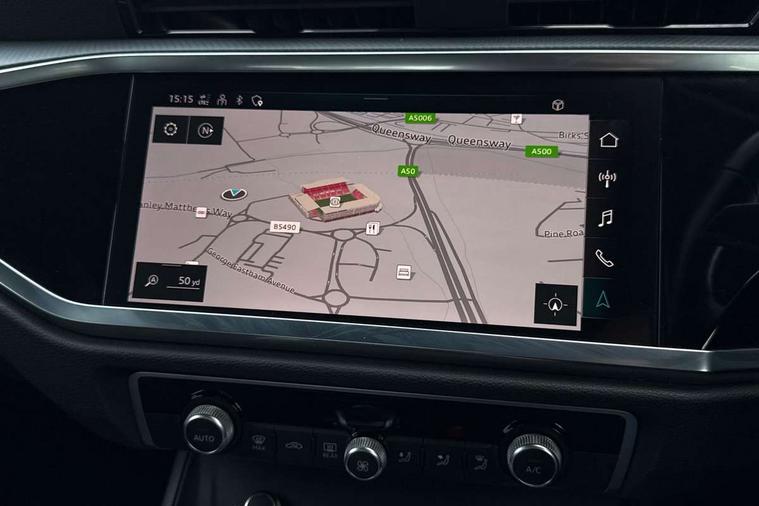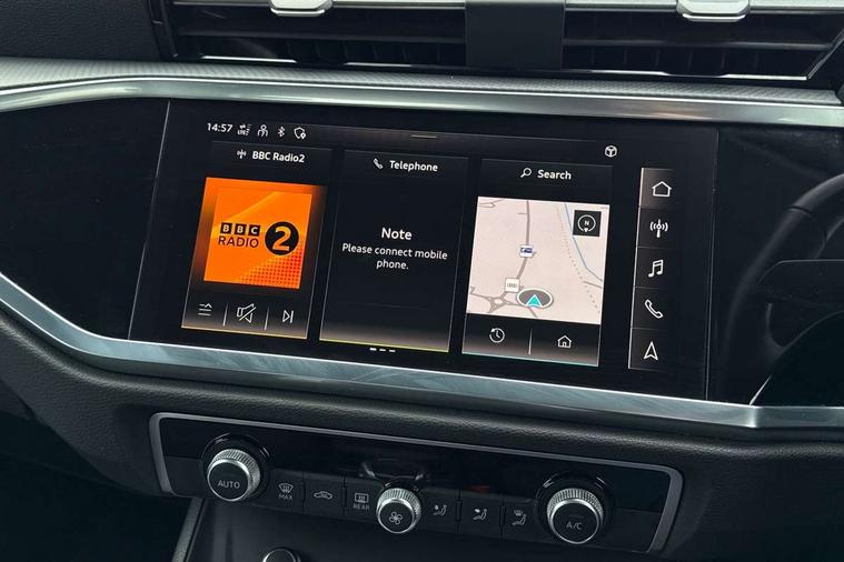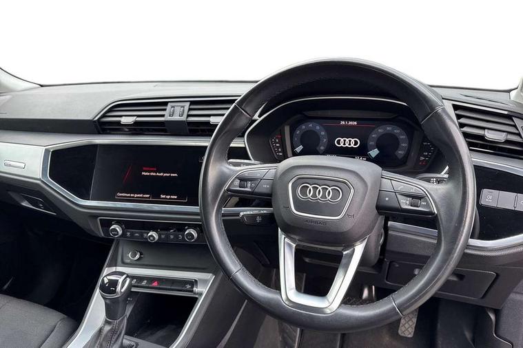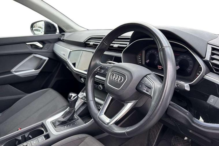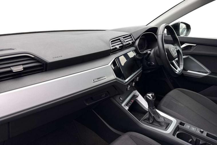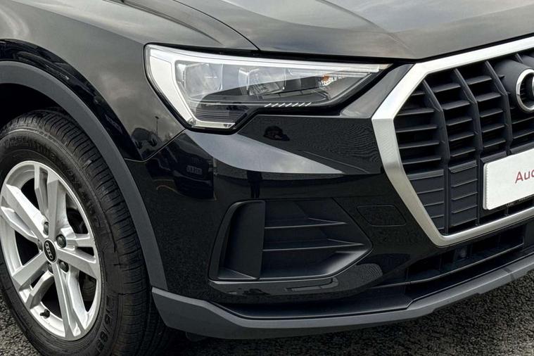 Amazon alexa Integration, Audi drive select, Audi lane departure warning, Audi Virtual Cockpit - 10.25" display, Bluetooth interface, Camera based traffic sign recognition, Legal emergency call, MMI Navigation Plus with high resolution 10.1 inch touchscreen colour display, Power operated tailgate, Progressive steering, Service interval indicator, Smartphone interface includes wireless Apple carplay/Android Auto, Start stop system with recuperation, Voice control system with natural language interaction, Standard suspension, 2 USB-C ports with charge and data functions, 6 passive loudspeakers, DAB digital radio module, Acoustic windscreen, Auto dimming frameless rear view mirror, Black roof rails, Body colour door mirrors, Diffuser in grained anthracite, Electrically folding, adjustable and heated door mirrors with integrated LED side indicators and kerb view function for passenger side, Exterior bumper with wheel arch trims and side sill trims in grained black matt, Front and rear electric windows, Grained radiator protective grille, Halogen rear lights, LED headlights with LED daytime running lights, Rain and light sensors, Rear side wing doors, Rear wiper, Third brake light, Variable front intermittent wipers, 12V socket in rear centre console, 3 seat bench in 2nd row, 3 spoke multi-function leather steering wheel, 40:20:40 folding with manual adjustment for 60:40 forwards/backwards position and backrest angle, Dual zone electronic climate control, Front and rear floor mats, Front and rear headrests, Front and rear roof module including reading lights, Front centre armrest, Glove compartment lighting, Height and reach adjustable steering wheel, ISOFIX child seat mounting for front passenger with airbag deactivation and outer rear seat including top tether attachment point for outer rear seats, Luggage compartment light, Lunar silver cloth headlining, Manual front seats with height adjustment, Single front passenger seat, Stainless steel luggage compartment sill finisher, Non smoking pack - Q3, 3x3 point rear seatbelts, 6 airbags - Driver, front passenger, curtain and side windows, Audi pre-sense front with pedestrain and cyclist recognition, Electrically operated child locks on rear doors, Electromechanical parking brake, Electronic stabilisation control including ABS, ASR and EDL, Front seatbelt reminder, Hill descent control, Hill hold assist, Pre sense basic, Seatbelt monitoring, Tyre pressure warning, Warning triangle and first aid kit, Anti theft alarm, Anti theft wheel bolts, Immobiliser, Remote central locking, Detail dashboard around MMI touch colour display in glass look, black with surround in aluminium look, Micrometallic silver inlay, 17" 5 twin spoke design alloy wheels,