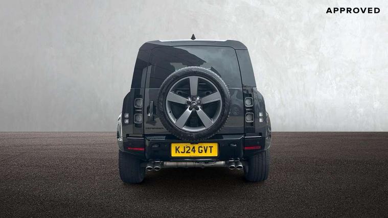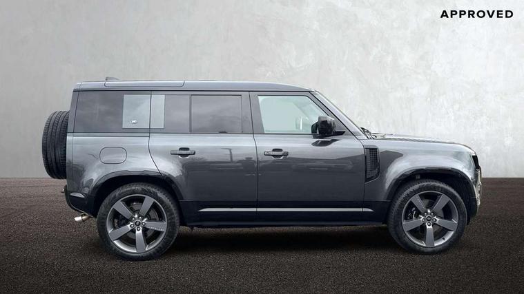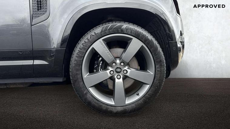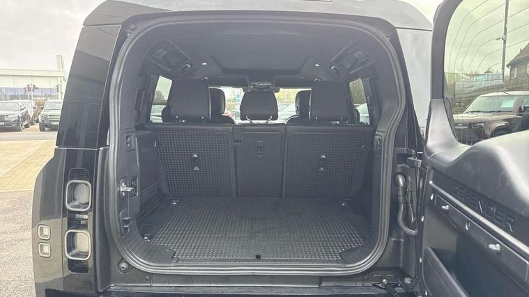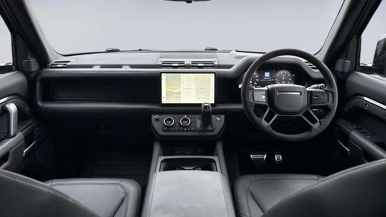 11.4" touchscreen, 360 degree parking aid, 3D Surround Camera with 360 View, 180 Rear View, Front Traffic Detection, Forward Vehicle Guidance, Tow Hitch Assist and clear sight Ground View, Adaptive cruise control, Android Auto, Apple CarPlay, Assisted tailgate with soft close, Blind spot assist, Bluetooth system, Brake pad wear indicator, Clear exit monitor, Connected navigation pro, Driver condition monitor, Electric power assisted steering (EPAS), Garage door opener (Homelink), Head up Display, Interactive driver display, Lane keep assist, Push button start, Rear collision monitor, Rear traffic monitor, Traffic sign recognition with adaptive speed limiter, Trip computer, Wade Sensing, 8 speed automatic transmission, Adaptive dynamics, All terrain progress control, All wheel drive system, Configurable Terrain Response, Electronic active differential with brake torque vectoring, Electronic air suspension, Terrain Response 2 with dynamic program, Twin speed transfer box, DAB Radio (Digital Audio Broadcasting), Pivi pro connected, Advanced tow assist, Automatic headlight levelling, Automatic headlights, Black exposed rear recovery eyes, Centre high mounted stop light, ClearSight interior rear view mirror, Darkened LED tail lights, Electric heated/power fold door mirrors with approach lights and auto dimming driver side, Electric windows with one touch open/close and anti-trap, Electrically deployable towbar, Follow me home lighting, Front fog lights, Headlamp power wash, Heated rear window with timer, Heated washer jets, Heated windscreen, Illuminated metal treadplates with V8 branding, Less roof rack or roof rails, Matrix LED headlights with signature DRL, Privacy glass, Puddle lights, Quad outboard mounted exhaust pipes, Rain sensing windscreen wipers, Rear fog lights, Rear side wing doors, Rear wiper, Side hinged tailgate, Signature graphic (with interior storage), Sliding panoramic roof, Solar attenuating windscreen, Trailer stability assist, V8 badge, 12V power socket in loadspace, 14 way heated and cooled electric adjustable memory front seats with 4 way manual headrests, 3 seat bench in 2nd row, 40:20:40 folding, heated rear seats with centre armrest, Air quality sensor, Alpine lights, Bright metal pedals, Cabin Air Purification plus, Configurable cabin lighting, Domestic plug socket, Durable rubber cabin flooring, Durable rubber loadspace flooring, Ebony morzine headlining, Electric cabin pre conditioning, Electric reach + rake adjustable steering column, Extended leather upgrade, Footwell lights, Front centre console refrigerator compartment, Front passenger isofix child seat attachment, Heated steering wheel, Leather gearshift, Loadspace cover, Loadspace Hook, Multifunction steering wheel, Overhead stowage for sunglasses, Premium cabin lighting, Rear headrests, Rear ISOFIX, Rear reading lights, Satin chrome gearshift paddles, Single front passenger seat, Standard seat configuration, Storage glovebox, Suedecloth steering wheel, Sunvisors with illuminated vanity mirrors, Three-zone Climate Control with Rear Cooling Assist, Twin front cupholders with cover, Online pack with data plan - Defender, 5 x 3 point seatbelts, ABS, Brake hold function, Cornering brake control (CBC), Cross car beam in satin black powder coat brushed finish, Customer configurable autolock, DSC - Dynamic Stability Control, EBD - Electronic brakeforce distribution, Electric parking brake (EPB), Emergency brake assist, Emergency braking, ESP + traction control, Front airbags with passenger seat occupant detector, HDC - Hill descent control, Hill launch assist, Low traction launch, Power operated child locks, Remote for (e-Call, Optimised assistance call, InControl app, Climate, beep and flash and door), RSC - Roll stability control, Seat belt reminder, TPMS (Tyre pressure monitoring system), Activity key, Alarm, Immobiliser, Intrusion sensor, Keyless entry, Locking wheel nuts, Robustec veneer,