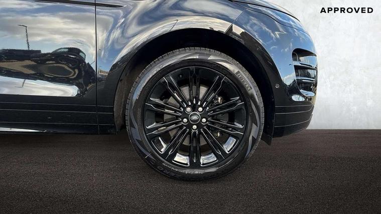 11.4" touch screen, 3D 360 degree surround camera with wade sensing, Adaptive cruise control, Android Auto, Apple car play, Blind spot assist, Bluetooth connectivity, Brake pad wear indicator warning light, Driver condition monitor, eCall emergency system, Eco mode, Electronic power assisted steering (EPAS), Front and rear parking sensors with auto brake, InControl remote, Interactive driver display, Land Rover InControl apps, Lane keep assist, Pivi pro connected includes diamond pivi variant, smart settings, connected navigation pro, nuance speech licence, Powered tailgate/boot lid, Rear collision monitor, Rear traffic monitor, Tailgate, Traffic sign recognition with adaptive speed limiter, Voice control system, Wireless device charging, All terrain progress control, Diesel exhaust fluid (DEF) large tank, Efficient Driveline, Large fuel tank, Terrain Response 2, Digital Audio Broadcast radio-DAB, Steering wheel mounted controls, Acoustic laminated windscreen, Auto headlights, Auto high beam assist, Automatic headlight levelling, Electric windows with one touch open/close and anti trap, Flush deployable exterior door handles, Front and rear recovery eyes, Heated rear window with timer, Heated washer jets, Heated windscreen, LED headlights with signature DRL and LED tail Lights, Power fold, auto-dimming, heated door mirrors with approach lights and auto dimming driver side, Rain sensing windscreen wipers, Rear animated directional indicators, Rear fog lights, Rear side wing doors, Rear wiper, Side repeater indicators in mirror, Tailgate spoiler, Third brake light, Winter wiper park position, 12 way driver memory and 10 way passenger electric front seats with 2 way manual headrest + 4 way lumbar support, 40:20:40 split folding rear seats with centre headrest and armrest, Ambient interior lighting, Bright metal pedals, Carpet mats, Chrome tread plates with range rover branding Includes stainless steel loadspace scuff plate with etched graphic, Customer configurable single point entry, Front and rear cupholders, Heated front seats, Heated steering wheel, Isofix system on outer rear seats, Manually adjustable steering column, Overhead lighting console, Overhead stowage for sunglasses, Passive front head restraints, Rear air vents, Rear head restraints, Satin chrome gearshift paddles, SE Grained leather upholstery, Single passenger seat, Standard steering wheel with Moonlight Bezel, Sunvisors with illuminated vanity mirrors, Twin sliding front centre armrest, Power socket pack 2 - Evoque, 3 rear 3 point seatbelts, Anti-lock braking system (ABS), Brake hold function, Customer configurable autolock, DSC - Dynamic Stability Control, Electronic brake force distribution, Electronic parking brake, Electronic traction control, Emergency braking, Front and rear seatbelt reminder, Hill descent control, Hill launch assist, Low traction launch, Occupant protection assist, Passenger seat occupant detector, Power operated child locks, Roll stability control, Six airbags - Driver and passenger airbags/driver knee airbag/front side airbag and curtain airbags, Torque vectoring brake, Tyre pressure monitoring system, Alarm, Immobiliser, Intrusion sensor, Keyless entry, Locking wheel nuts, All season tyres,