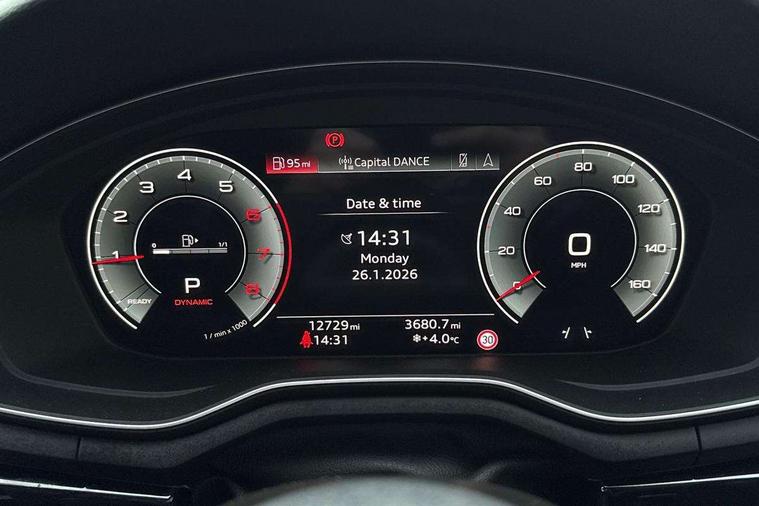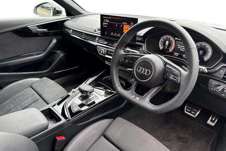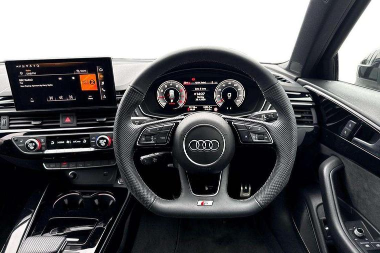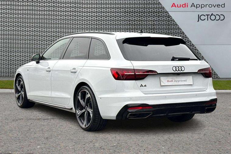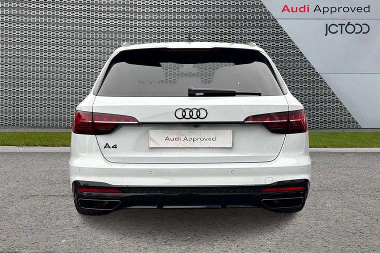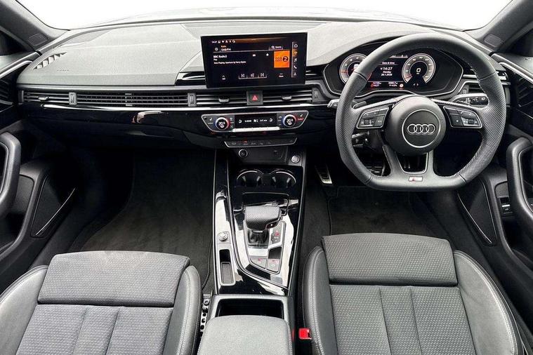 Audi connect safety and service (e-call), Audi drive select, Audi smartphone interface, Audi virtual cockpit, Automatic start-stop system with coasting functionality and efficiency programme, Bluetooth interface, Camera based traffic sign recognition, Electromechanical power steering, Email, calendar and text messages displayed via MMI, Front and rear parking sensors, Lane departure warning, MMI Navigation plus with MMI touch includes 10.1" high resolution colour MMI display, 3D map, Power operated tailgate, Rear view camera, Voice control system, 54 litre fuel tank, Sports suspension lowered by 23mm, 2 USB charging ports, 8 passive loudspeakers, DAB digital radio reception, Audi beam uses LEDs to project the audi logo onto the ground as you exit your A4, Auto dimming rear view mirror, Black Audi rings and black badging (with removed engine badging), Body colour door handles, Body colour front spoiler lip, Body colour side sill trim, Electric adjustable/heated/folding door mirrors with auto dimming, Exhaust tailpipes in dark chrome, Grained matt black side air inlets with matt aluminium silver inlay, High beam assistant, High gloss black B pillar trims and triangular rear door trim, LED headlights with LED rear lights + dynamic rear indicators + headlight adjustment and high beam, turning light + LED daytime running lights, LED third brake light, Privacy glass, Rain and light sensors, Rear diffuser in matt black with trim strip in matt aluminium silver, Rear side wing doors, Rear wiper, RS4 rear spoiler in body colour, S Line roof edge spoiler, Sport front and rear bumpers with side skirts, Variable intermittent front wash/wipe, Windscreen with acoustic glazing, 4 way electric lumbar support for driver and front passenger, 40/20/40 split folding 3 rear seat bench in 3 parts with rear centre armrest, Black carpets, Black cloth headlining, Black perforated leather gearknob, Contrast stitching on seats, steering wheel and gear lever gaiter, Deluxe 3 zone electronic climate control, Electric load area cover, Front and rear head restraints, Front centre armrest, Heated front seats, Illuminated door sill trims with S logo, ISOFIX child seat mounting and top tether, Manual seat adjustment, Single front passenger seat, Stainless steel pedals and foot rest, Black styling pack - A4 Avant, LED Interior light pack - A4/S4, 3 rear seatbelts, 6 airbags - Driver, front passenger, curtain and side windows, Attention and drowsiness assist, Electronic Stabilisation Control (ESC) including ABS, ASR and EDL, Hill hold assist, Multi collision brake assist, Pop-up bonnet for pedestrian protection, Pre sense city, Rear door child safety locks, Seatbelt monitoring, Warning triangle and first aid kit, Anti theft alarm, Anti theft wheel bolts, Central locking, Keyless Go, Piano black finish inlay, Tool kit, Tyre repair kit,
