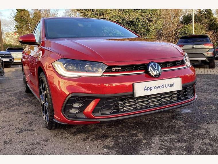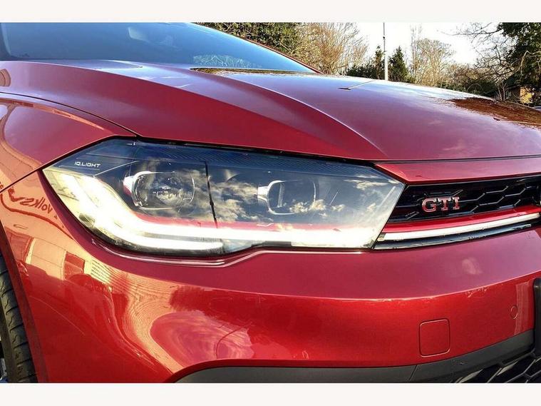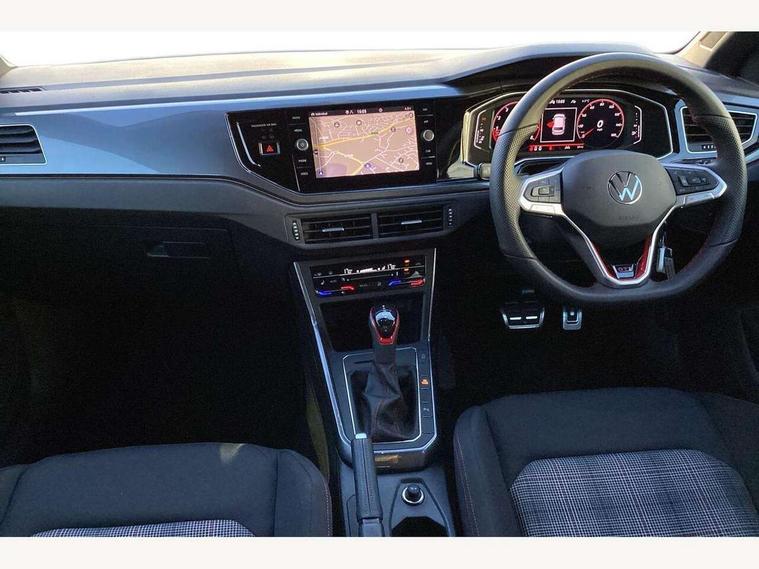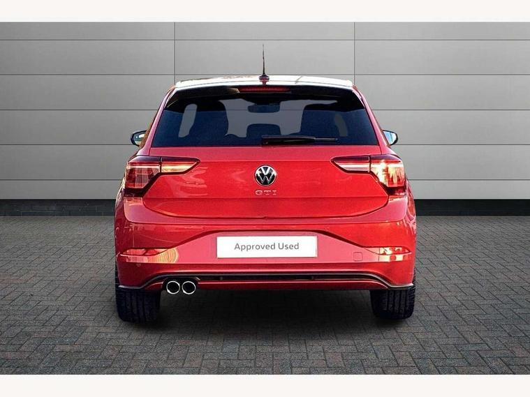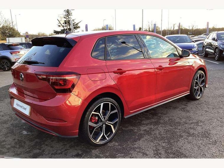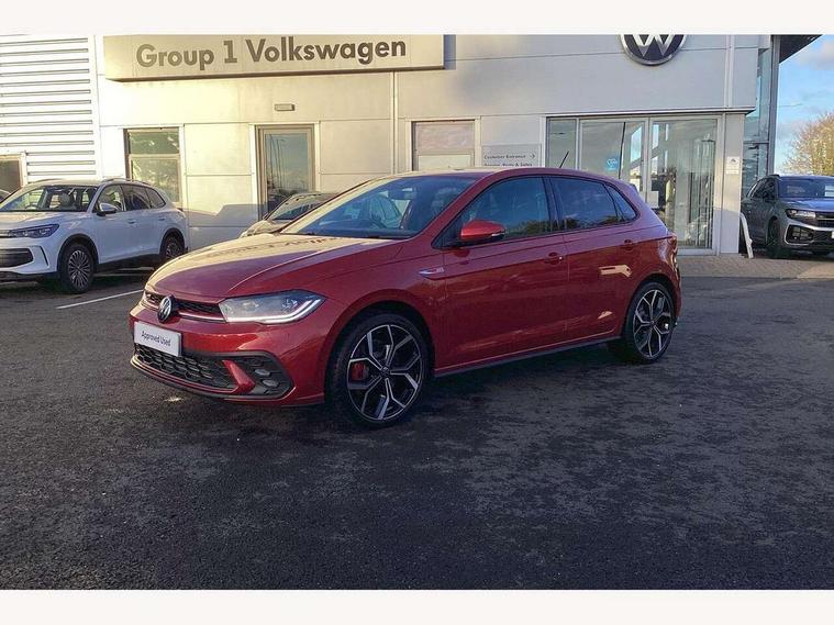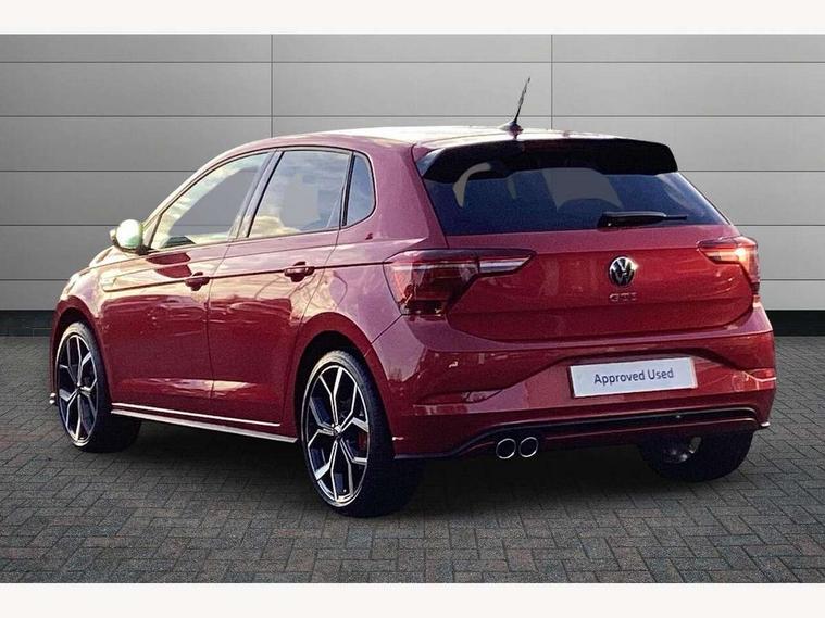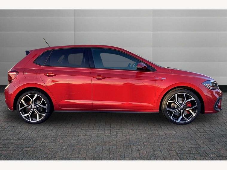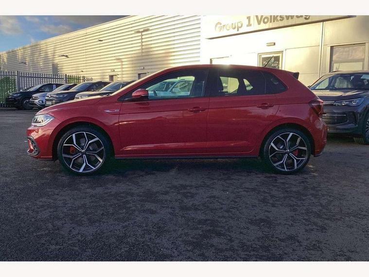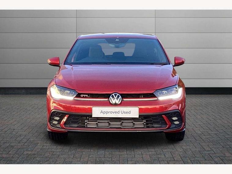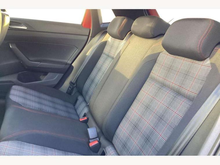 Adaptive cruise control with follow-to-stop and speed limiter, Advanced driver attention and drowsiness monitor, Bluetooth mobile phone interface, Digital Cockpit Pro with 10.25" Display, Dynamic road sign display, Eco mode, Emergency call service, Multifunction camera, Power assisted speed sensitive steering, Preparation for We connect and We connect plus, Speedo and rev counter, electronic odometer, trip, service interval display and fuel gauge, Travel Assist - Lane keeping system and traffic jam assist, Travel assist including emergency assist, Trip computer, Warning signal and warning light for front and rear seatbelts not fastened, Washer fluid level indicator, Wireless app connect, Adaptive chassis control, Front wheel drive, Heavy duty rear axle, Rear shock absorpion sports version, Sports select suspension lowered by 15mm, Start-stop system with battery regeneration (recuperation - energy recovery during braking), DAB Digital radio, Diversity antenna for FM reception, Body colour bumpers, Body colour door handles, Electric front windows, Front scuff plates in aluminium with GTI logo, Heat insulating glass windscreen, Power folding adjustable/heated exterior mirrors and front passenger exterior mirror lowering function, Rain sensor, Rear electric windows, Rear fog light, Rear side wing doors, Rear windscreen washer and wiper with interval delay, Sport bumpers with air intakes with honeycomb structure, Third brake light, Twin chrome exhaust tailpipes, 12V power socket in centre console, 2 USB-C ports in the front, 2 USB-C charging sockets on the center console in the rear, 3 rear head restraints, 60/40 split folding rear seat and rear seat bench not split, Air care climatronic air conditoning system with active combination filter and 2-zone temperature control, Black roof lining, Carpet mats, front and rear, Chrome plated radiator grille inserts, air vent surrounds and light switch surrounds, Door and side trim panel, Driver and front passenger seat height adjustment, Driver/passenger sunvisors with illuminated vanity mirrors, Front centre armrest, Front footwell illumination, Front seat backrest storage pockets, GTI sports gearshift knob in aluminium leather, Handbrake lever handle in leather, Headliner in recycled material, Isofix child seat preparation easy-fit (for two outer rear seats, and front passenger seat) compatible with I-size, LED interior light with switch off delay and dimmer, 2 reading lights front and rear, Luggage compartment cover, Luggage compartment floor, Luggage compartment lighting, Lumbar adjustment for front seats, Single front passenger seat, Stainless steel pedals, Standard pedal cluster, Three spoke leather wrapped multifunction sports steering wheel with shifting paddles, IQ LED matrix headlights pack - Polo, Light and sight pack - Polo GTI, 3 point height adj front seatbelts + pretensioners, 3x3 point rear seatbelts, ABS, Driver and front passenger airbag with front passenger airbag deactivation, Drivers and front passengers safety optimised head restraints, ESC (Electronic stability control) + EDL (Electronic Differntial lock) and ASR (Traction control), Extended and predictive pedestrian/ cyclist protection, Front and rear disc brakes with red brake calipers, Front curtain and side airbags with center airbag, Hill hold control, Manual child lock in rear doors, Two tone horn, Tyre pressure loss indicator, Alarm with interior protection, Anti-theft alarm system with interior monitoring, backup horn, and towing protection, Anti-theft wheel bolts, Electronic engine immobiliser, Chrome applications on rotary light, mirror adjustment, window regulator switches, outlet with frame in black, Low rolling resistance tyres,