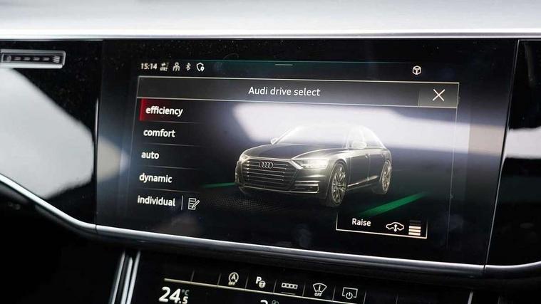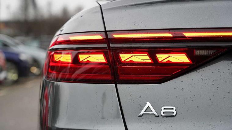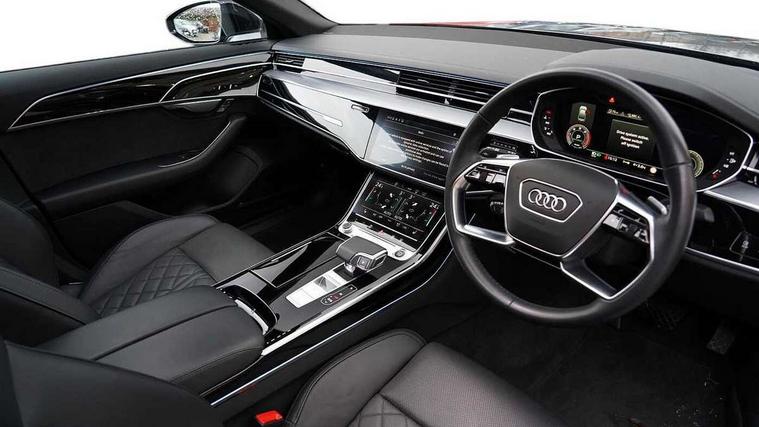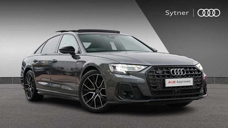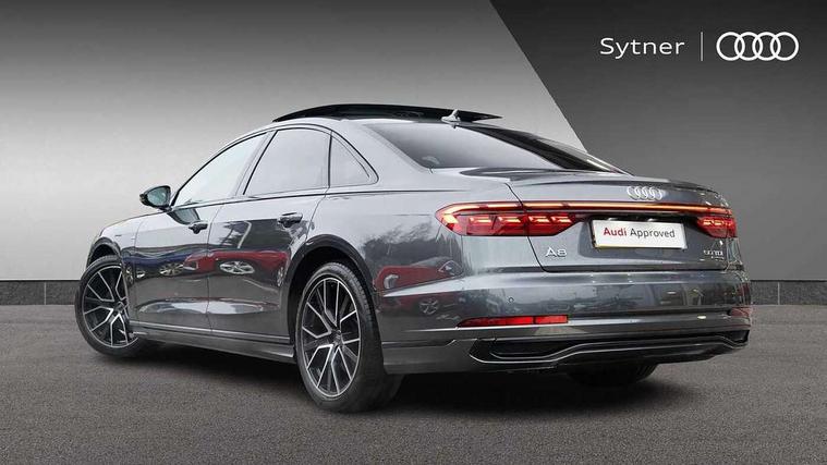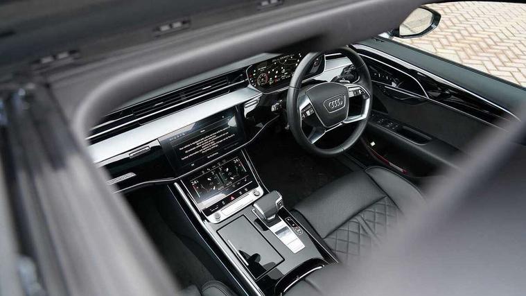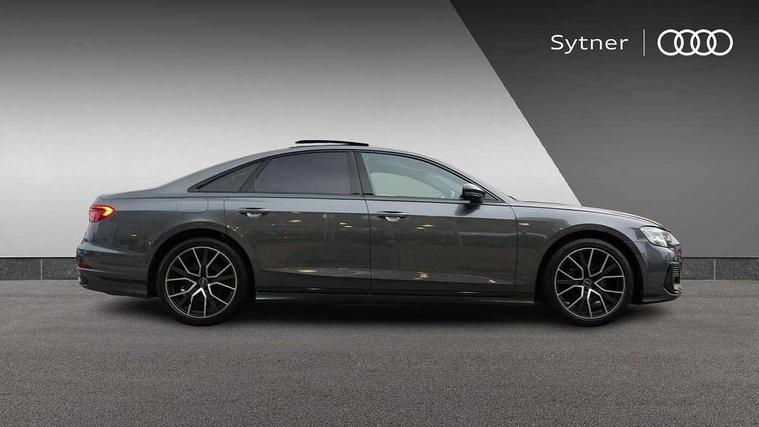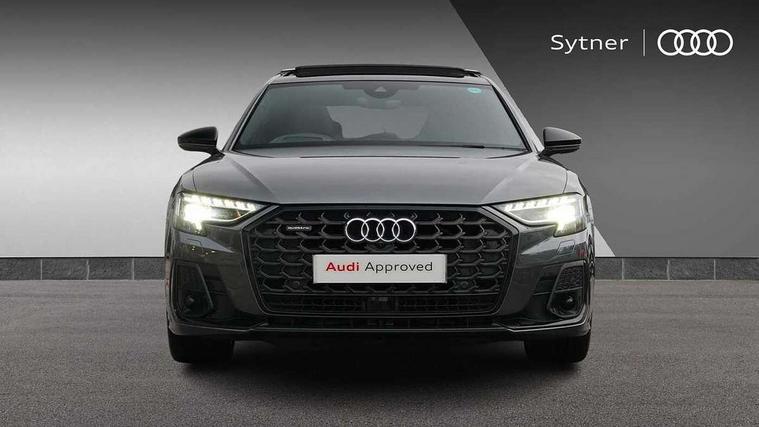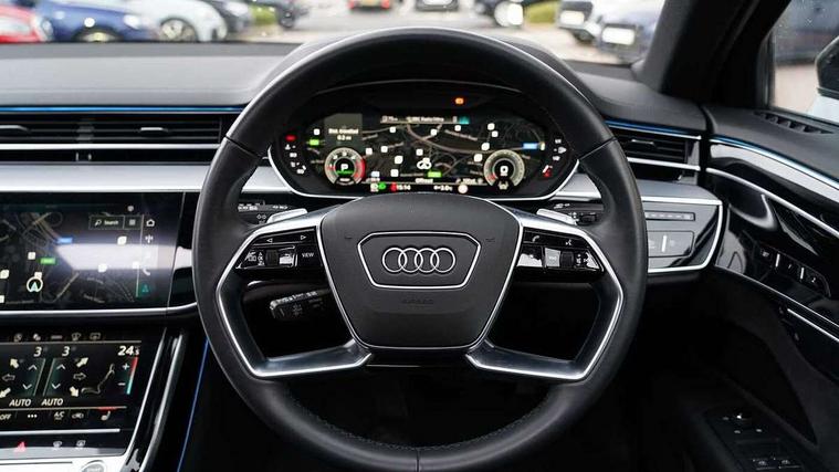 'Lights On' Reminder warning buzzer, 360 degree camera with top view, Adaptive cruise control with cruise assist, emergency assist, efficiency assist, swerve assist, turn assist and speed limiter, Audi connect safety and service (e-call), Audi drive select, Audi phone box with wireless charging, Audi virtual cockpit, Audi wireless smartphone interface, Bluetooth interface, Camera based traffic sign recognition, Convenience key, Dynamic all wheel steering, Head up Display, MMI navigation plus with MMI touch + Twin touch screens with haptic feedback, Operating buttons in black, glass look with haptic feedback including extended aluminium look, Parking assist plus with remote parking, Power door closure, Power operated tailgate, Rear central control unit, Remote fuel filler release, Service interval indicator, 24 litre AdBlue tank, 48V Mild hybrid technology, 8 speed transmission with hill hold assist, 82 litre fuel tank, Adaptive air suspension, Diesel particulate filter, Quattro all wheel drive with self locking centre differential, Audi music interface, DAB digital radio module, DVD System, MMI radio plus, USB connection, USB ports with charging function in the rear, Acoustic double glazing, Adaptive windscreen wipers with integrated washer jets, Audi Beam with Vorsprung illuminated text, Audi space frame, Auto dimming rear view mirror, Body colour bumpers, Body colour door handles, Body colour side protection with aluminium trim strips, Digital matrix LED headlights with highbeam assist, static cornering light, all weather lights, automatic dynamic headlight range control, Dynamic front and rear indicators, Electric front windows, Electric rear windows with isolation switch, Electrically adjustable heated folding + automatically dimming exterior mirrors with memory function and integrated LED indicators, Headlight cleaning system, Heat insulating glass in side and rear windows, Heat insulating glass windscreen, Heated rear window, Heated windscreen washer jets, LED brake lights, LED daytime running lights, OLED rear lights with specific rear light signature 3, Privacy glass, Rear boot, Rear side wing doors, Side skirts, Third brake light, Two part panoramic glass sunroof, 4 zone control automatic air conditioning, Centre console with cupholders, Comfort centre armrest, Comfort rear headrests, Door armrest with storage, Door pockets with bottle holder, Driver and front passenger side sunvisors with illuminated vanity mirrors, Dust/pollen filters, Electric front seats with memory function, Electric sunblinds for rear window and rear door windows, Front floor mats, Glove compartment cooling, Heated front seats, Heated rear seats, Height/reach electric steering column with easy exit function, Isofix child seat mounting points on outer rear seats, Leather gearknob, Massage and ventilation function for front seats, Passenger footwell storage net, Roof mounted sunglasses holder, Single front passenger seat, Valcona leather upholstery with front sports seats in diamond quilted, Air quality Pack - A8, Black exterior styling pack - A8, Chrome exterior pack - A8, City assist pack - A8, Dinamica microfibre black headlining pack - A8, Extended leather pack - A8, Extended LED Interior multi coloured light pack - A8, 3 point seatbelts on all rear seats, ABS/EBD, Active front headrest system, ASR traction control, Audi pre sense basic, Audi pre sense front, Driver/Front Passenger airbags, EDL traction control, Electromechanical parking brake, ESP, Extended pedestrian protection measures, Front and rear side airbags with head airbag system, Front brake discs, callipers painted black, Front passenger airbag deactivation, Rear brake discs, callipers painted black, Rear child proof door locks, Seatbelt reminder + electric contact in buckle + advanced safety equipment, Tyre pressure loss indicator, Warning triangle and first aid kit, Anti theft alarm tow away protection, Anti-theft wheel bolts and wheel loosening detection, Remote central locking, Dark matt brushed aluminium lower inlays, Piano black finish upper inlays,