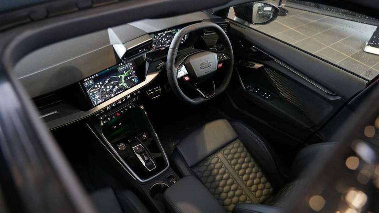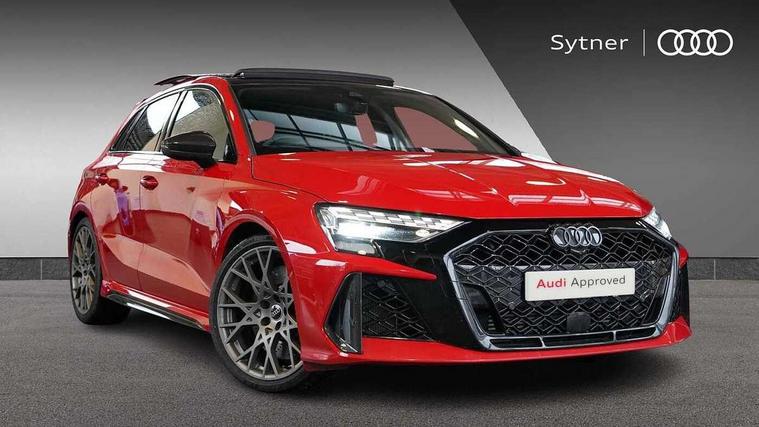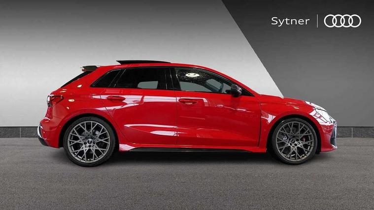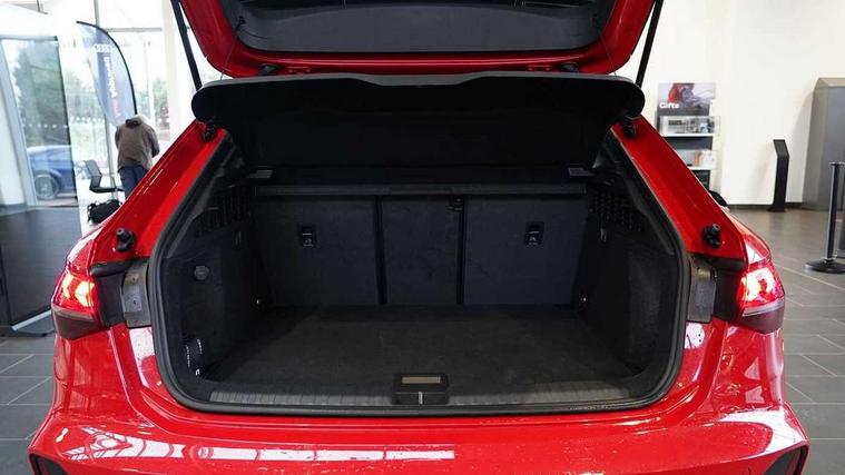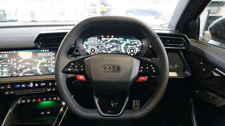 Adjustable speed limiter, Audi drive select comfort, auto, dynamic and efficiency, Audi smartphone interface with app store includes wireless Apple carplay, Android auto and Amazon alexa integration, Audi virtual cockpit plus with RS specific design and 12.3" display with additional graphic display options, Automatic start/stop system with recuperation, Bluetooth interface, Camera based traffic sign recognition, Collision avoidance assistant, Distraction and Fatigue warning, e-Call (emergency call), Lane departure warning system, MMI Navigation Plus with high resolution 10.1" colour touch screen display, Park Assist with parking system Plus, Progressive steering, RS specific driving modes - RS Individual, RS Performance and RS Torque rear, Voice control system with natural language interaction, Adaptive suspension with audi drive select, Increase of top speed to 174 mph, Quattro permanent four wheel drive, Audi Phonebox light with wireless charging, DAB Digital radio, USB ports with charging function in the rear, Audi beam LED projection of RS logo on ground as you exit, Auto dimming frameless rear view mirror, Automatic dynamic range control, Carbon door mirror housings, Carbon fibre engine cover, Dipped beam, main beam, position light and turning light, Electrically adjustable/heated/folding/auto dimming door mirrors with integrated LED indications + kerb view function for passenger side, Exterior model badging, Front electric windows, Heat insulating glass windscreen, LED 3rd brake light, LED brake lights, LED daytime running x3, LED rear number plate lights, LED reverse light, LED tail lights, Light and rain sensors, Privacy glass - dark tinted rear window, rear door and side windows, Rear electric windows, Rear side wing doors, Rear wiper, Roof edge spoiler in carbon, RS dual branch exhaust system with two chrome plated oval tailpipe trims, 12V socket and storage compartment in front centre console, 3 seat bench in 2nd row, 3 Spoke flat top and bottomed black leather multi function steering and gear shift paddles, 3-zone deluxe automatic air conditioning, 40/20/40 split folding rear seat bench, Black cloth headlining, Front and rear headrests, Front centre armrest, Front door sill trims with RS 3 logo, Front sports seats RS embossed logo, Front/rear floor mats, Heated front seats, Height and reach adjustable steering wheel, Manual boot compartment lid, Rear centre armrest with cupholder, Seat side bolsters, Single front passenger seat, Stainless steel pedals and front footrest in black, Vanadium look - Interior door handles, Door trim, power latching, Air vents, window controls, mirror adjust, rear door lock, Selector lever in centre console, Black Styling plus package - RS3, Extended ambient lighting package Pro with Multi-coloured contour lighting of instrument panel - RS3, RS exterior features pack in carbon and gloss black - RS3, RS sport suspension pack - RS3, Storage package - RS3 Sportback, 3x3 point rear seat belts, Driver and front passenger airbag with passenger airbag deactivation, Electronic Stabilisation Control (ESC) including ABS, ASR and EDL, First aid kit with warning triangle and 2 safety vests, Hill hold assist, Pre-sense front with pedestrian and cyclist detection, RS steel brakes, Seatbelt monitoring, Tyre pressure loss indicator, Anti theft alarm, Anti-theft wheel bolts, Electronically operated child locks, Inlays in carbon atlas structure, Tyre repair kit,