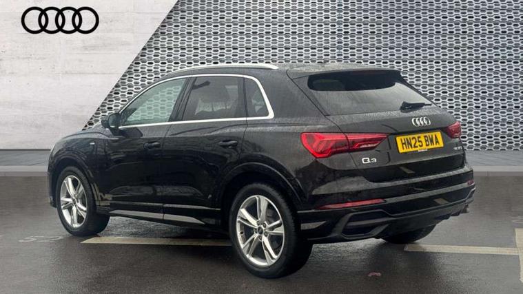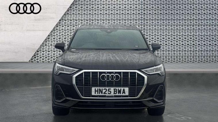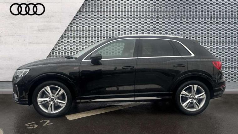 Amazon alexa Integration, Audi connect safety and service, Audi drive select, Audi lane departure warning, Audi Virtual Cockpit - 10.25" display, Bluetooth interface, Camera based traffic sign recognition, Distraction and Fatigue warning, Legal emergency call, MMI Navigation Plus with high resolution 10.1 inch touchscreen colour display, Power operated tailgate, Progressive steering, Service interval indicator, Smartphone interface includes wireless Apple carplay/Android Auto, Start stop system with recuperation, Voice control system with natural language interaction, Sports suspension, 2 USB-C ports with charge and data functions, 6 passive loudspeakers, DAB digital radio module, Acoustic windscreen, Aluminium roof rails, Aluminium window trim, Anthracite black radiator grille, Auto dimming door mirrors, Auto dimming frameless rear view mirror, Body colour front spoiler blade, Electrically folding, adjustable and heated door mirrors with integrated LED side indicators and kerb view function for passenger side, Front and rear electric windows, Front fog lights, Front side air inlets in matt platinum grey, Grille vertical bars in aluminium silver/Matt, High gloss black finish B and C pillars, LED Dynamic rear indicators, LED headlights with LED daytime running lights, LED rear lights, LED third brake light, Privacy glass dark tinted rear and rear-side windows (from B-pillar backwards), Rain and light sensors, Rear diffuser grille in grained matt black, Rear diffuser strip in matt anthracite black, Rear side wing doors, Rear wiper, S line badges on front wings, S line front and rear bumpers and side skirts in contrasting Manhattan grey paint finish, Side skirt insert in matt Platinium grey, Variable front intermittent wipers, 12V socket in rear centre console, 3 seat bench in 2nd row, 3 spoke leather multifunction steering wheel features S badging and grips in perforated leather with contrast stitching, 40:20:40 folding with manual adjustment for 60:40 forwards/backwards position and backrest angle, Adjustable rear seat bench/backrest with centre armrest and cupholder, Black cloth headlining, Dual zone electronic climate control, Electric lumbar support, Front and rear black floor mats with contrast stitching in rock grey, Front and rear headrests, Front centre armrest, Height and reach adjustable steering wheel, Illuminated door sill trims with S logo, ISOFIX child seat mounting for front passenger with airbag deactivation and outer rear seat including top tether attachment point for outer rear seats, Manual front seats with height adjustment, Perforated leather gearknob, Single front passenger seat, Stainless steel luggage compartment sill finisher, Stainless steel pedals, Twin leather upholstery with front sport seats + S embossing, Non smoking pack - Q3, 3x3 point rear seatbelts, 6 airbags - Driver, front passenger, curtain and side windows, Audi pre-sense front with pedestrain and cyclist recognition, Electrically operated child locks on rear doors, Electromechanical parking brake, Electronic stabilisation control including ABS, ASR and EDL, Front seatbelt reminder, Hill descent control, Hill hold assist, Pre sense basic, Seatbelt monitoring, Tyre pressure warning, Warning triangle and first aid kit, Anti theft wheel bolts, Immobiliser, Remote central locking, Thatcham approved category 1 anti theft alarm, Aluminium look interior elements, Dark matt brushed aluminium inlay, Detail dashboard around MMI touch colour display in glass look, black with surround in aluminium look, Leatherette door armrest,