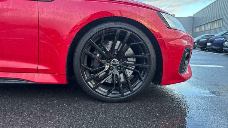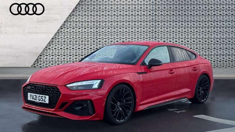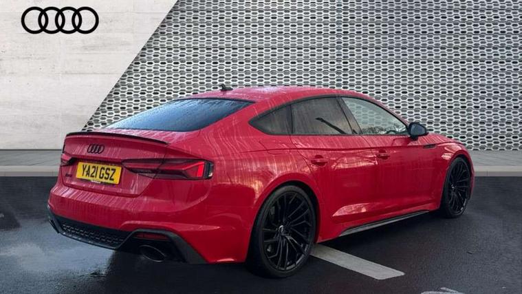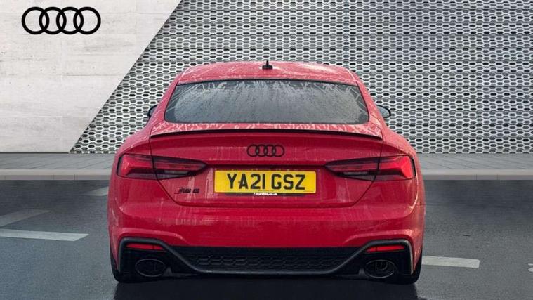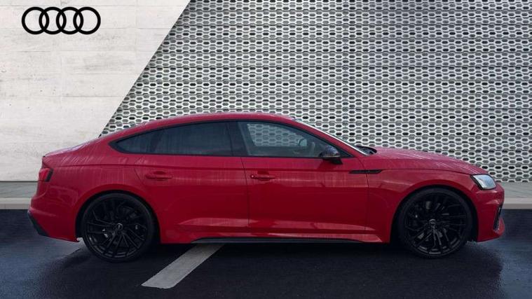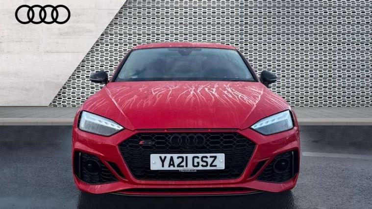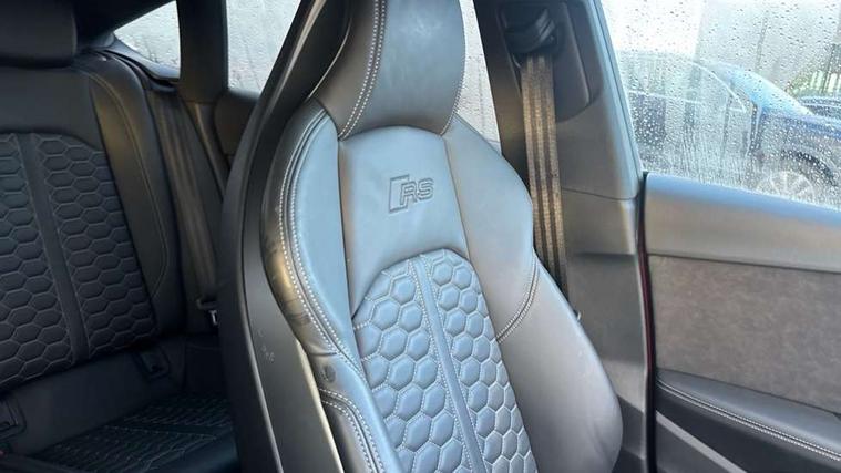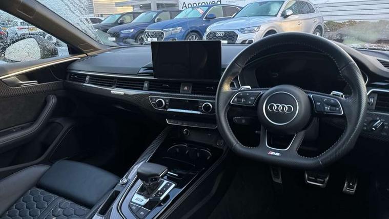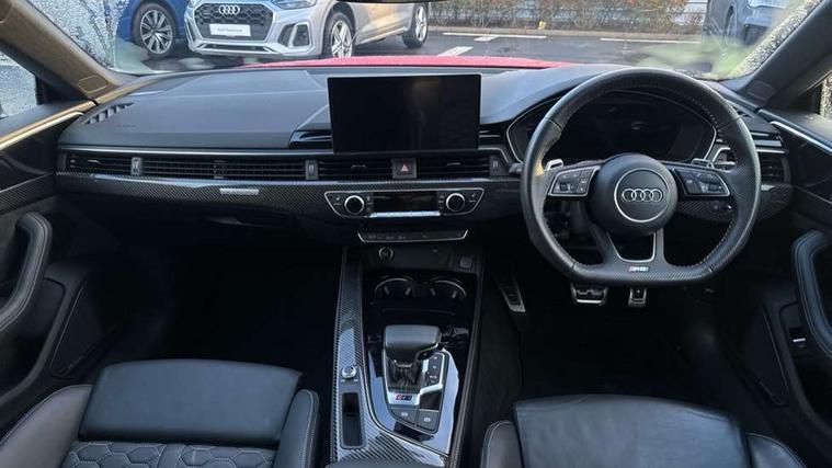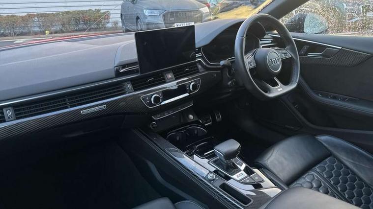 Carbon twill inlays, Carbon black styling pack - RS5, LED Interior light pack - RS5, 20" 5 Segment spoke Evo style design audi sport alloy wheels in glossy black, Tyre repair kit, Anti theft alarm system, Anti theft wheel bolts, Immobiliser, Keyless Go, Remote control key with RS emblem, Audi sound system, DAB digital radio reception, 3x3 point rear seatbelts, 6 airbags - Driver, front passenger, curtain and side airbags, Electromechanical parking brake, Electronic Stabilisation Control (ESC) including ABS, ASR and EDL, Front passenger airbag deactivation, Height adjustable front seatbelts, Hill hold assist, Multi collision brake assist, Pop-up bonnet for pedestrian protection, Pre sense city, RS Model enhanced braking system, Seatbelt monitoring, Tyre pressure warning, Warning triangle and first aid kit, Audi Beam uses LEDs to project the Audi logo, Audi matrix LED headlights with LED rear lights + dynamic front and rear indicators, Audi rings and lettering glossy black, Auto dimming rear view mirror, Body colour door handles, Electric front windows, Electric rear windows, Electrically folding, adjustable and heated door mirrors with integrated LED side indicators and kerb view function for passenger side, Exterior mirror housing in high gloss black, High beam assistant, Larger singleframe grill, LED daytime running lights, Privacy glass with rear acoustic glazing, Rain and light sensors, RS bumper with quattro lettering, RS5 badges on grille, the front wing panels and rear, RS5 dual branch chrome tailpipes with left and right oval pipes, Windscreen with acoustic glazing, 2 x USB charging port with aux input socket, 3 spoke flat bottomed high multi-function leather sport steering wheel with RS badging, 40/20/40 split folding 3 seater rear bench seat, Aluminium shift paddles, Black cloth headlining, Deluxe 3 zone electronic climate control, Electrically adjustable front seats, Fine Nappa leather upholstery, Front centre armrest, Front head restraints, Front/rear floor mats, Heated front seats, Illuminated door sill trims with RS5 logo, ISOFIX child seat mounting and top tether, Leather door armrests and knee pad, Pneumatic massage function, Rear head restraints, RS Specific perforated leather gear lever knob with contrast stitching, RS Super Sports seats with contrast honeycomb stitching, Stainless steel pedals, Tool kit, Audi connect safety and service (e-call), Audi parking system plus with front and rear sensors, Audi phone box with wireless charging, Audi side assist, Audi smartphone interface, Audi Virtual Cockpit with RS specific design and 12.3" display, Automatic start-stop system with coasting functionality and efficiency programme, Bluetooth interface, Electromechanical power steering, Email, calendar and text messages displayed via MMI, MMI Navigation plus with MMI touch includes 10.1" high resolution colour MMI display, 3D map, Rear view camera, RS Audi drive select, RS drive modes on steering wheel, Service interval indicator, Voice control system, Quattro sports differential,