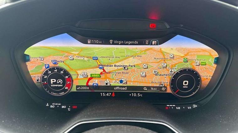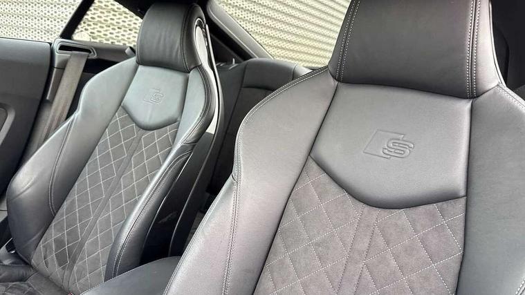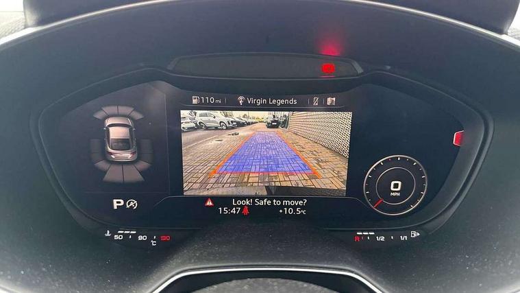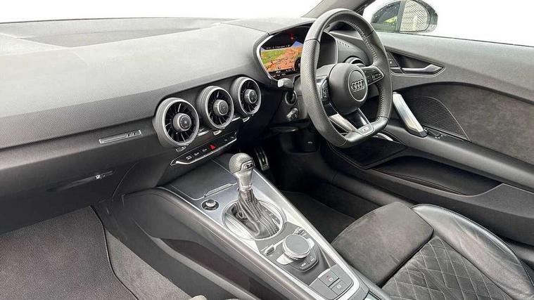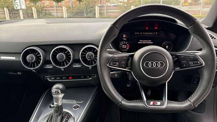 Audi drive select with 4 Pre configured modes, Audi virtual cockpit - 12.3" high-resolution LCD display with fully customisable instrument cluster, Cruise control + speed limiter, MMI touch panel, Mobile phone preparation with bluetooth interface, Progressive power assisted steering, Service interval indicator, Start/Stop system with energy recuperation, TP memo, S line sports suspension, AM/FM radio, Audi music interface, Bluetooth audio streaming, DAB Digital radio, MMI Radio with CD player and SD/XC card slot, Auto dimming rear view mirror, Auto headlight range control, Black chrome tailpipe, Black door mirrors, Dark privacy glass from B-pillar backwards, Dynamic rear indicators, Electric folding door mirrors, Electric front windows, Front fog lights, Green tinted heat insulating glass, Headlight wash system, LED daytime running lights, LED headlights with LED rear lights + dynamic rear indicators, Light and rain sensors, Sunband for windscreen, 12V socket, 3 spoke flat bottomed high multi-function leather sport steering wheel with gearshift paddles, 4 way electric lumbar support for driver and front passenger, Air conditioning, Black headlining, Extended aluminium look with stainless steel pedals, Front centre armrest, Front super sports seats, Heated front seats, Height adjustable driver's seat, Height adjustable front head restraints, Height/reach adjust steering wheel, ISOFIX child seat mounting for front passenger seat with airbag deactivation, Perforated leather gearknob, Rear head restraints, Rear top tether child seat ISOFIX attachment, Split folding rear seat, Top tether anchor plate for isofix child seat, Black styling pack - TT, Non smoking pack - TT/TT RS, 3 point front seat belts, ABS, ASR traction control, Brake energy regeneration, Curtain airbags, Driver and front passenger airbag with front passenger airbag deactivation, EDL traction control, Electromechanical parking brake, ESP, First aid kit, Front side airbags, Head airbags, Hill hold assist, Seatbelt warning, Tyre pressure warning, Warning triangle, Anti theft alarm, Anti theft wheel bolts, Immobiliser, Keyless Go, Remote central locking, Matt brushed aluminium inlays, Tool kit, Tyre repair kit,