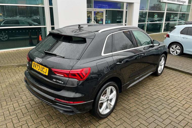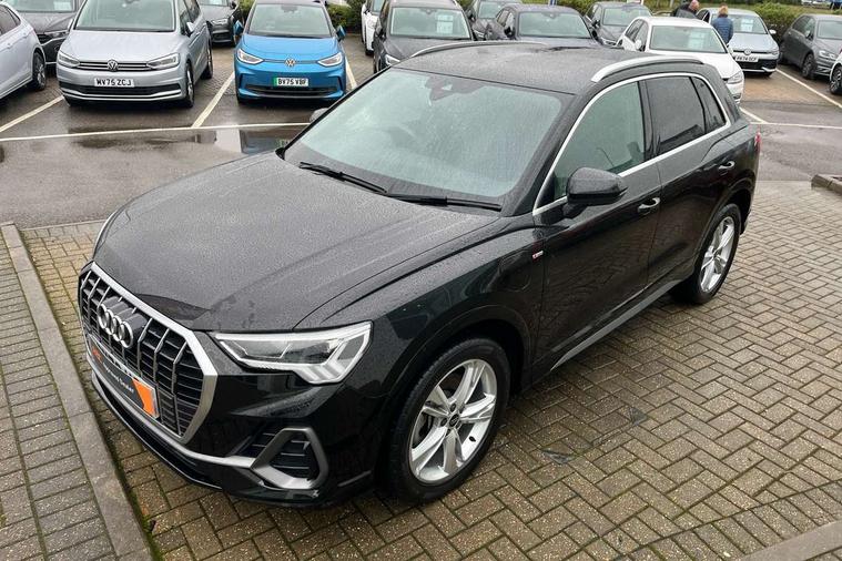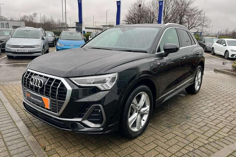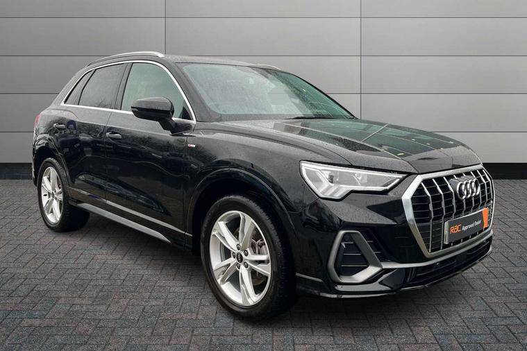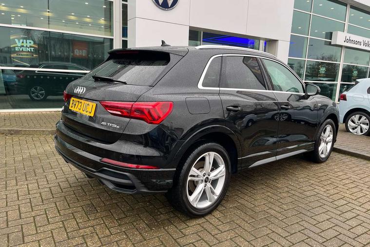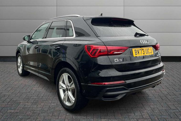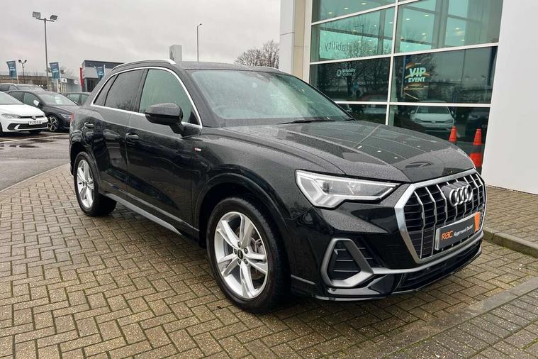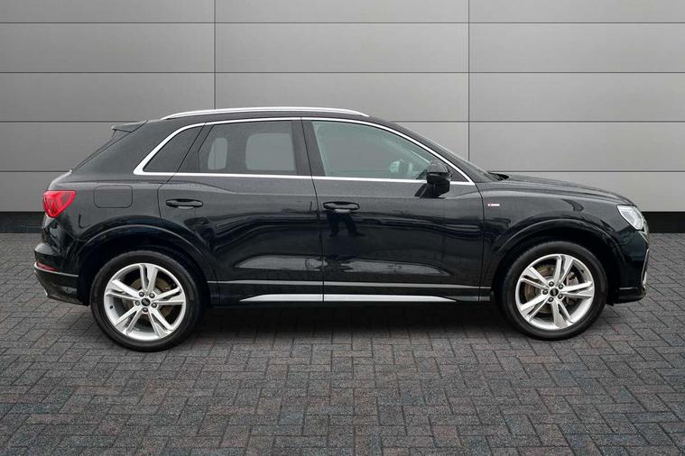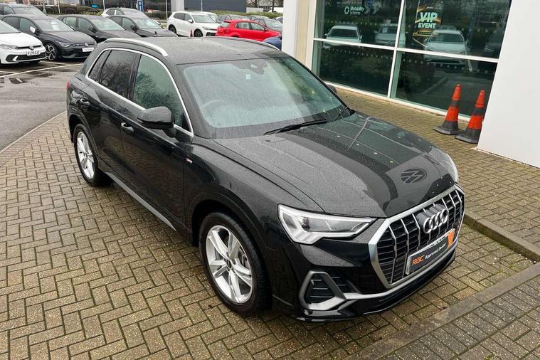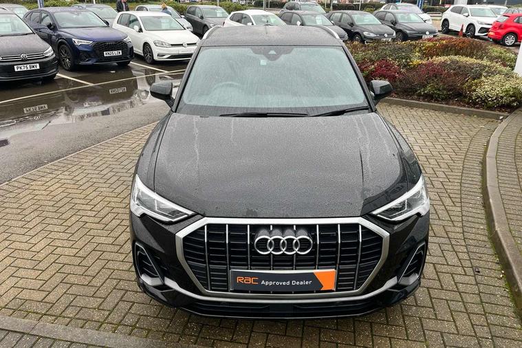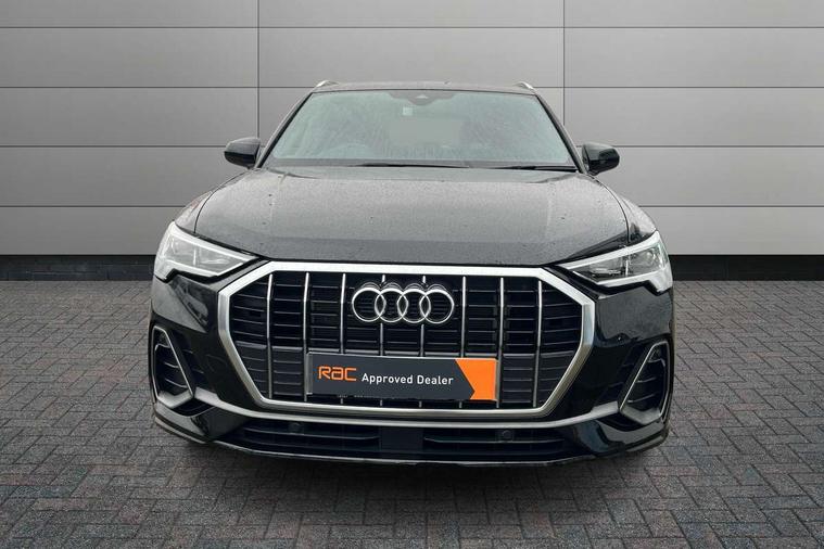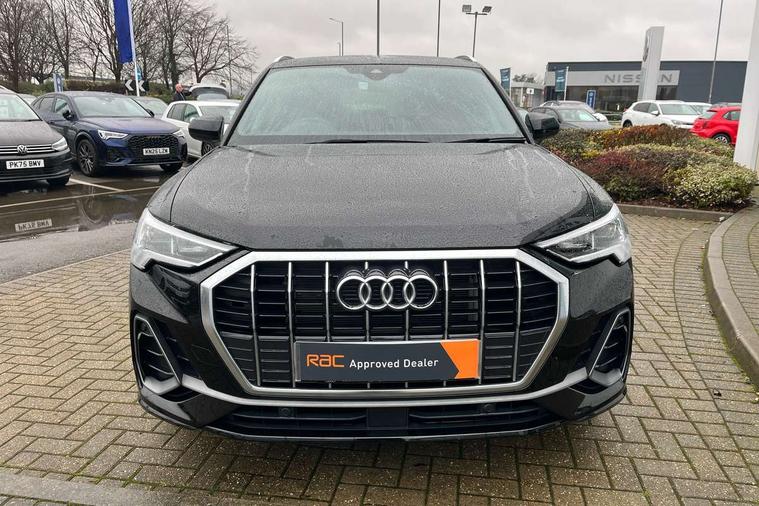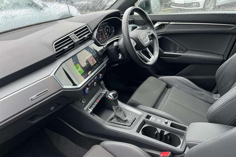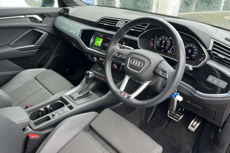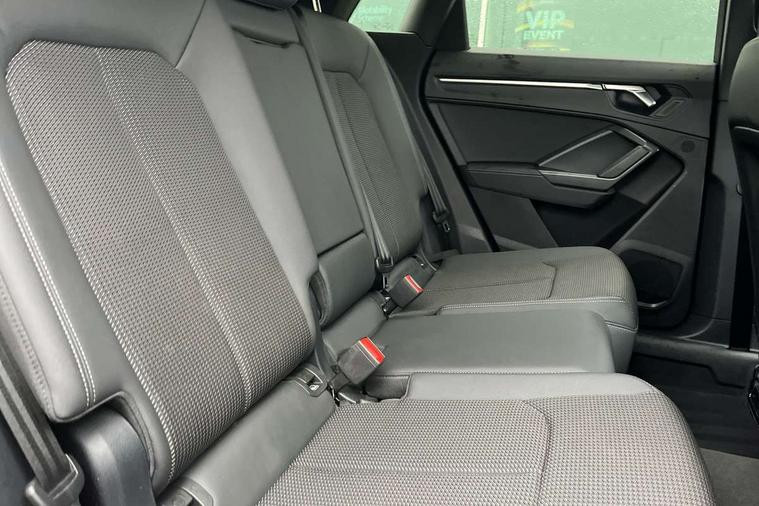 Amazon alexa Integration, Audi drive select, Audi lane departure warning, Audi smartphone interface includes wireless Apple carplay/Android Auto, Audi Virtual Cockpit - 10.25" display, Bluetooth interface, Camera based traffic sign recognition, Legal emergency call, MMI Navigation Plus with high resolution 10.1 inch touchscreen colour display, Power operated tailgate, Progressive steering, Service interval indicator, Start stop system with recuperation, Voice control system with natural language interaction, 3 pin 10 amp domestic charging cable, 3.6 kw On-board charger, Type 2 mode 3 32 amp charging cable, Type 2 socket for AC charging, 2 USB-C ports with charge and data functions, 6 passive loudspeakers, DAB digital radio module, Acoustic windscreen, Aluminium roof rails, Aluminium window trim, Anthracite black radiator grille, Auto dimming frameless rear view mirror, Body colour front spoiler blade, Body coloured bumpers, Electrically folding, adjustable and heated door mirrors with integrated LED side indicators and kerb view function for passenger side, Front and rear electric windows, Front fog lights, Front side air inlets in matt platinum grey, Grille vertical bars in aluminium silver/Matt, High gloss black finish B and C pillars, LED Dynamic rear indicators, LED headlights with LED daytime running lights, LED rear lights, LED third brake light, Privacy glass dark tinted rear and rear-side windows (from B-pillar backwards), Rain and light sensors, Rear diffuser grille in grained matt black, Rear diffuser strip in matt anthracite black, Rear side wing doors, Rear wiper, S line badges on front wings, S Line front and rear bumpers, Side skirt insert in matt Platinium grey, Variable front intermittent wipers, 12V socket in rear centre console, 3 seat bench in 2nd row, 3 spoke leather multifunction steering wheel features S badging and grips in perforated leather with contrast stitching, 40:20:40 folding with manual adjustment for 60:40 forwards/backwards position and backrest angle, Adjustable rear seat bench/backrest with centre armrest and cupholder, Black cloth headlining, Dual zone electronic climate control, Front and rear black floor mats with contrast stitching in rock grey, Front and rear headrests, Front and rear roof module including reading lights, Front centre armrest, Glove compartment lighting, Height and reach adjustable steering wheel, Illuminated door sill trims with S logo, ISOFIX child seat mounting for front passenger with airbag deactivation and outer rear seat including top tether attachment point for outer rear seats, Luggage compartment light, Manual front seats with height adjustment, Perforated leather gearknob, Single front passenger seat, Stainless steel luggage compartment sill finisher, Stainless steel pedals, Tool kit, Ambient lighting pack - Q3, Non smoking pack - Q3, 3x3 point rear seatbelts, 6 airbags - Driver, front passenger, curtain and side windows, Audi pre-sense front with pedestrain and cyclist recognition, Electrically operated child locks on rear doors, Electromechanical parking brake, Electronic stabilisation control including ABS, ASR and EDL, Front seatbelt reminder, Hill descent control, Hill hold assist, Pre sense basic, Seatbelt monitoring, Tyre pressure warning, Warning triangle and first aid kit, Anti theft alarm, Anti theft wheel bolts, Immobiliser, Remote central locking, Aluminium look interior elements, Dark matt brushed aluminium inlay, Detail dashboard around MMI touch colour display in glass look, black with surround in aluminium look, Leatherette door armrest, Tyre repair kit,