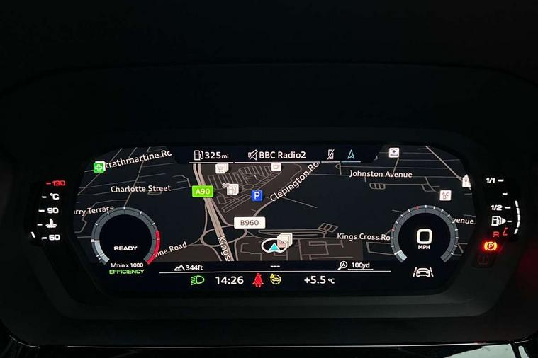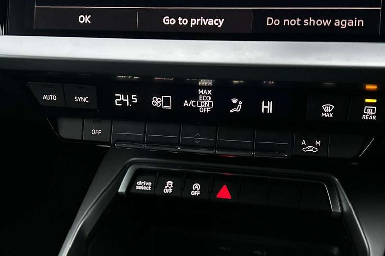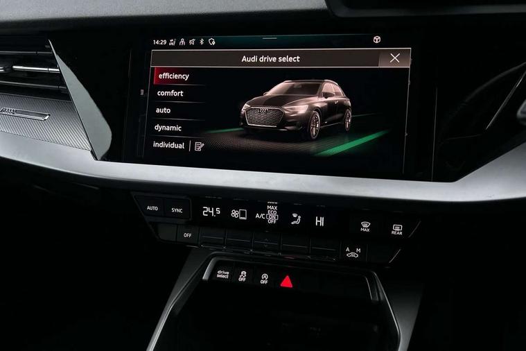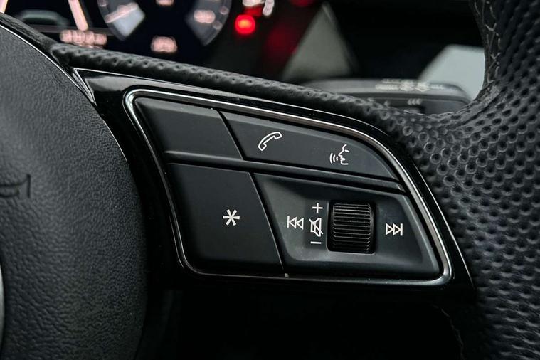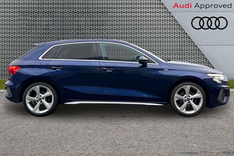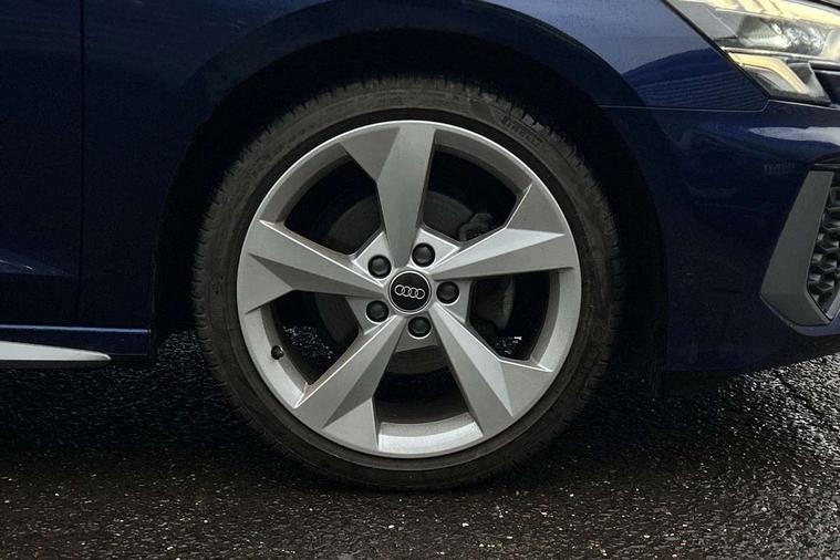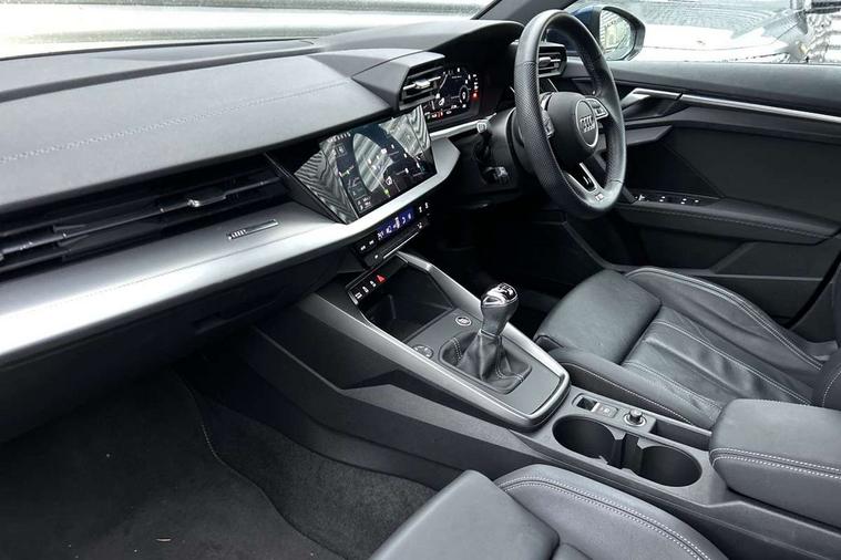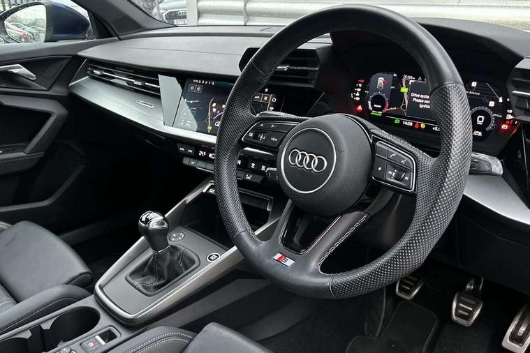Audi drive select (Auto, Comfort, Dynamic, Efficiency and Individual), Audi smartphone interface, Audi Virtual Cockpit - 10.25" digital and colour instrument cluster, Automatic start/stop system with recuperation, Bluetooth interface, Collision avoidance assistant, Cruise control, e-Call (emergency call), Electromechanical power speed sensitive steering, Lane departure warning system, MMI Navigation Plus with high resolution 10.1" colour touch screen display, Rear parking sensors, Service indicator, Trip computer, Voice control system with natural language interaction, 2xUSB-C connection with data and charging functions, 6 passive loudspeakers, DAB Digital radio, 3rd brake light, Acoustic glass windscreen, Aluminium window trim, Auto dimming frameless rear view mirror, Electrically adjustable/heated/folding/auto dimming door mirrors with integrated LED indications + kerb view function for passenger side, Front electric windows, Illuminated aluminium inserts front door sills with S logo, LED daytime running lights, LED headlights with LED rear lights and dynamic rear indicators, Light and rain sensors, Privacy glass - dark tinted rear window, rear door and side windows, Rear electric windows, Rear side air outlets in grained matt black, Rear side wing doors, Rear wiper, S line bumpers, S roof spoiler, 12V socket and storage compartment in front centre console, 3 seat bench in 2nd row, 40/20/40 split folding rear seat bench with cupholder, Black cloth headlining, Dual zone electronic climate control, Front and rear centre armrest in leather, Front and rear headrests, Front/rear floor mats, Height and reach adjustable steering wheel, Illuminated vanity mirror, Interior lighting - glove compartment light and right hand side, Luggage compartment floor covering, Manual boot compartment lid, Manually adjustable front seats, Seat side bolsters, Single front passenger seat, Stainless steel pedals and front footrest in black, Twin leather upholstery with front sports seats S embossed logo, Aluminium interior elements pack - A3 Sportback, S line styling pack - A3 Sportback, 3x3 point rear seat belts, Audi pre sense front, Driver and front passenger airbag with passenger airbag deactivation, Electronic Stabilisation Control (ESC) including ABS, ASR and EDL, First aid kit with warning triangle and 2 safety vests, Front side airbags with head airbags and interaction airbag, Pre-sense front with pedestrian and cyclist detection, Seatbelt monitoring, Tyre pressure loss indicator, Anti theft alarm, Anti-theft wheel bolts, Immobiliser, Manual child locks, Remote control central locking, Accent surfaces in the dashboard and centre console in platinum grey silk effect paint finish, Dark spectrum aluminium inlays,